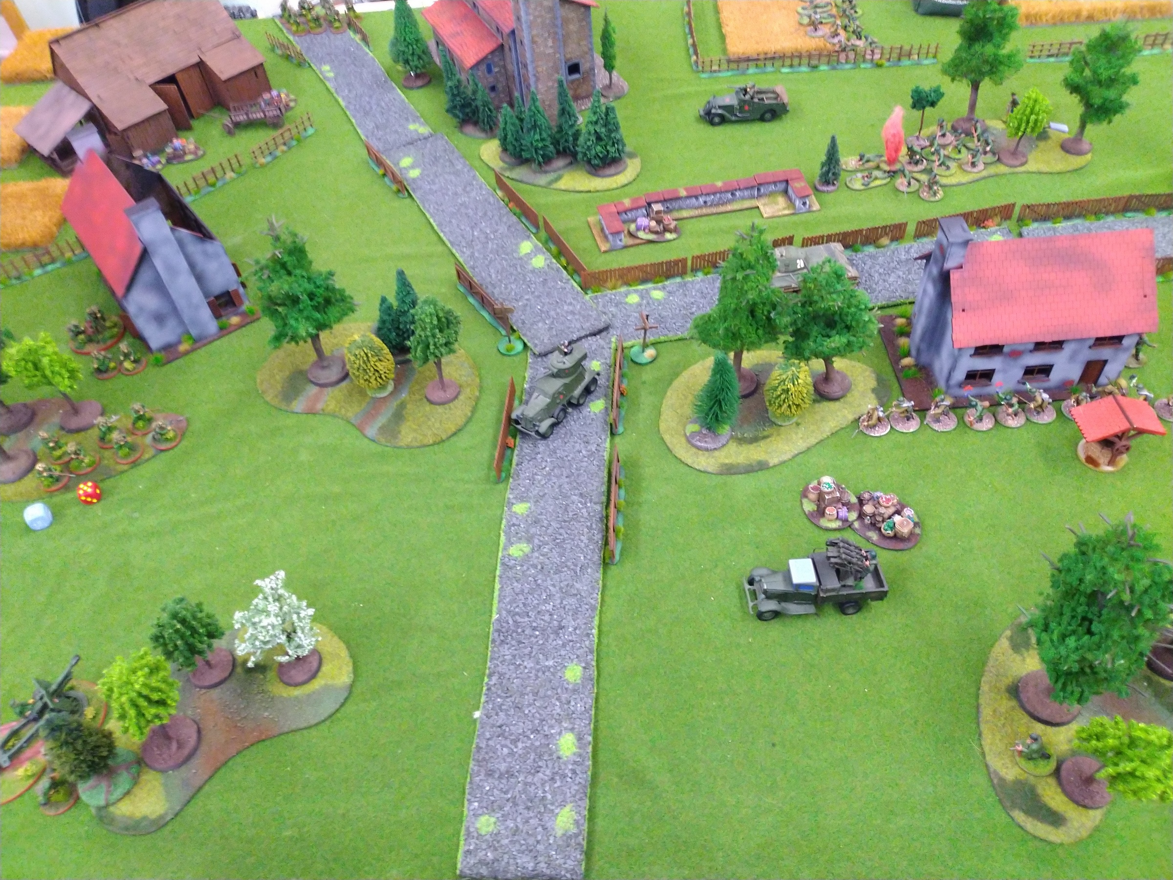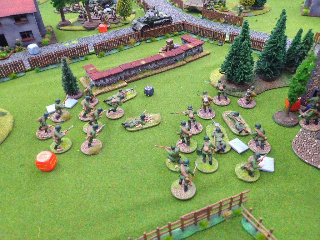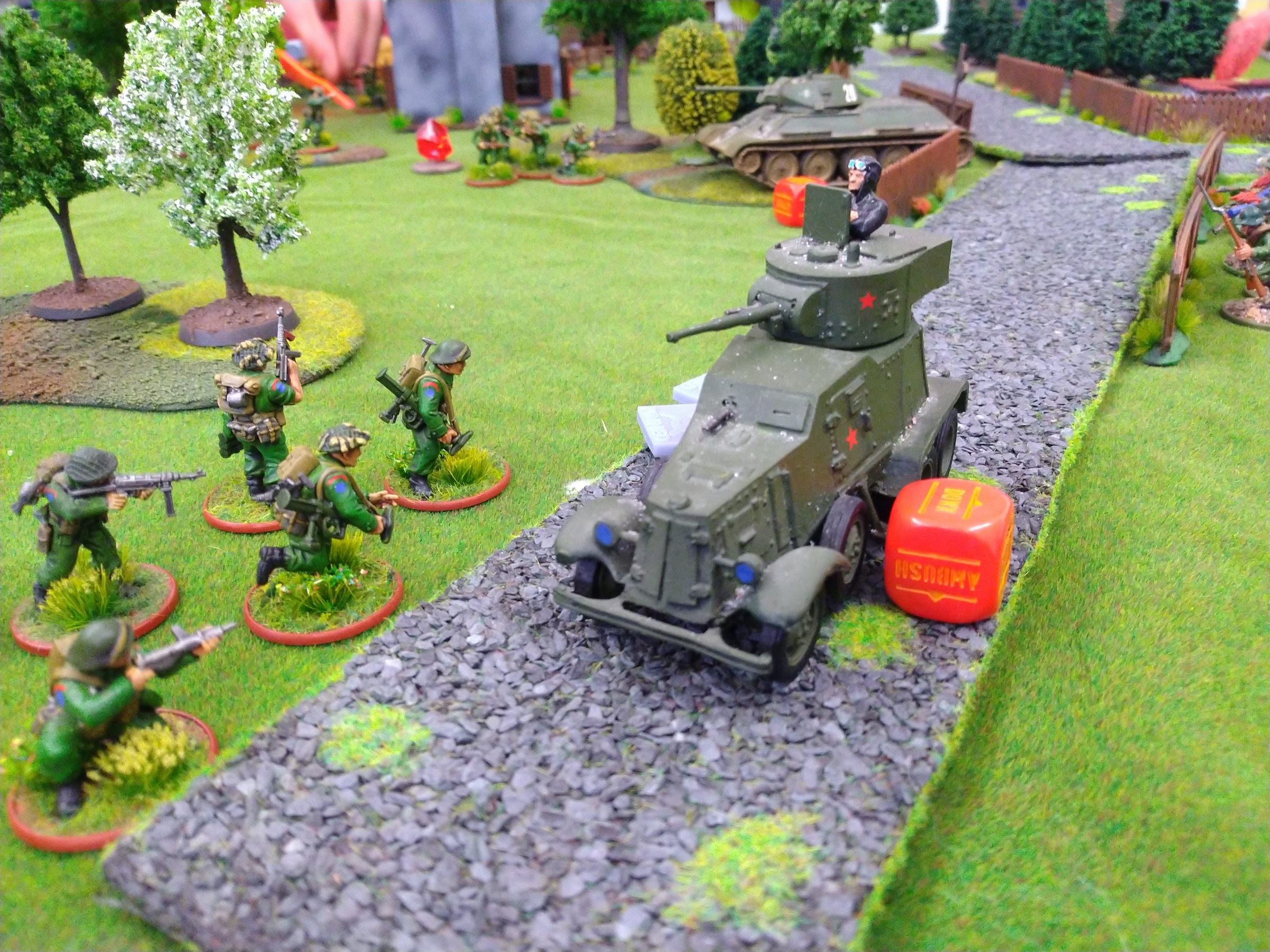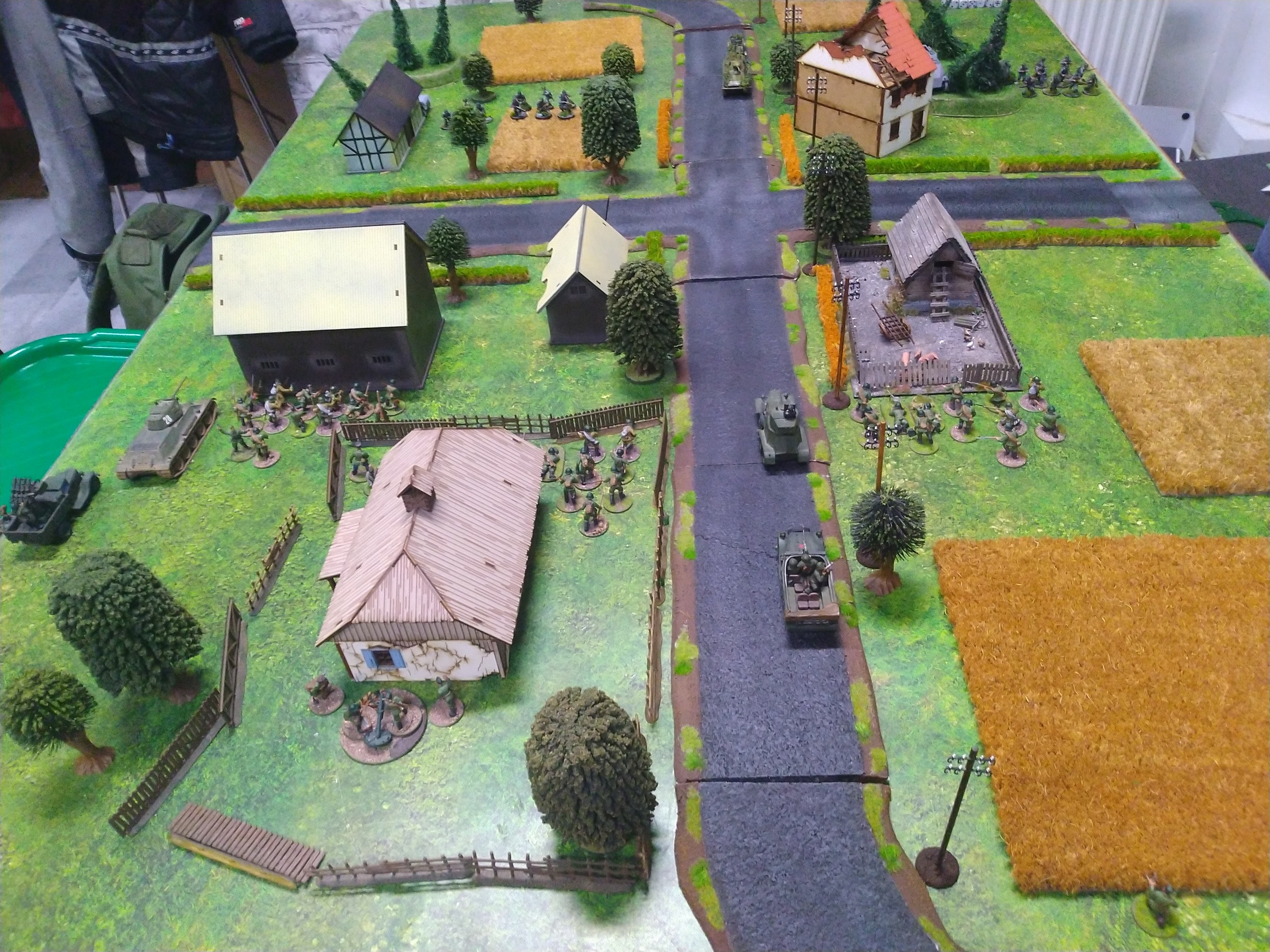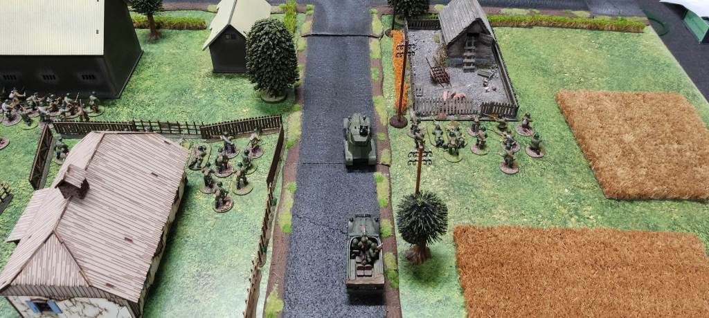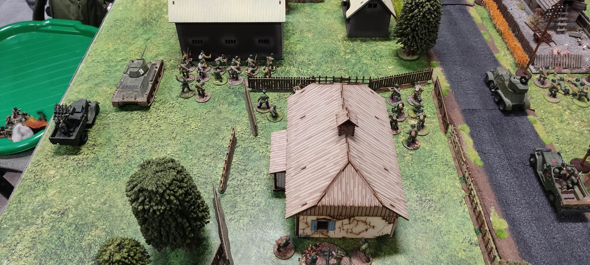 Gaz-AA, famous T-34, free infantry squad, HQ, LMG squad, BA-6, M3-White Scout Car with veterans and flamer, another LMG squad. heavy mortar with spotter. Hidden sniper.Many different things happend. Politruk Popow and German junior officer felt together fighting across fence.