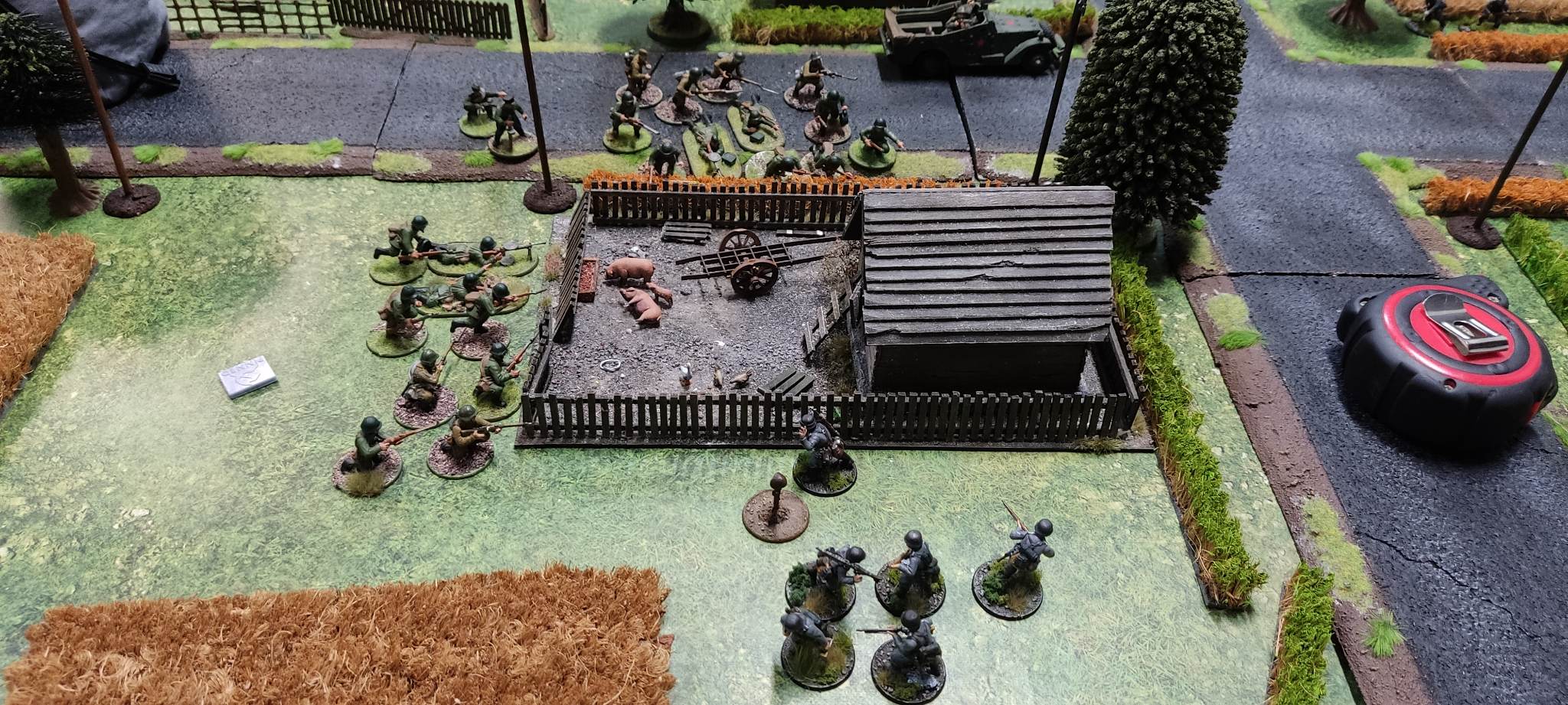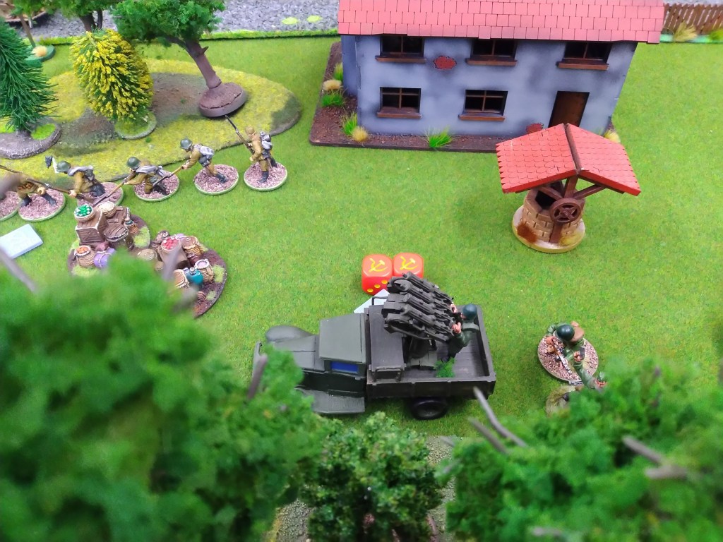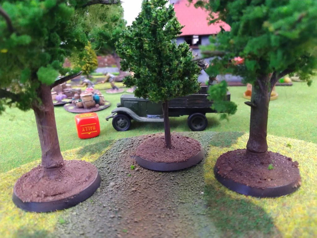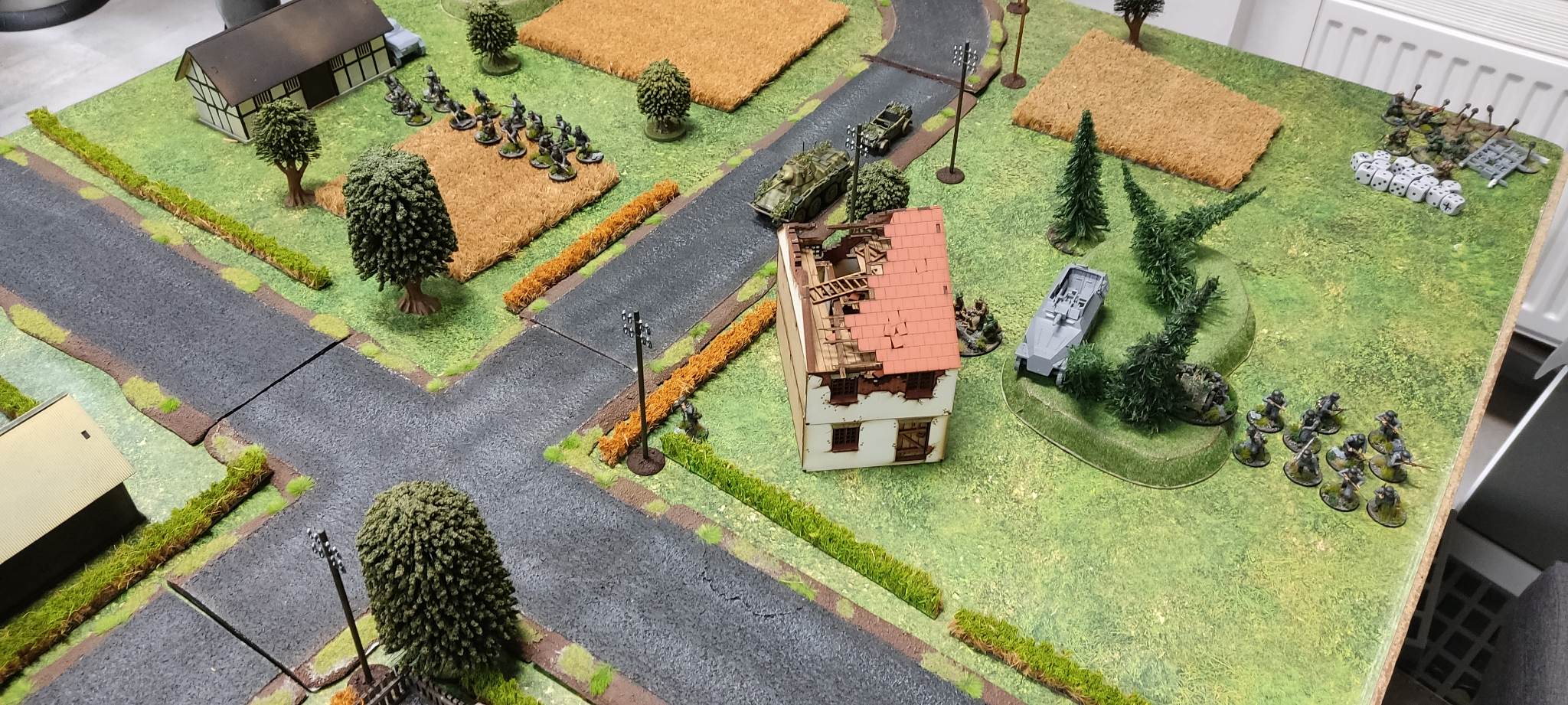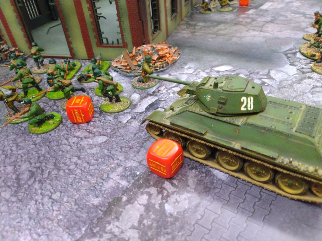 Gaz-AA, famous T-34, free infantry squad, HQ, LMG squad, BA-6, M3-White Scout Car with veterans and flamer, another LMG squad. heavy mortar with spotter. Hidden sniper.Many different things happend. Politruk Popow and German junior officer felt together fighting across fence.