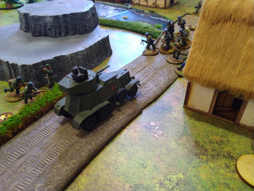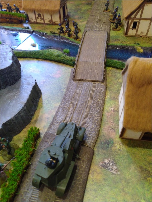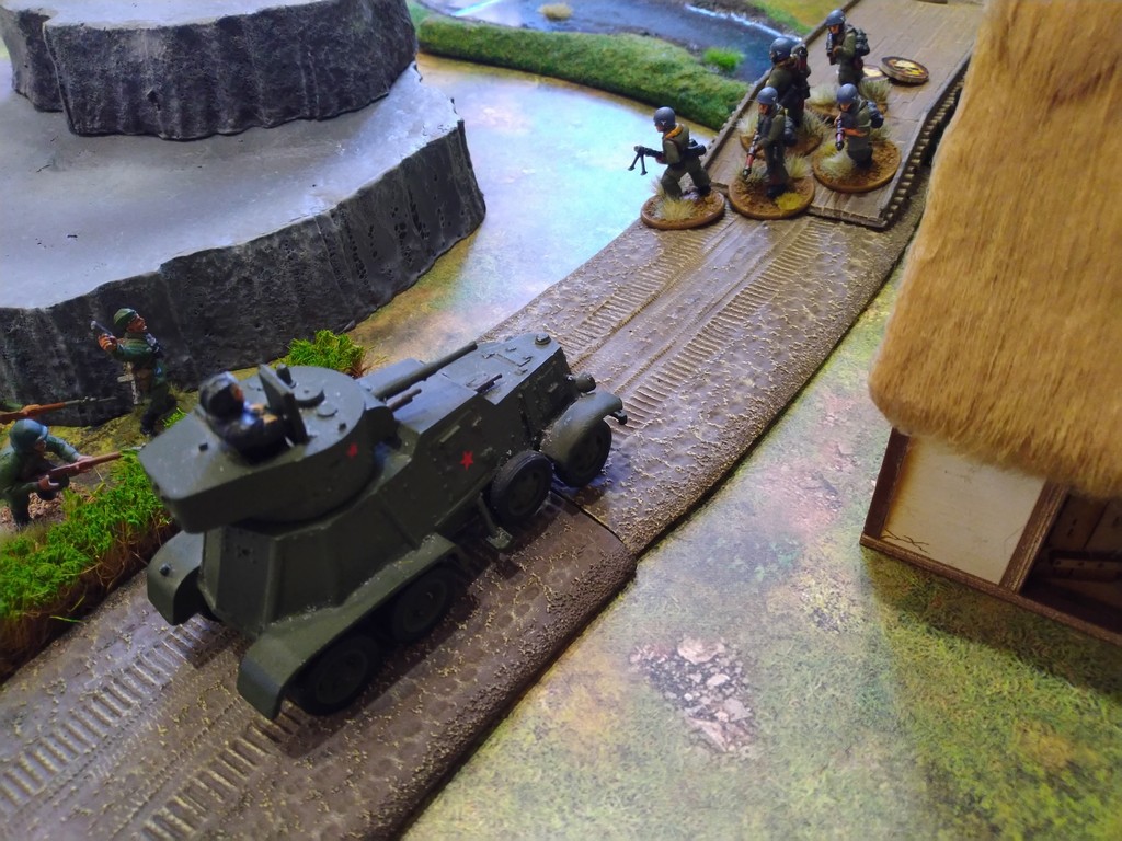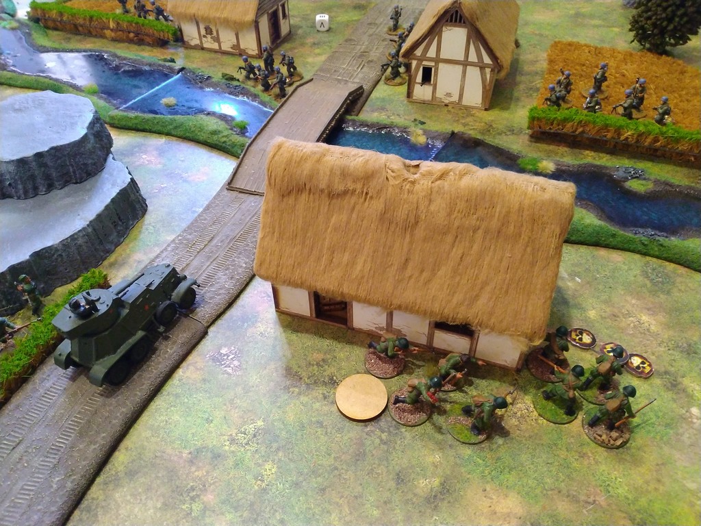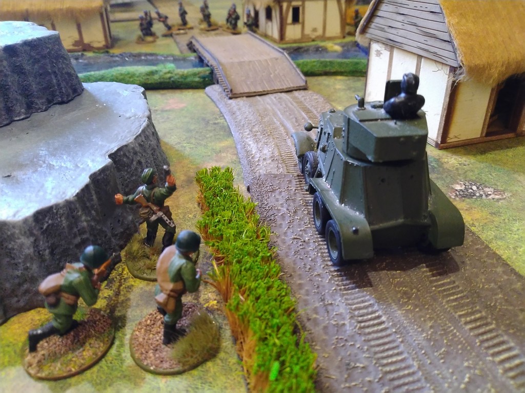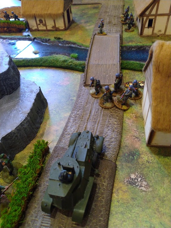 Soviet platoon without lsenior officer with messangers, BA-3/6 and engineers with demolition charges. Four squads of 11 men each plus light mortar.Bridge which should be blowed up by Soviets to slow down German advance. In this game game starts when patrols of both sides starts from the table edges. Four patrols were on both sides.Patrols came closer, blocking enemy patrols on they way.Patrols moved away from enemy view changed into unit’s which were those patrols.Two Soviet squads, leader with messengers and light mortar – on the other side German FJ squad.Take a point of view, we will cover you!German M-34 just waiting for they pray. Soviet DP-28 section eliminated by enemy fire.On the other side section of Soviet squad equipped with famous PPSz submachine guns move around, from tree to tree.They own squad layed fire on enemy with they DP-28 and rifles.German elite against Soviet number. Mortart moved closer, to be in range.More Germans paratroopers came from hidden out.More Soviet troops came to stop more Germans, who came from the field of gold.Soviet infantry without chance to response, just get down under fire. BA-3/6 arrived in time and was fired by AT rifle from the window on the opposite side of the brook.Hidding from enemy fire, PPSz section.Light mortar scored hit on German squad on left flank.Soviet squad on the hill losed they morale and fled.Move and fire, Russian infantry try to destroy enemies on the other side of brook.Fleeing Russians from the hill over the brook and bridge.Broken section of PPSz fled as well.DP-28 opened fire from they window.BA-36 shooting from laser 😀 . Kidding.I ordered my engineers with demolition charges to go to the bridge, but Germans were waiting.Hand to hand combats are brutal, as they should be.I losed my section during melee combat.One more team attempt to take bridge.Germans expelled from my side of brook. To be continued.