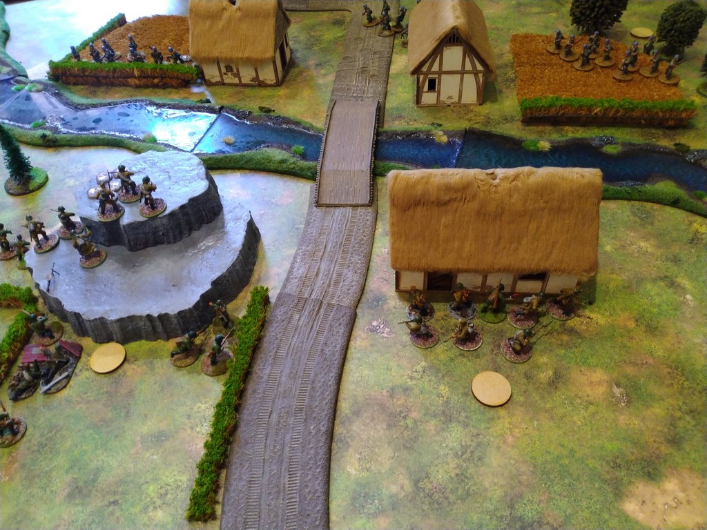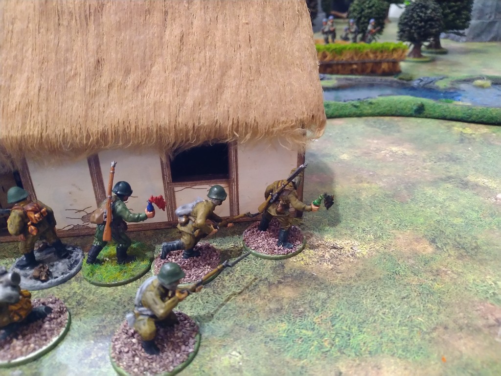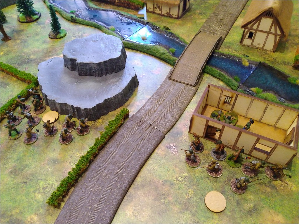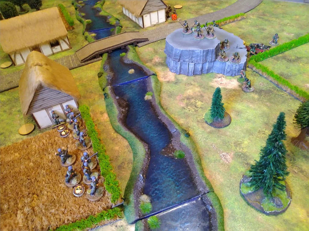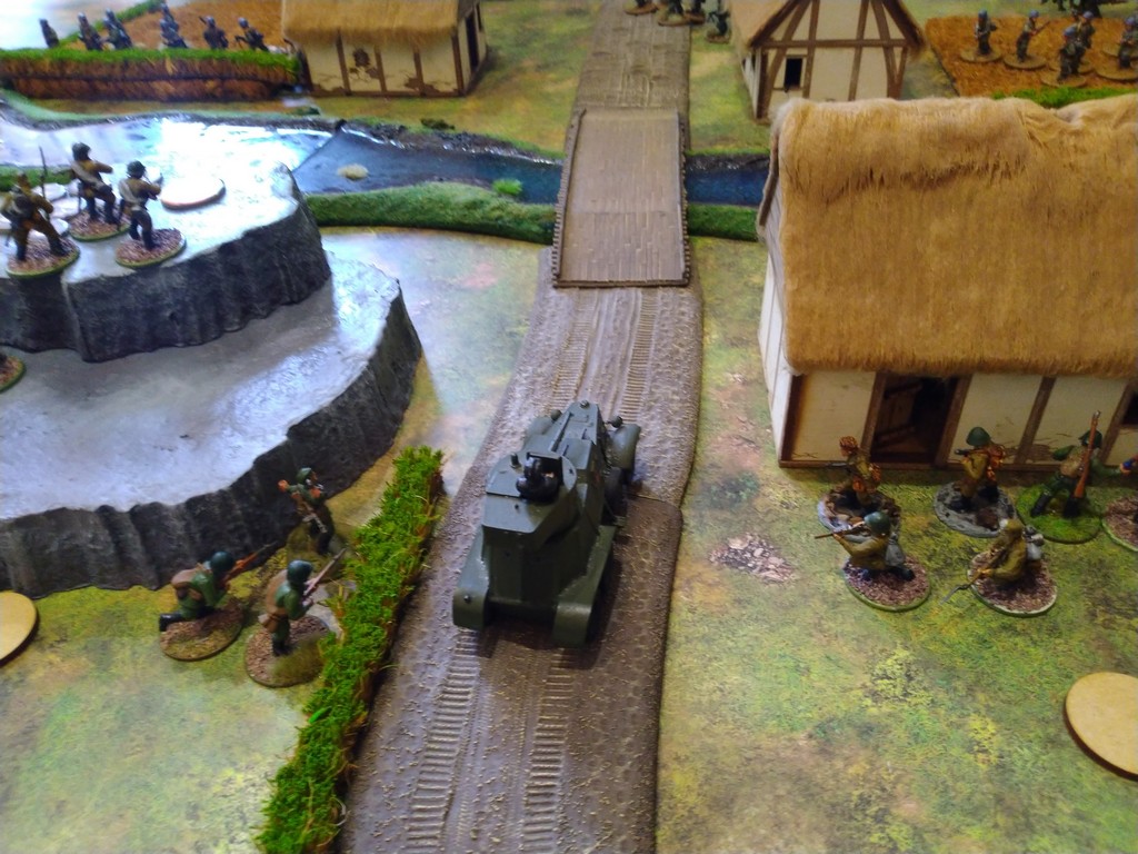 Soviet platoon without lsenior officer with messangers, BA-3/6 and engineers with demolition charges. Four squads of 11 men each plus light mortar.Bridge which should be blowed up by Soviets to slow down German advance. In this game game starts when patrols of both sides starts from the table edges. Four patrols were on both sides.Patrols came closer, blocking enemy patrols on they way.Patrols moved away from enemy view changed into unit’s which were those patrols.Two Soviet squads, leader with messengers and light mortar – on the other side German FJ squad.Take a point of view, we will cover you!German M-34 just waiting for they pray. Soviet DP-28 section eliminated by enemy fire.On the other side section of Soviet squad equipped with famous PPSz submachine guns move around, from tree to tree.They own squad layed fire on enemy with they DP-28 and rifles.German elite against Soviet number. Mortart moved closer, to be in range.More Germans paratroopers came from hidden out.More Soviet troops came to stop more Germans, who came from the field of gold.Soviet infantry without chance to response, just get down under fire. BA-3/6 arrived in time and was fired by AT rifle from the window on the opposite side of the brook.Hidding from enemy fire, PPSz section.Light mortar scored hit on German squad on left flank.Soviet squad on the hill losed they morale and fled.Move and fire, Russian infantry try to destroy enemies on the other side of brook.Fleeing Russians from the hill over the brook and bridge.Broken section of PPSz fled as well.DP-28 opened fire from they window.BA-36 shooting from laser 😀 . Kidding.I ordered my engineers with demolition charges to go to the bridge, but Germans were waiting.Hand to hand combats are brutal, as they should be.I losed my section during melee combat.One more team attempt to take bridge.Germans expelled from my side of brook. To be continued.