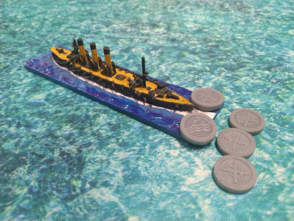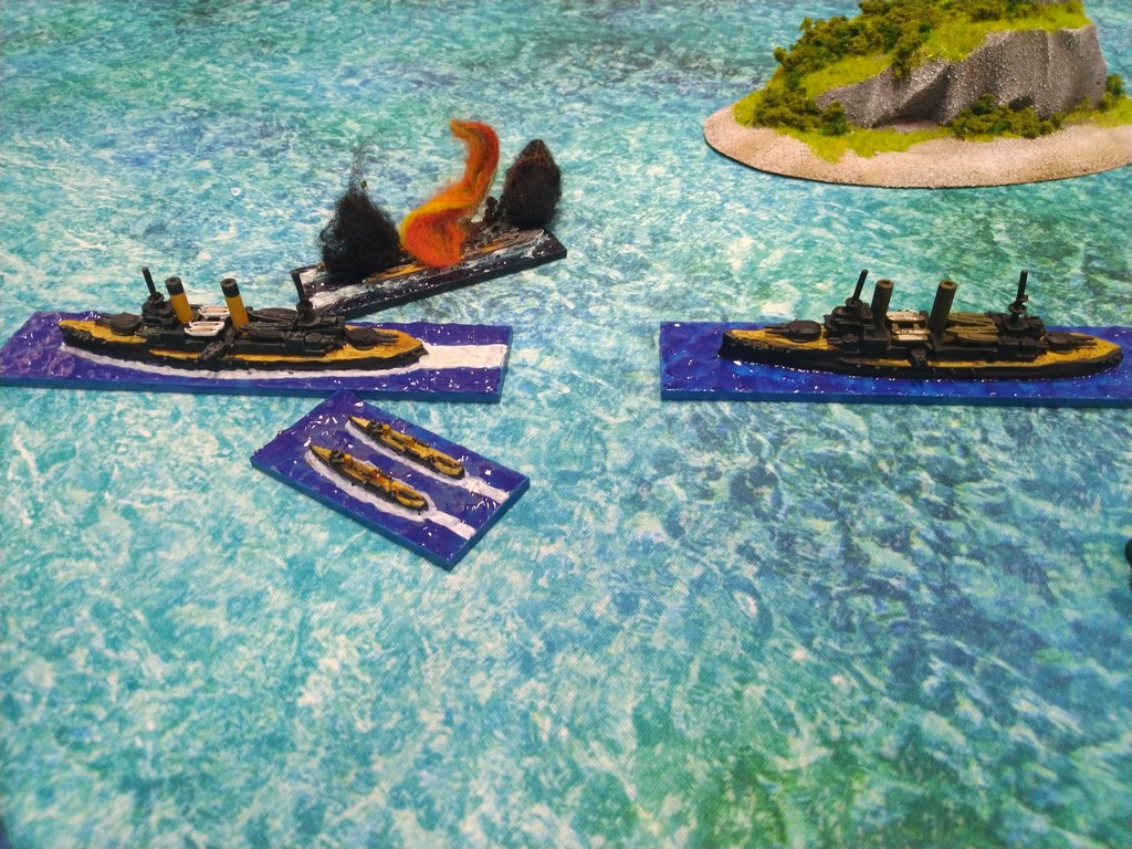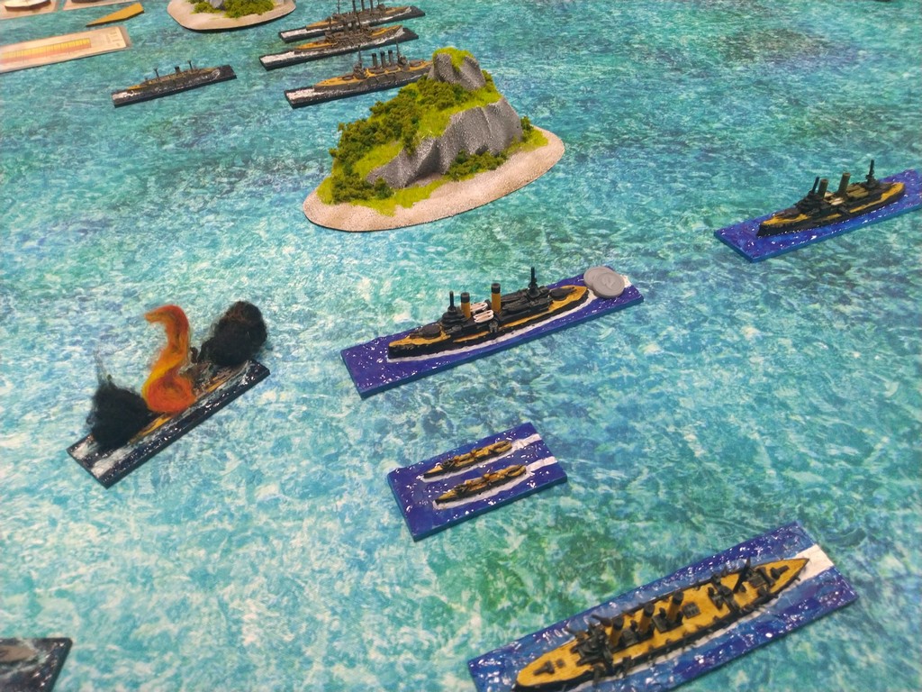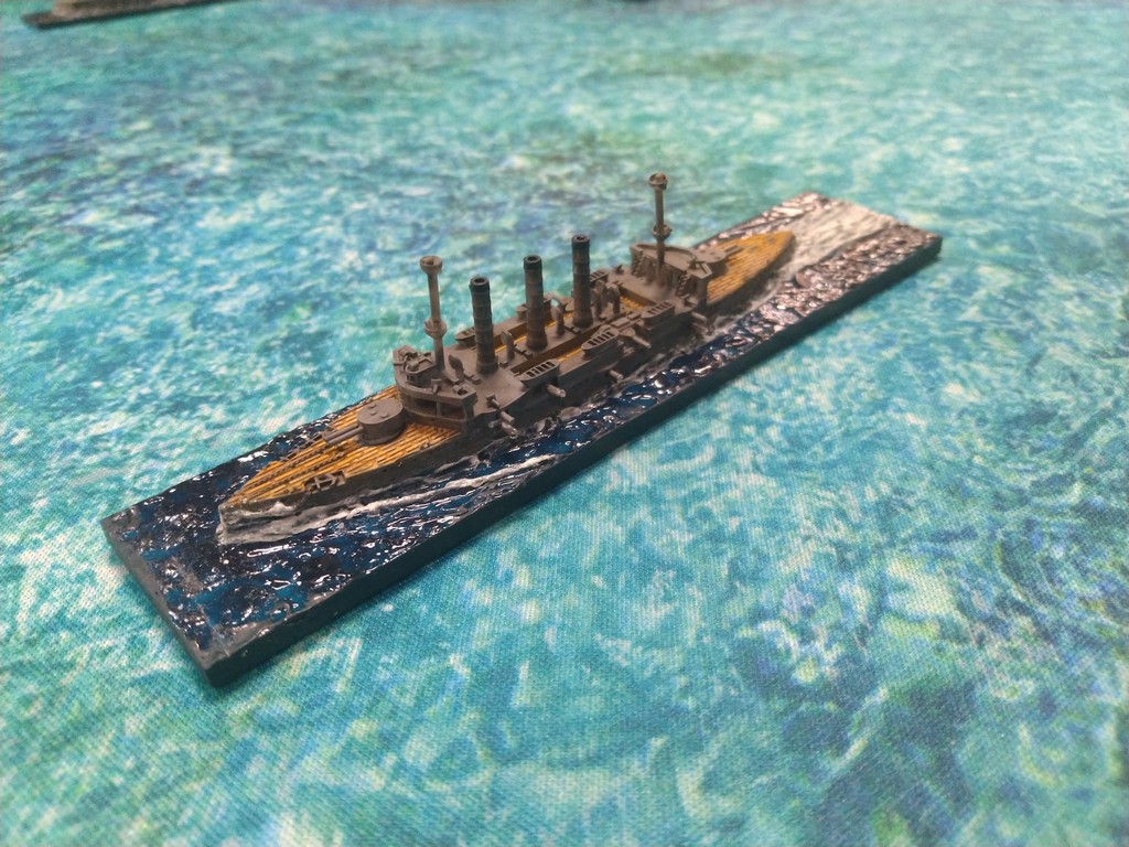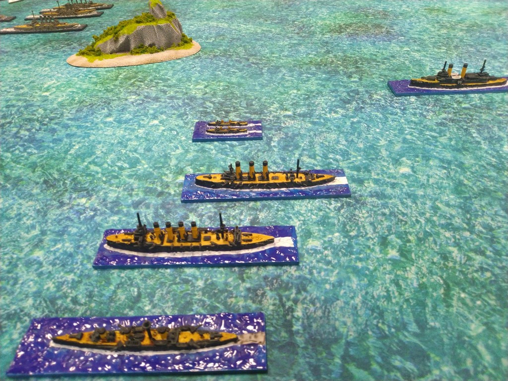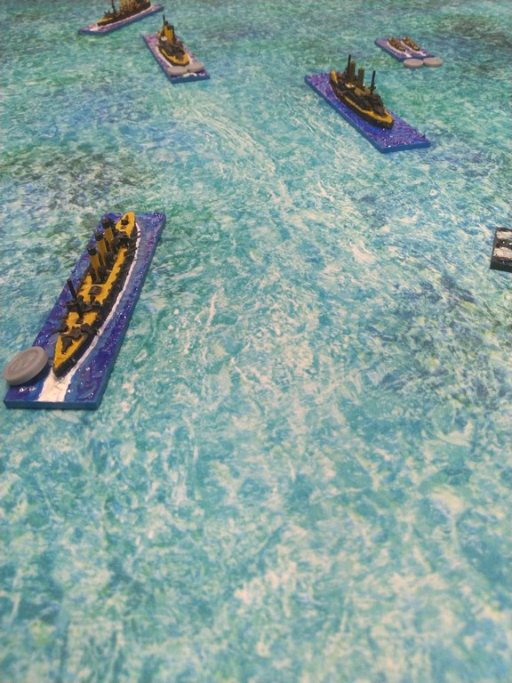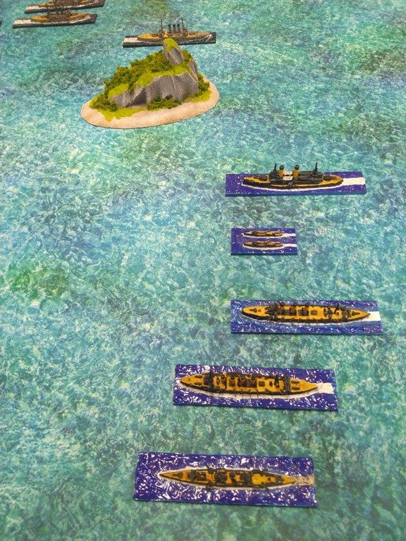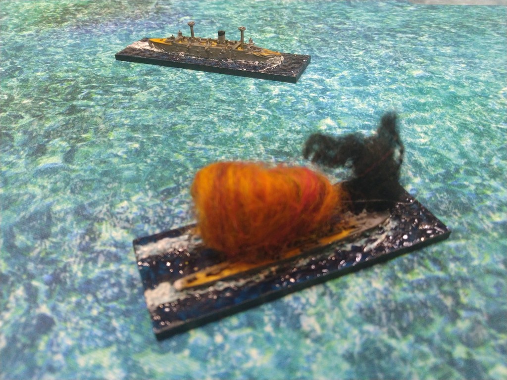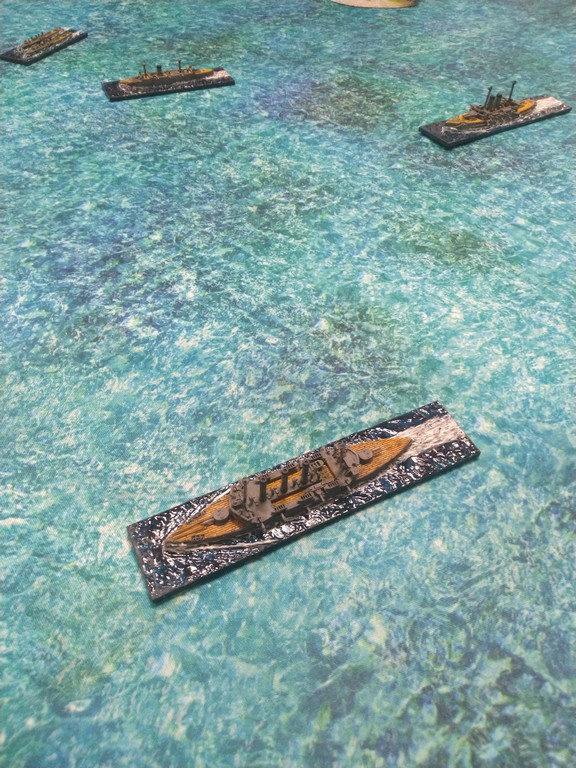 After first turn both fleets were in such positions.Japanese torpedo boats moved to cross path of Russian navy.Island made our hitting harder, as we shot over it.Japanese torpedo boat sent torpedos, but none of them scored a hit.Massive fire from Russian fleet sunk one group of torpedo boats.Other group of torpedo boats succesfully passed beetwen Russian ships.First ramming, Buynyi class started getting water, with it crew trying to safe ship from sunking.Second ramming, succesful – ship which got many hits before from Russian Borodino class ships: Suworow and Borodin sunk after being rammed.Third ramming… Aurora rammed Suworow, both ships survived, but started sunking.Torpedo boats captain decided to surrender – were destroyed by they own ship, as Japanese do not surrender.Japanese fleet moving into the correct exit corner.Russian ship also preparing to leave board.Aurora being flood by water.Last ship on the table which missed crossing corner was Aurora.