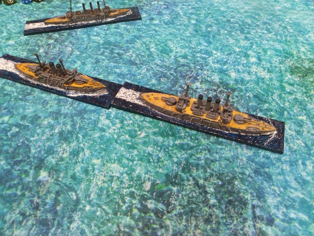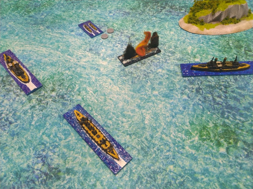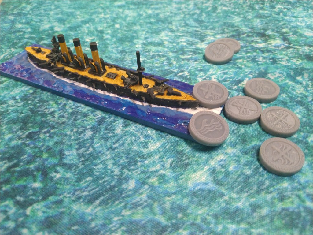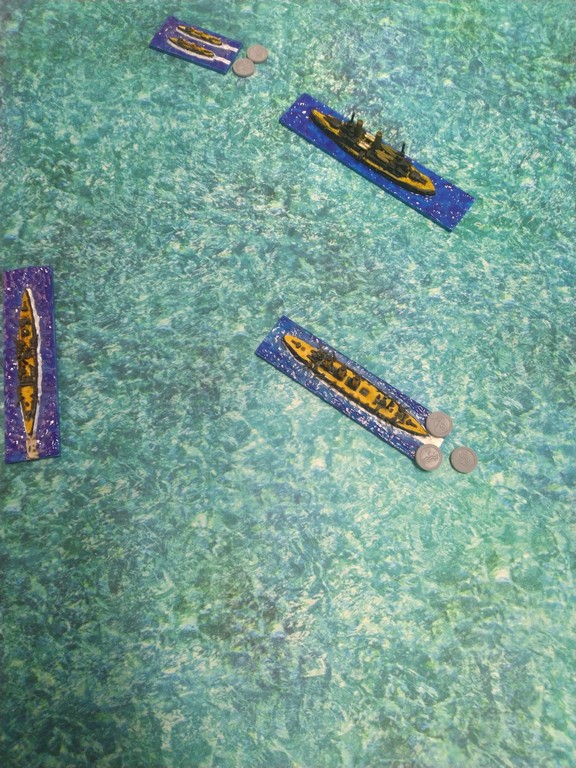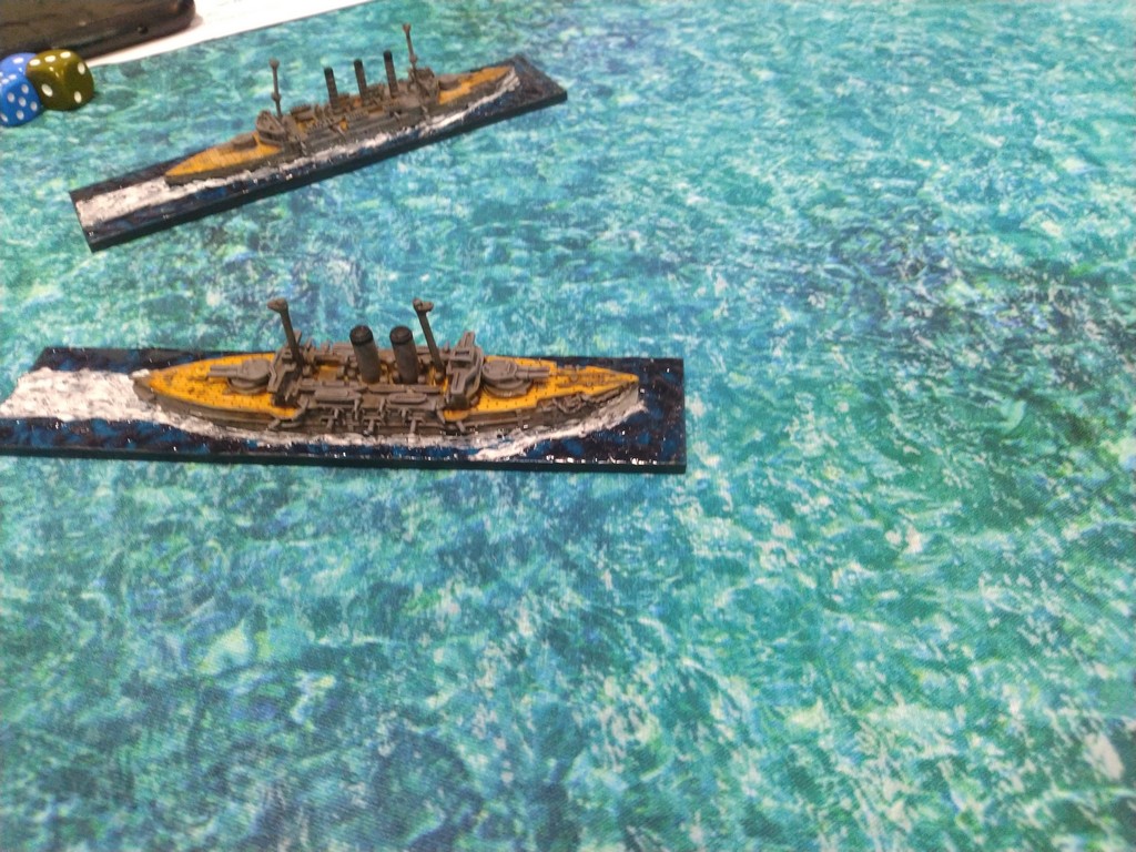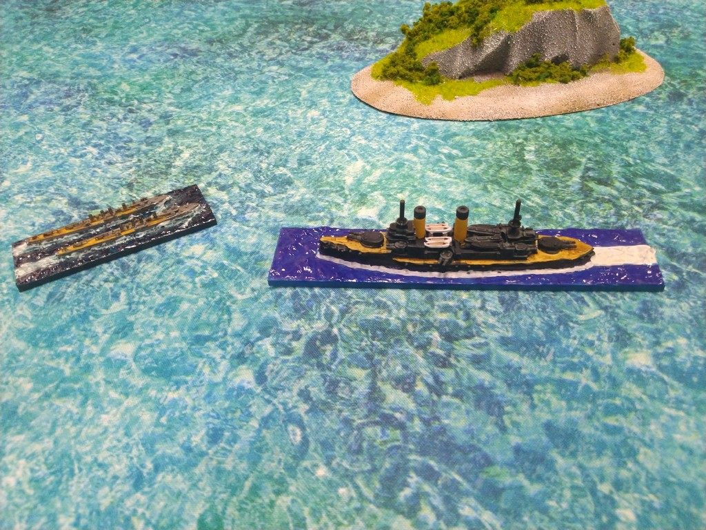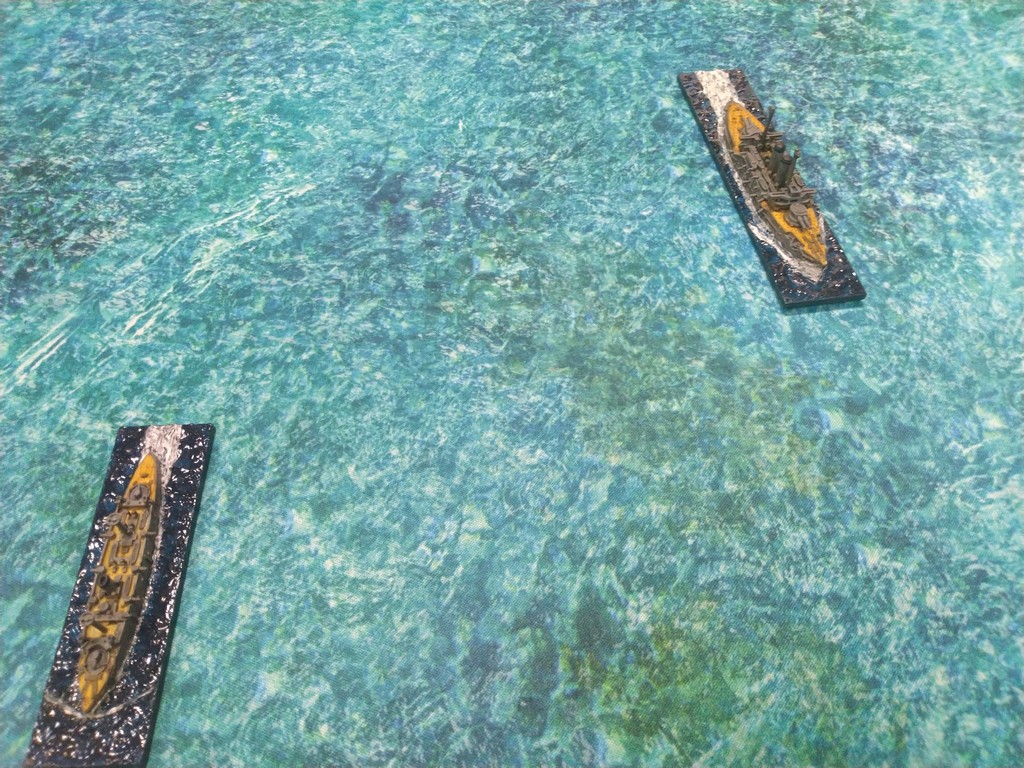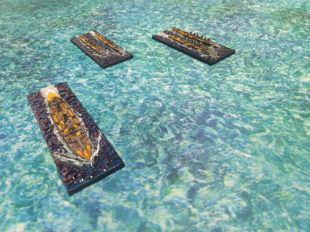 After first turn both fleets were in such positions.Japanese torpedo boats moved to cross path of Russian navy.Island made our hitting harder, as we shot over it.Japanese torpedo boat sent torpedos, but none of them scored a hit.Massive fire from Russian fleet sunk one group of torpedo boats.Other group of torpedo boats succesfully passed beetwen Russian ships.First ramming, Buynyi class started getting water, with it crew trying to safe ship from sunking.Second ramming, succesful – ship which got many hits before from Russian Borodino class ships: Suworow and Borodin sunk after being rammed.Third ramming… Aurora rammed Suworow, both ships survived, but started sunking.Torpedo boats captain decided to surrender – were destroyed by they own ship, as Japanese do not surrender.Japanese fleet moving into the correct exit corner.Russian ship also preparing to leave board.Aurora being flood by water.Last ship on the table which missed crossing corner was Aurora.