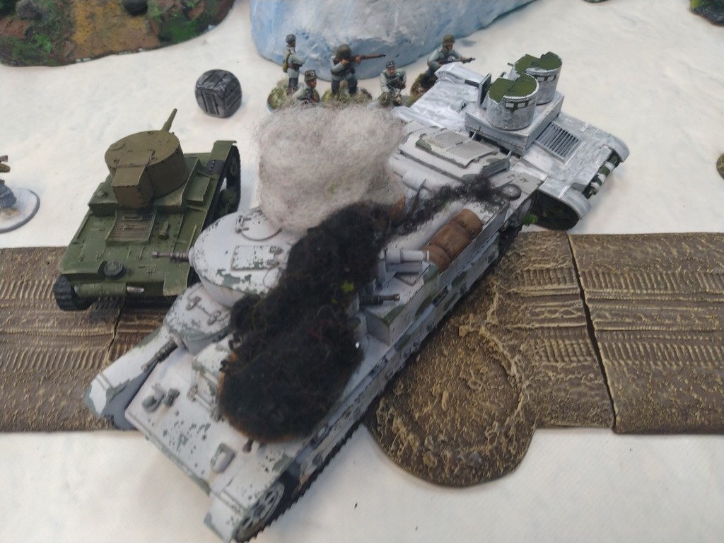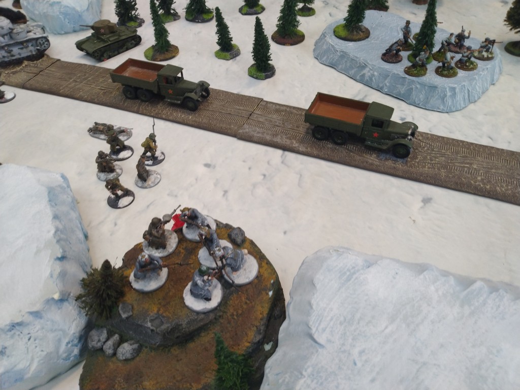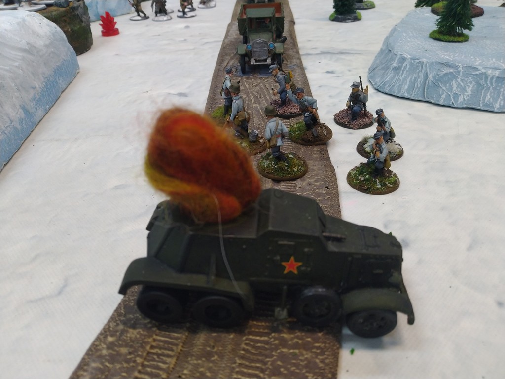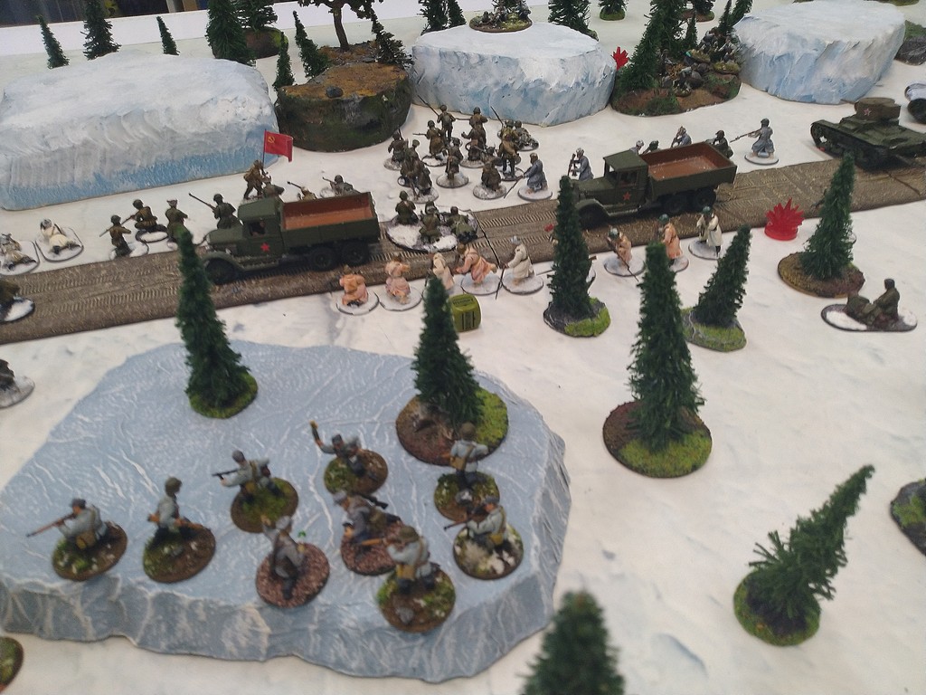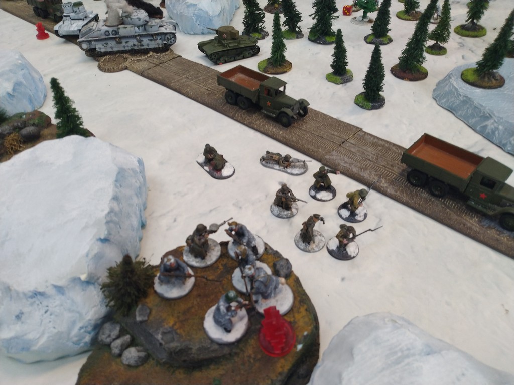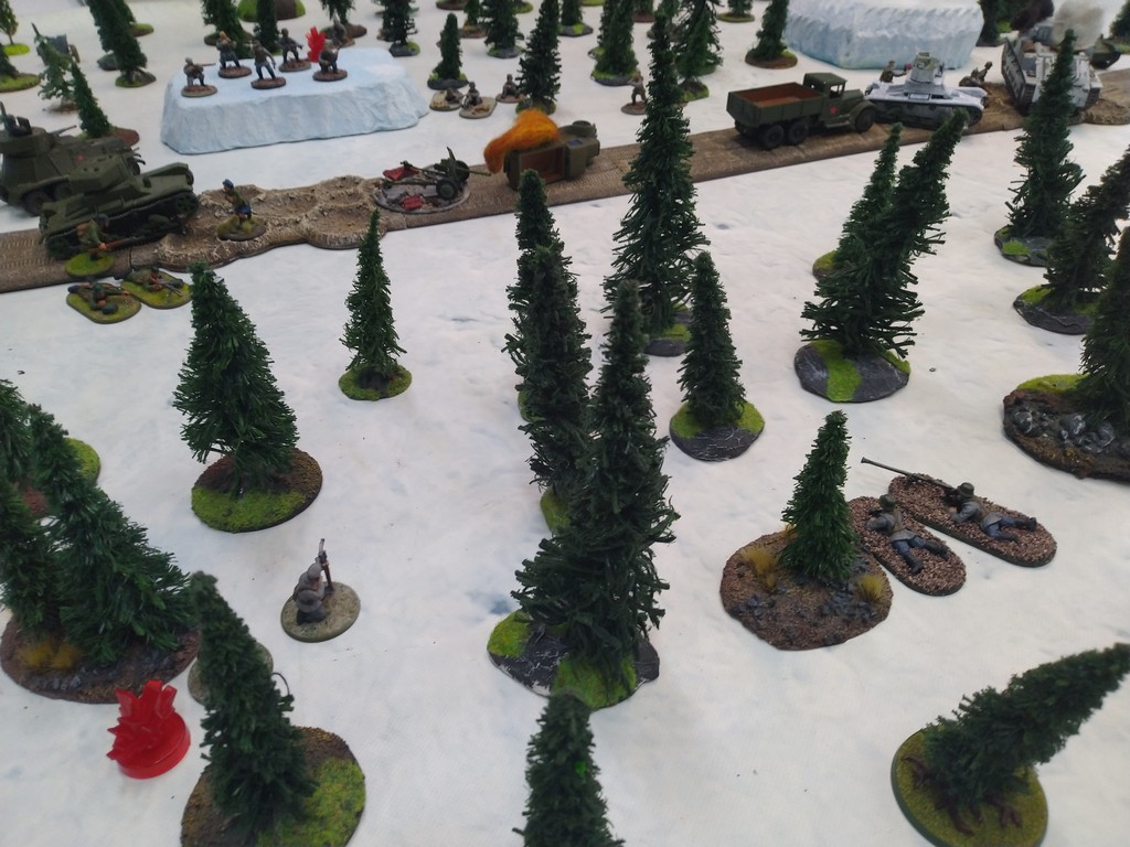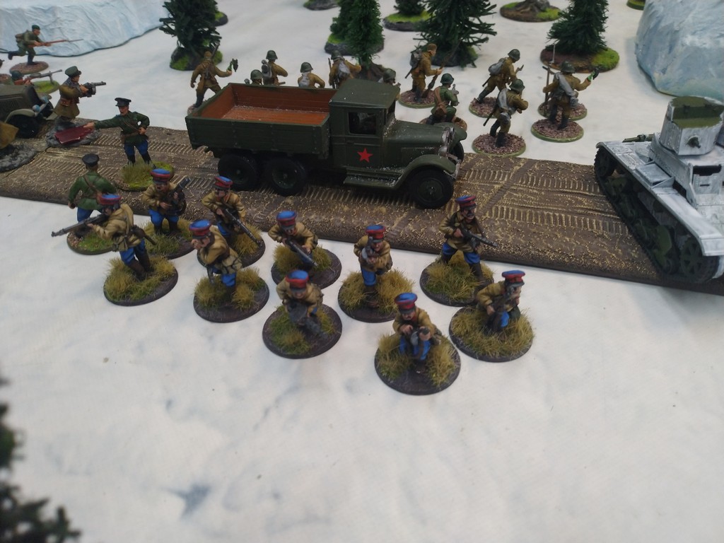 When trees start talking in Finish something will happen. Red Army column somewhere in Finnland. NKWD troops painted by Bonapartist Paint Studio.T-28 – suffered from lucky shoot from at rifle or not? It blocked road.Famous Finnish sniper – Simo Häyhä.Soviet column – this part belonged to comrade Łukasz.Finnish soldiers awaiting orders.Fubar. At least after raising with Łukasz Fubar Team we roll less fubars.Before tragedy started. Red Army soldiers looking nervously all around. Most of them are inexperienced troops. Comrade – I order you to check what is behind this rock – NOW!Lucky shoot from mortar and BA-3/6 almost destroyed Finnish Bofors. Finns with coctails came too close.Bayonnets fixed, charge!Soviet reconneisance by force found problems.Finns are everywhere.Another FUBAR belongs to Łukasz. One more FUBAR, great job comrade Łukasz!NKWD charged Finns in desperate attempt to clear area close to the road.Several coctails….… and BA-3/6 burned. Less and less Red Army soldiers on the table. Final countdown.