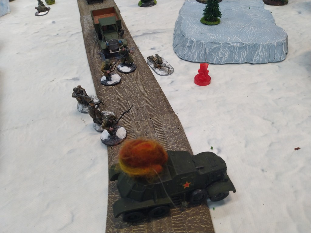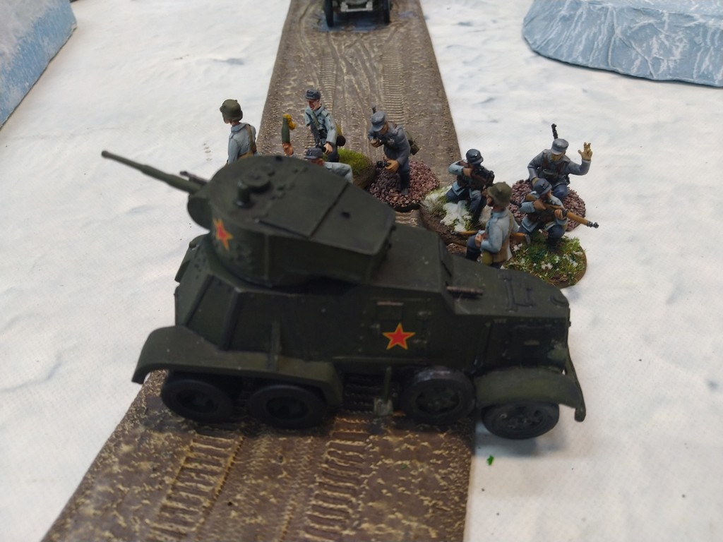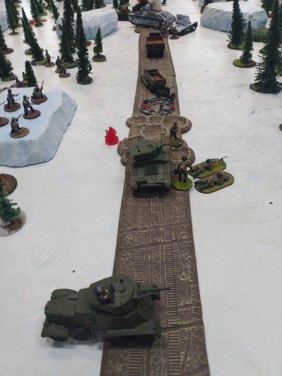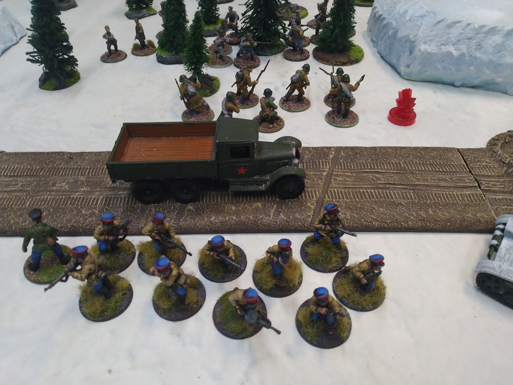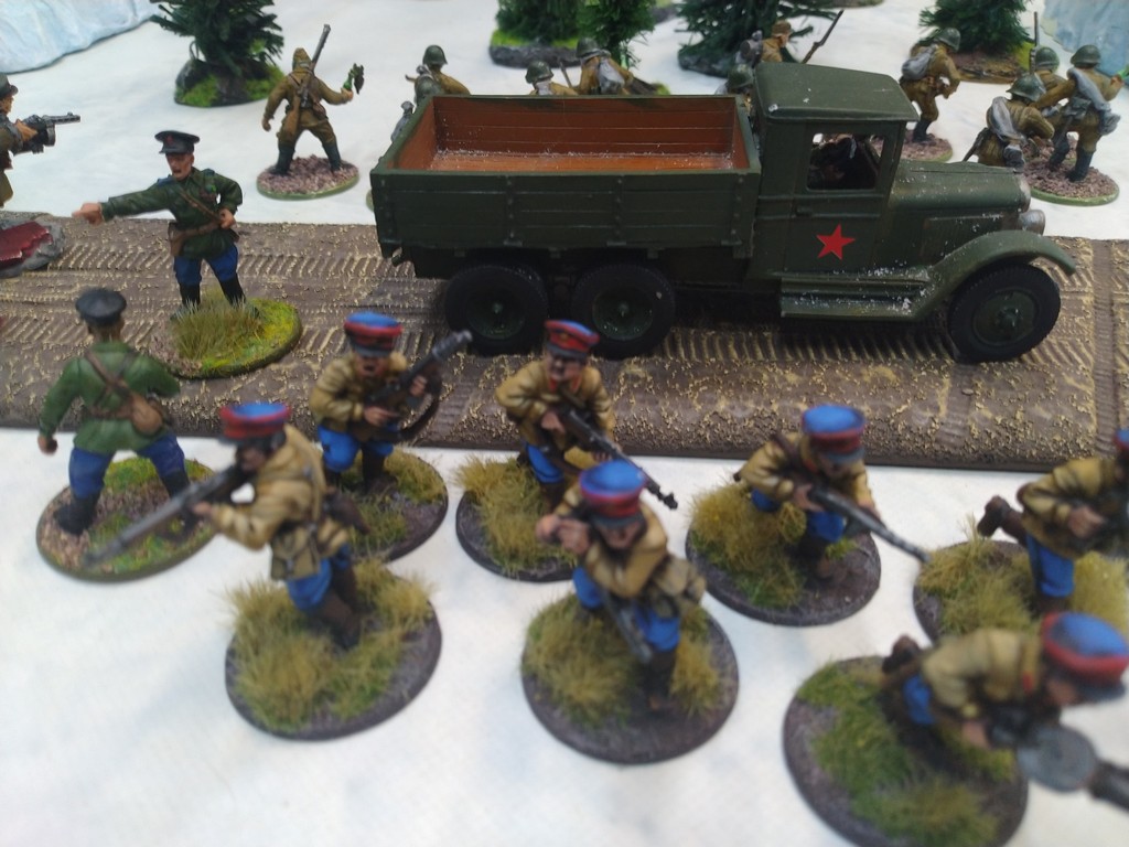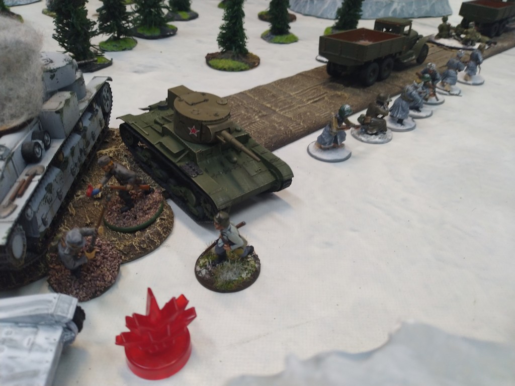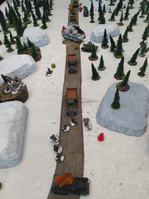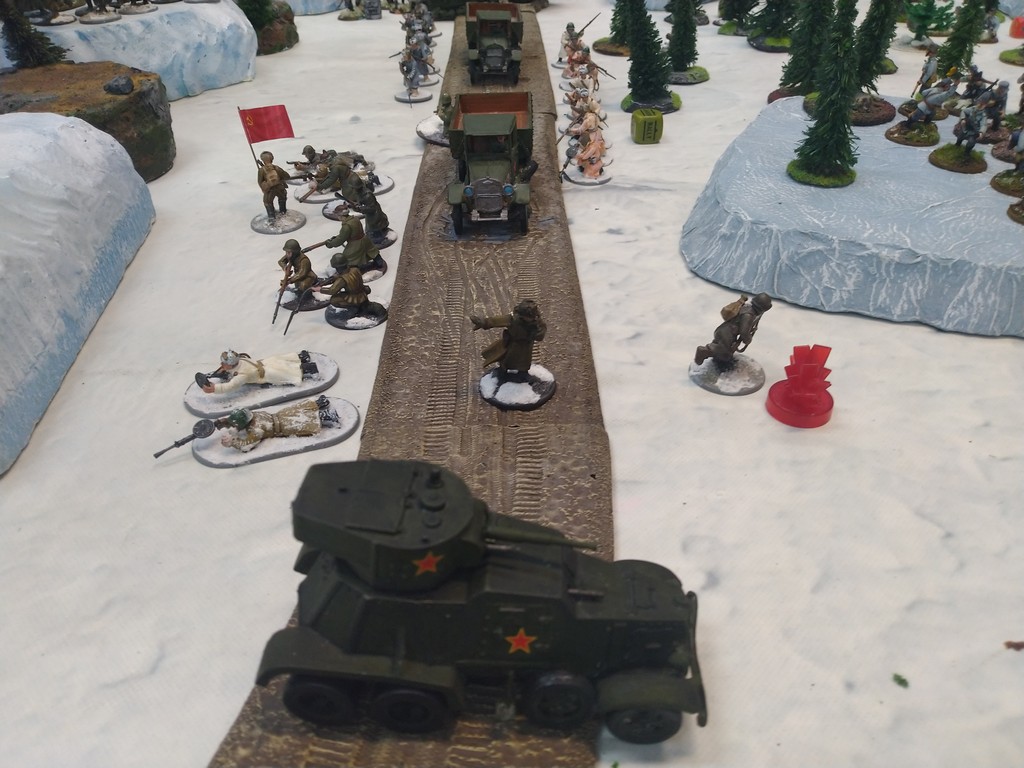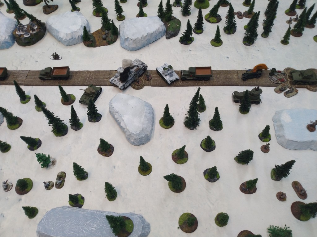 When trees start talking in Finish something will happen. Red Army column somewhere in Finnland. NKWD troops painted by Bonapartist Paint Studio.T-28 – suffered from lucky shoot from at rifle or not? It blocked road.Famous Finnish sniper – Simo Häyhä.Soviet column – this part belonged to comrade Łukasz.Finnish soldiers awaiting orders.Fubar. At least after raising with Łukasz Fubar Team we roll less fubars.Before tragedy started. Red Army soldiers looking nervously all around. Most of them are inexperienced troops. Comrade – I order you to check what is behind this rock – NOW!Lucky shoot from mortar and BA-3/6 almost destroyed Finnish Bofors. Finns with coctails came too close.Bayonnets fixed, charge!Soviet reconneisance by force found problems.Finns are everywhere.Another FUBAR belongs to Łukasz. One more FUBAR, great job comrade Łukasz!NKWD charged Finns in desperate attempt to clear area close to the road.Several coctails….… and BA-3/6 burned. Less and less Red Army soldiers on the table. Final countdown.
