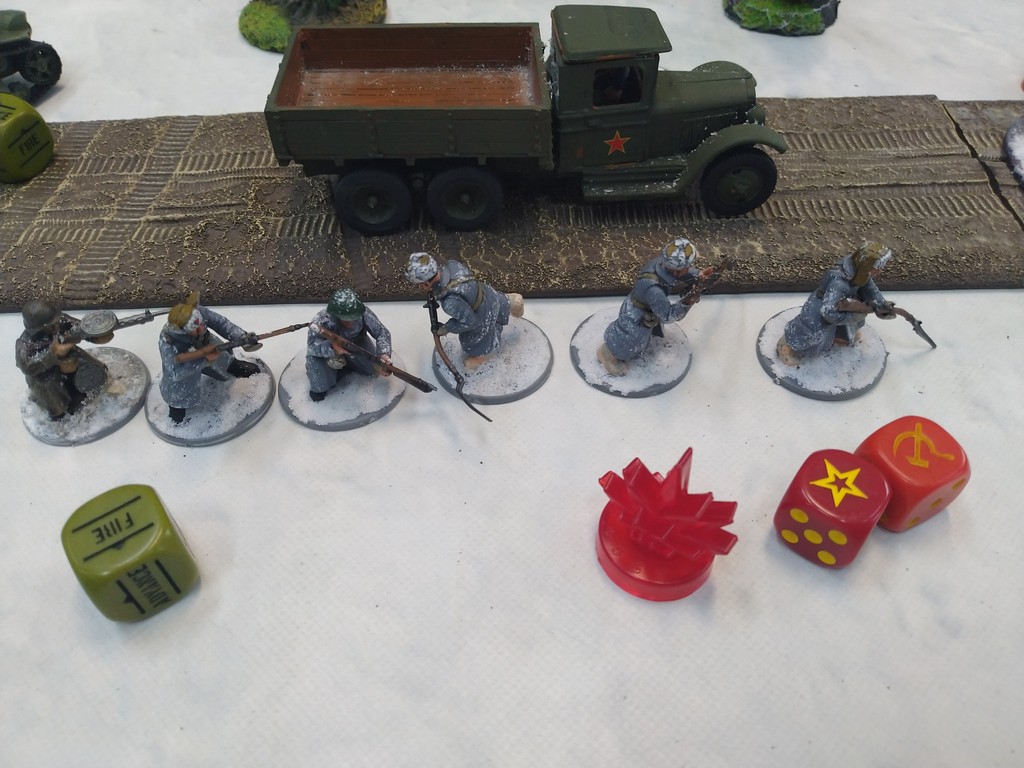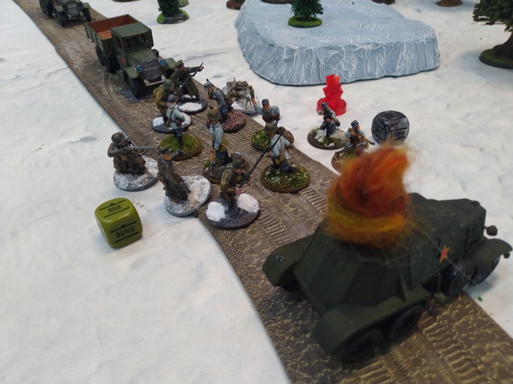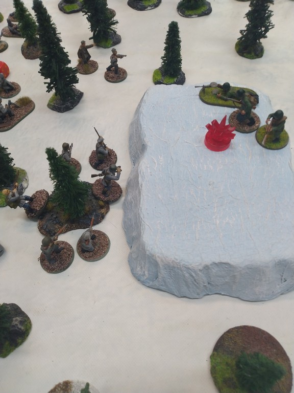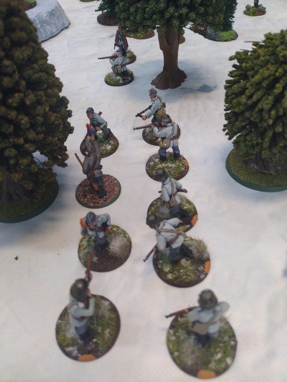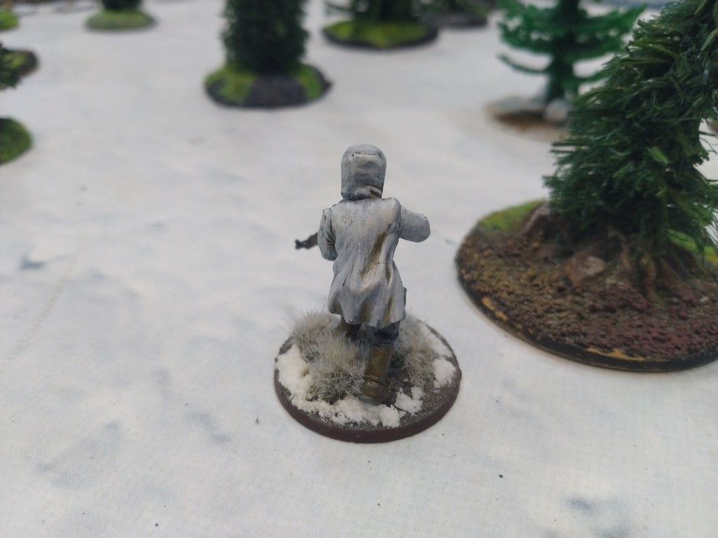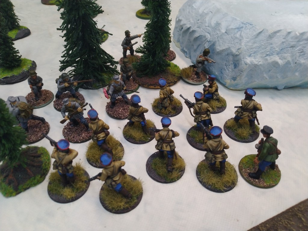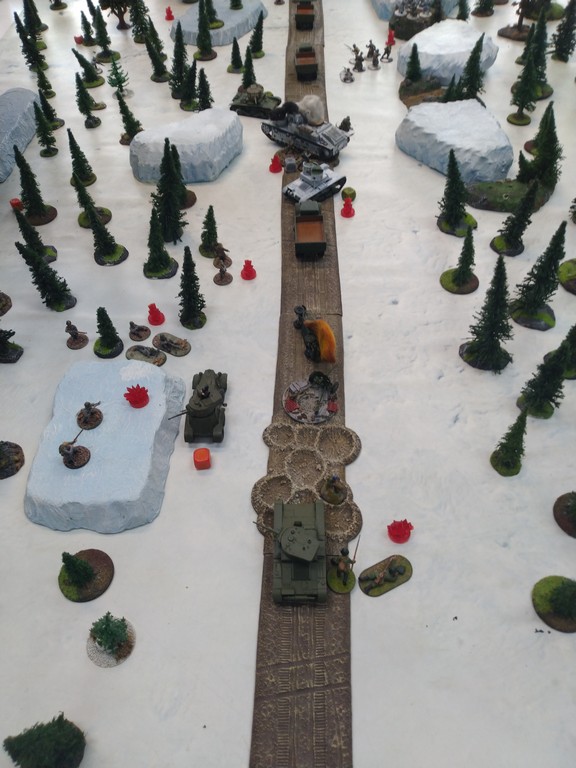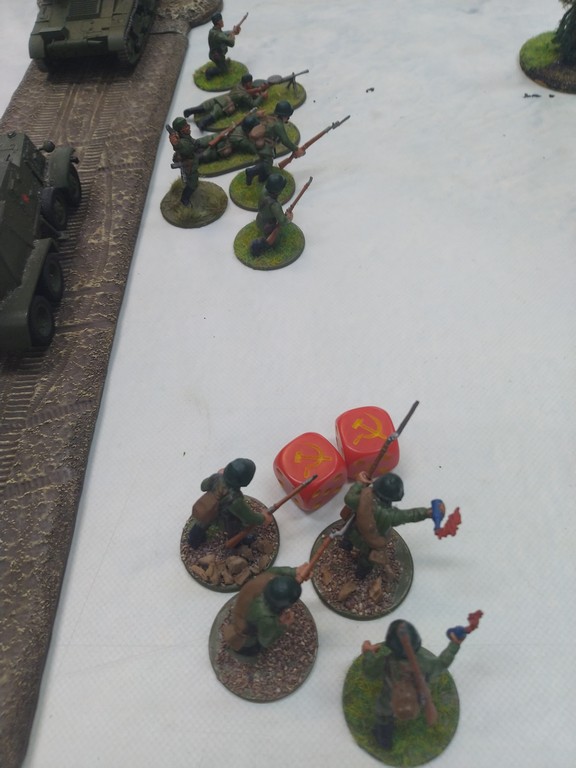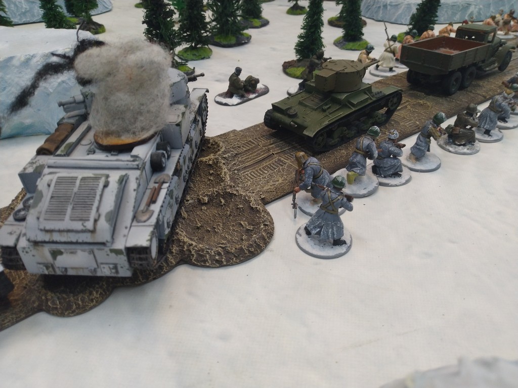 When trees start talking in Finish something will happen. Red Army column somewhere in Finnland. NKWD troops painted by Bonapartist Paint Studio.T-28 – suffered from lucky shoot from at rifle or not? It blocked road.Famous Finnish sniper – Simo Häyhä.Soviet column – this part belonged to comrade Łukasz.Finnish soldiers awaiting orders.Fubar. At least after raising with Łukasz Fubar Team we roll less fubars.Before tragedy started. Red Army soldiers looking nervously all around. Most of them are inexperienced troops. Comrade – I order you to check what is behind this rock – NOW!Lucky shoot from mortar and BA-3/6 almost destroyed Finnish Bofors. Finns with coctails came too close.Bayonnets fixed, charge!Soviet reconneisance by force found problems.Finns are everywhere.Another FUBAR belongs to Łukasz. One more FUBAR, great job comrade Łukasz!NKWD charged Finns in desperate attempt to clear area close to the road.Several coctails….… and BA-3/6 burned. Less and less Red Army soldiers on the table. Final countdown.