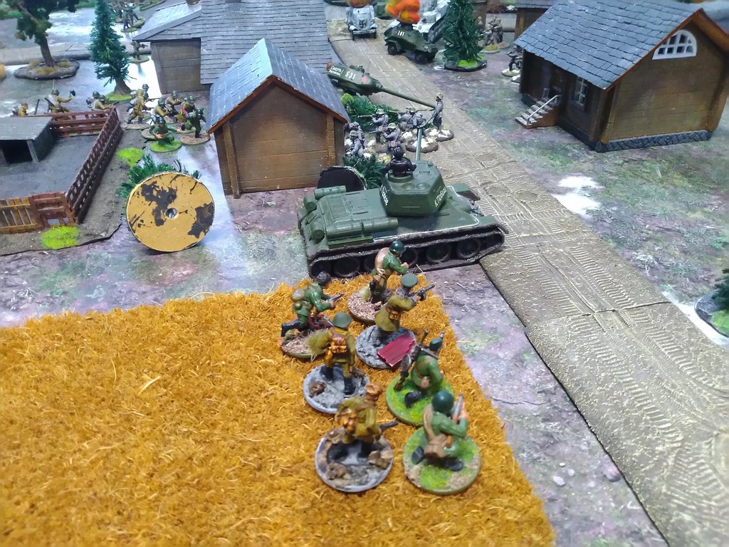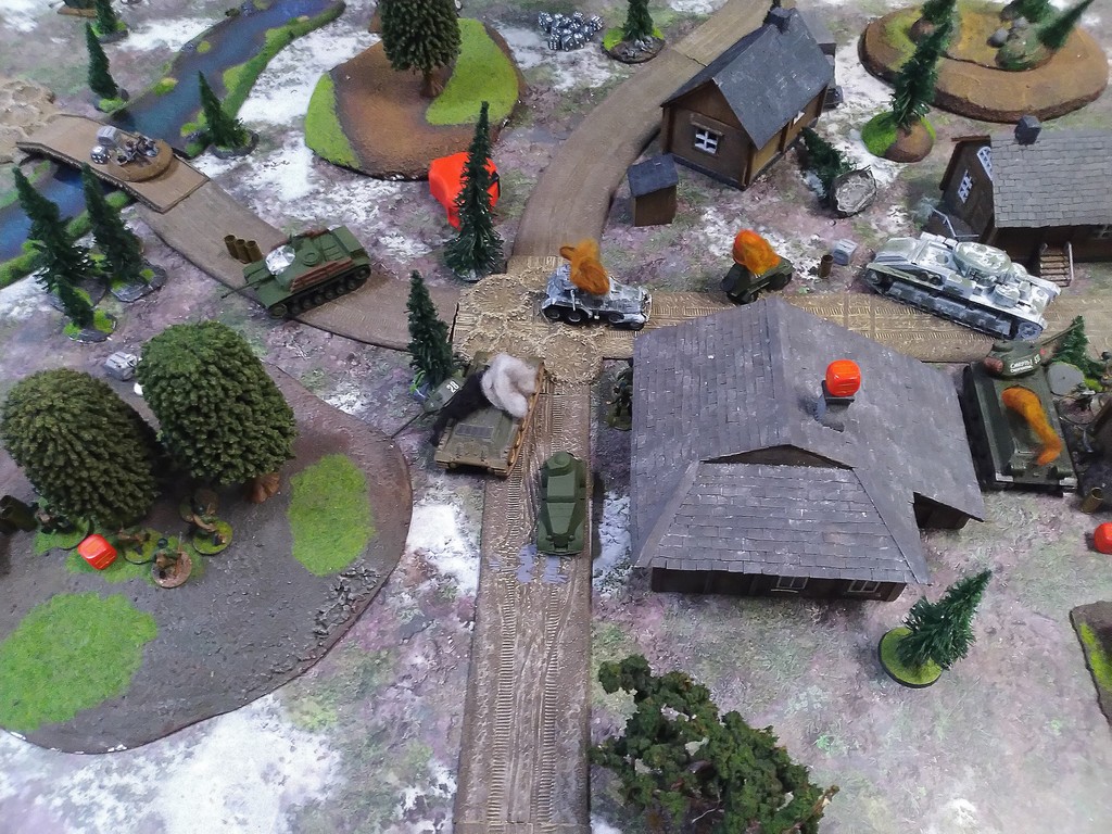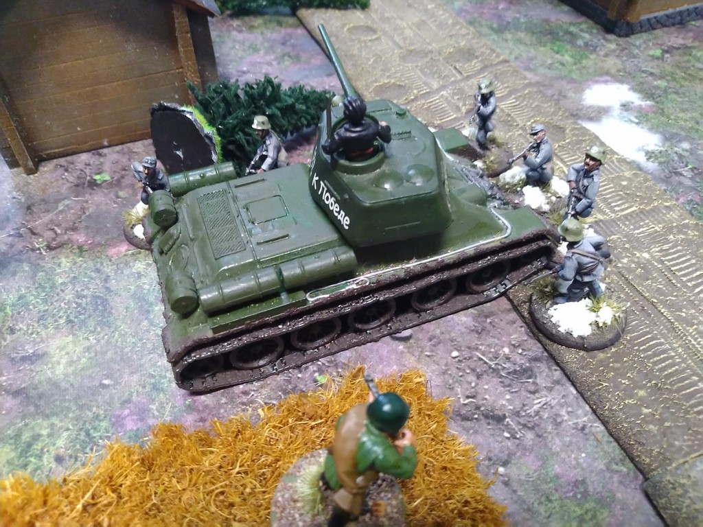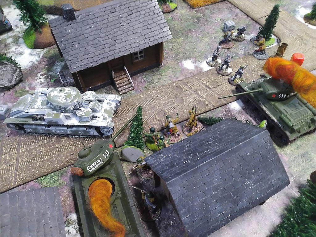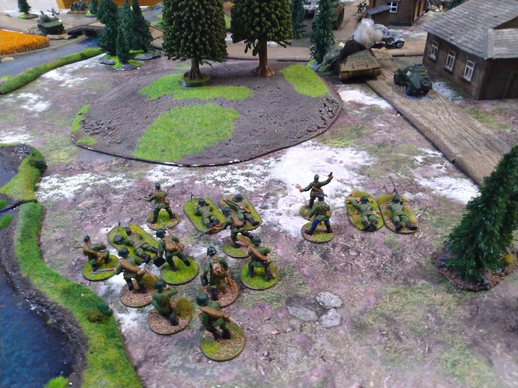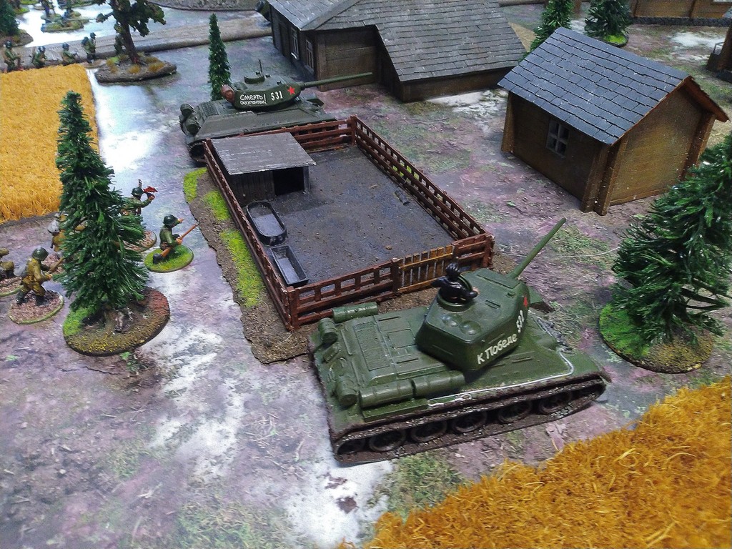 Scouts and few other units like artillery observer or snipers were placed on the board before battle begun. Opel Blitz – one of thousand delivered to Finnland by Germany. One of my favourite German truck.Remnant of Soviet recon force – T-34 with some important documents (worth 3 Victory Points for side controlling it at the end).Best infantry of Red Army – free unit.One of my T-34-85 named Moscow to honour home city of my friend Svetlana.On full speed Red Army advanced on right flank – engines of T-34-85 tanks working loudly.Finnish veterans move quickly thru the dense woodland area.For Mother Russia, forward comrades!Assault engineers, part of Red Army run after BA-64 scout car.Finns threw to action everything they had at hand.T-28, Sturmi and BA-10 arrived to stop Red Army advance.Tank on right has tankodesantniki squad – veterans of many fights.BA-64 crew realized what is going on.T-34-85 shoot down BA-10.BA-64 rushed and made panic in flamethrower team.Red Army advanced behind they T-34-85 tanks.Good shoot from panzerfaust eliminated T-34-85.Tankodesantniki dropped down when sniper shoot on they tank.Moscow pinned by enemy fire from many sources.Finnish infantry bravely charged on steel colosus…… and burned it with molotov coctails.To the ground said comrade seargant again.Close combat fight in the village on the right flank.Ivan one more bullet, hit that tank (Sturmi was tank destroyer – not a tank).Heavy wounded PTRD team wasn’t able to shoot once more.T-28 moved, but Soviet infantry layed down when it opened fire from all it mmg’s.At the end we counted points – it was a Draw.