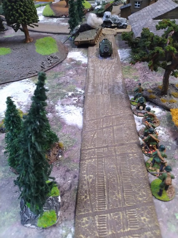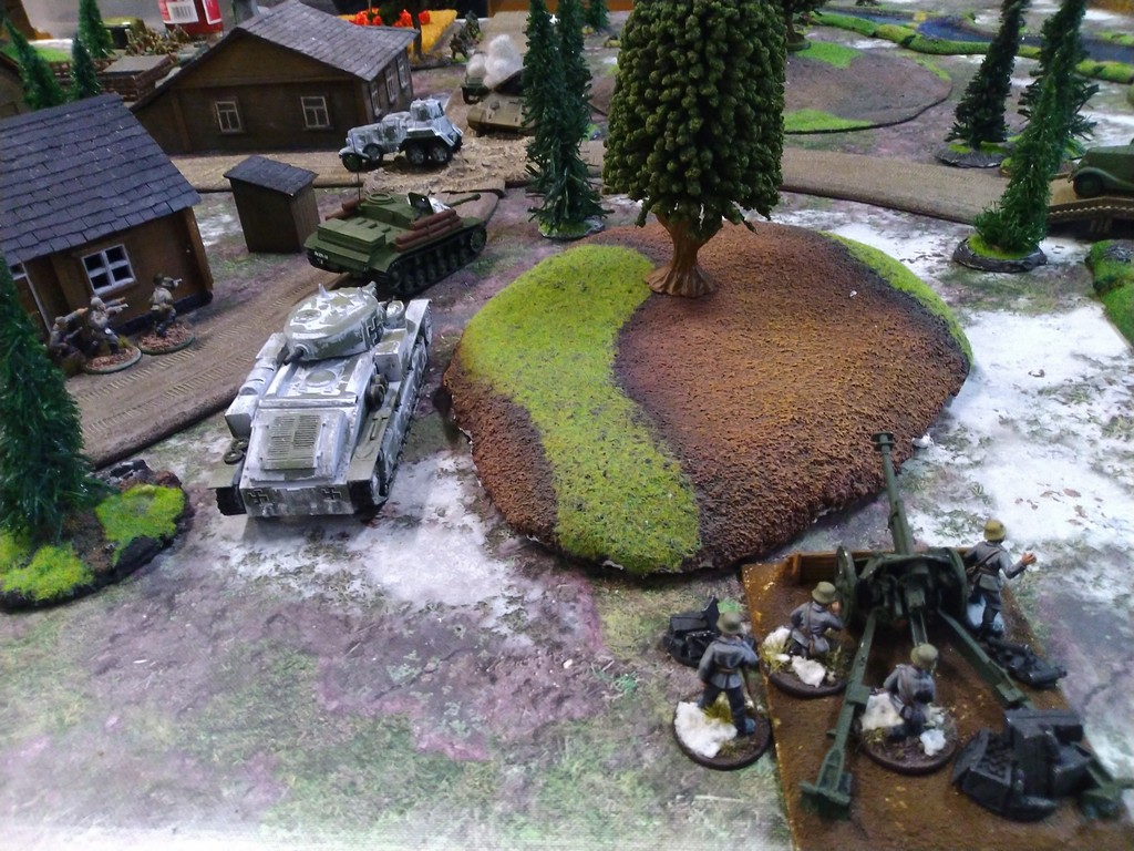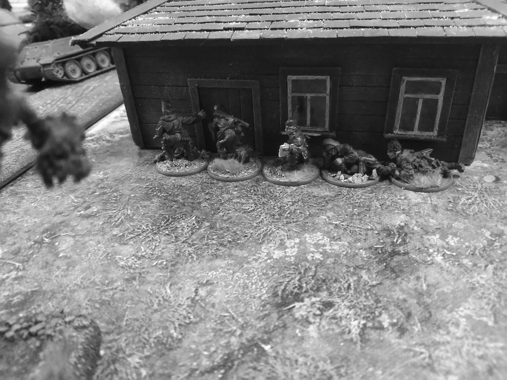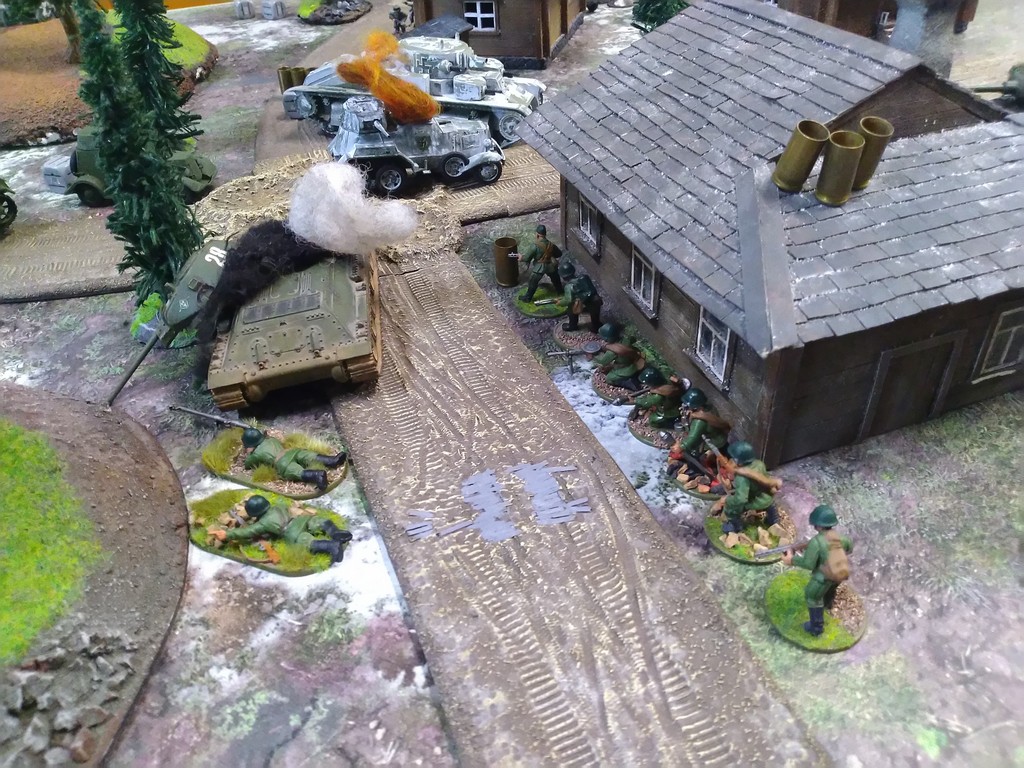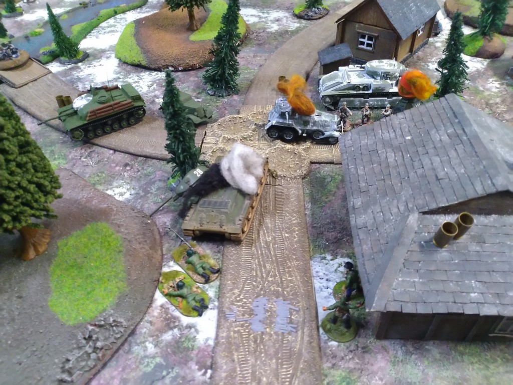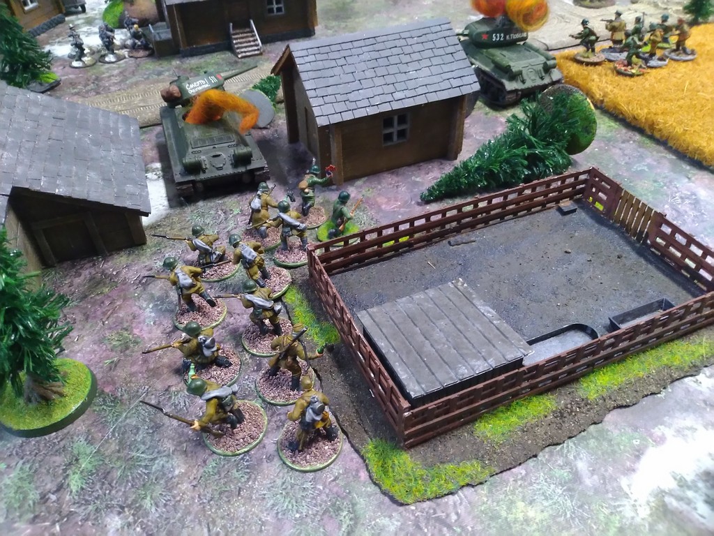 Scouts and few other units like artillery observer or snipers were placed on the board before battle begun. Opel Blitz – one of thousand delivered to Finnland by Germany. One of my favourite German truck.Remnant of Soviet recon force – T-34 with some important documents (worth 3 Victory Points for side controlling it at the end).Best infantry of Red Army – free unit.One of my T-34-85 named Moscow to honour home city of my friend Svetlana.On full speed Red Army advanced on right flank – engines of T-34-85 tanks working loudly.Finnish veterans move quickly thru the dense woodland area.For Mother Russia, forward comrades!Assault engineers, part of Red Army run after BA-64 scout car.Finns threw to action everything they had at hand.T-28, Sturmi and BA-10 arrived to stop Red Army advance.Tank on right has tankodesantniki squad – veterans of many fights.BA-64 crew realized what is going on.T-34-85 shoot down BA-10.BA-64 rushed and made panic in flamethrower team.Red Army advanced behind they T-34-85 tanks.Good shoot from panzerfaust eliminated T-34-85.Tankodesantniki dropped down when sniper shoot on they tank.Moscow pinned by enemy fire from many sources.Finnish infantry bravely charged on steel colosus…… and burned it with molotov coctails.To the ground said comrade seargant again.Close combat fight in the village on the right flank.Ivan one more bullet, hit that tank (Sturmi was tank destroyer – not a tank).Heavy wounded PTRD team wasn’t able to shoot once more.T-28 moved, but Soviet infantry layed down when it opened fire from all it mmg’s.At the end we counted points – it was a Draw.
