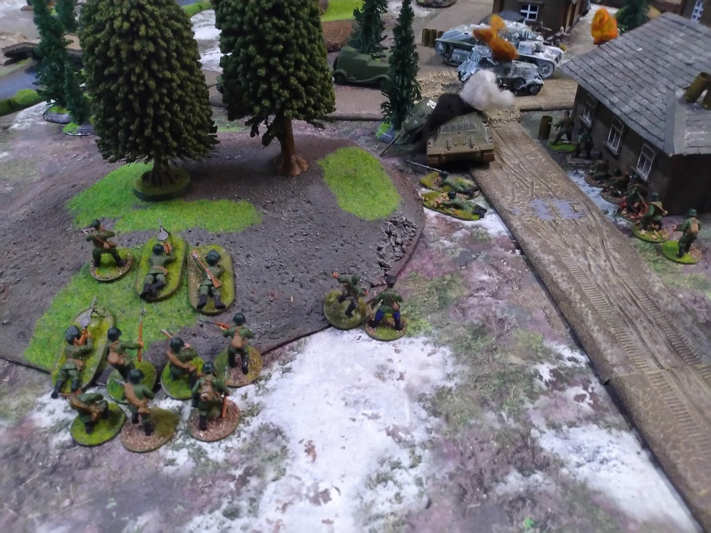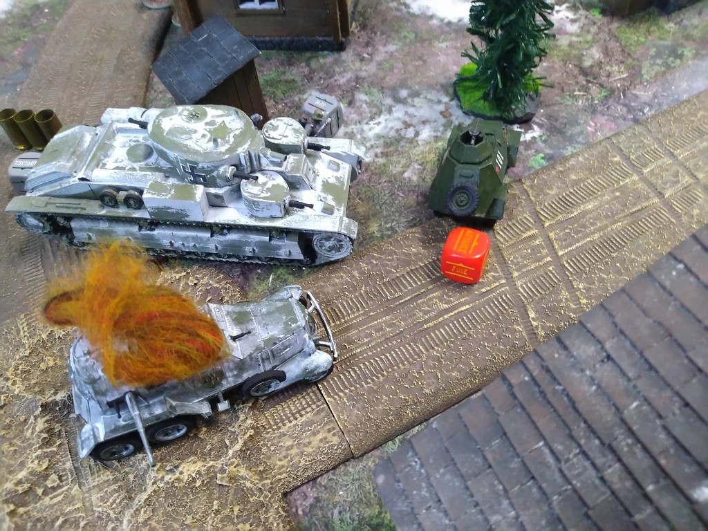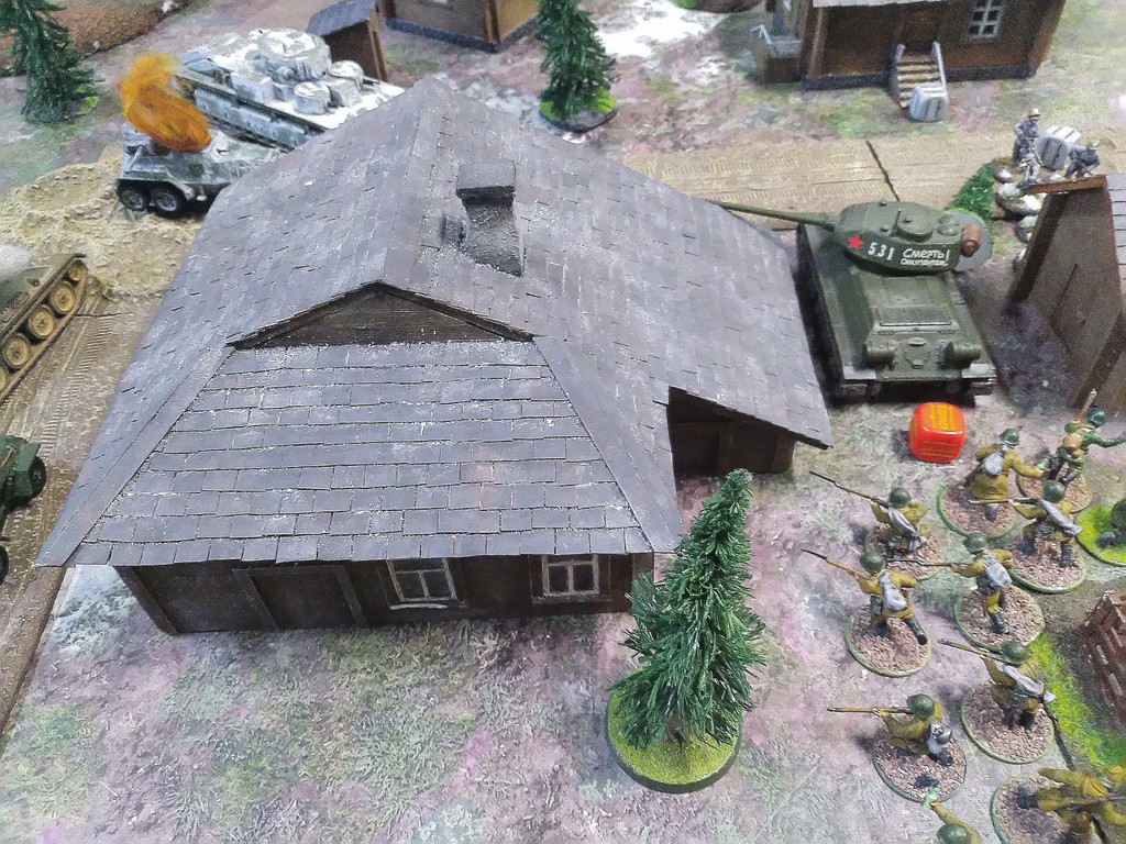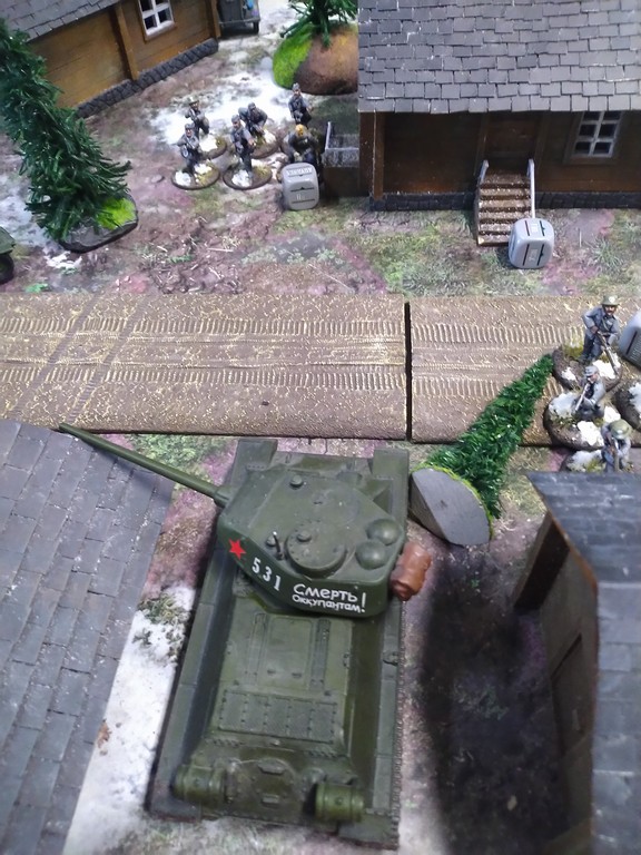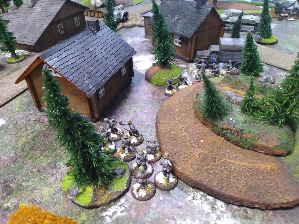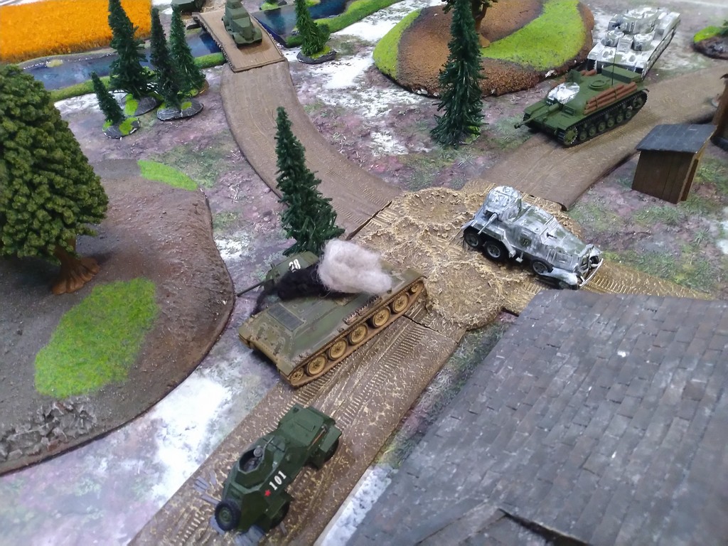 Scouts and few other units like artillery observer or snipers were placed on the board before battle begun. Opel Blitz – one of thousand delivered to Finnland by Germany. One of my favourite German truck.Remnant of Soviet recon force – T-34 with some important documents (worth 3 Victory Points for side controlling it at the end).Best infantry of Red Army – free unit.One of my T-34-85 named Moscow to honour home city of my friend Svetlana.On full speed Red Army advanced on right flank – engines of T-34-85 tanks working loudly.Finnish veterans move quickly thru the dense woodland area.For Mother Russia, forward comrades!Assault engineers, part of Red Army run after BA-64 scout car.Finns threw to action everything they had at hand.T-28, Sturmi and BA-10 arrived to stop Red Army advance.Tank on right has tankodesantniki squad – veterans of many fights.BA-64 crew realized what is going on.T-34-85 shoot down BA-10.BA-64 rushed and made panic in flamethrower team.Red Army advanced behind they T-34-85 tanks.Good shoot from panzerfaust eliminated T-34-85.Tankodesantniki dropped down when sniper shoot on they tank.Moscow pinned by enemy fire from many sources.Finnish infantry bravely charged on steel colosus…… and burned it with molotov coctails.To the ground said comrade seargant again.Close combat fight in the village on the right flank.Ivan one more bullet, hit that tank (Sturmi was tank destroyer – not a tank).Heavy wounded PTRD team wasn’t able to shoot once more.T-28 moved, but Soviet infantry layed down when it opened fire from all it mmg’s.At the end we counted points – it was a Draw.