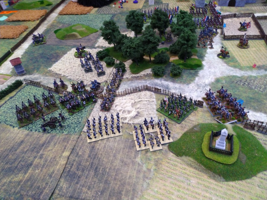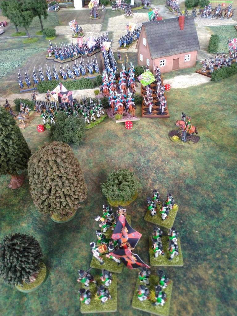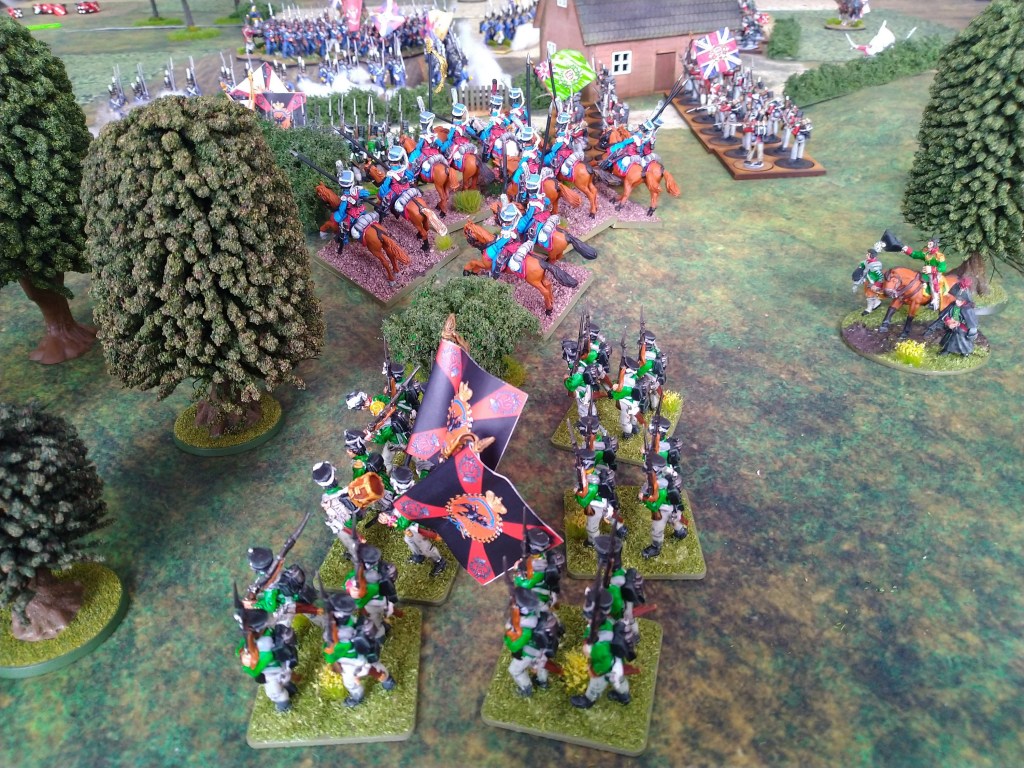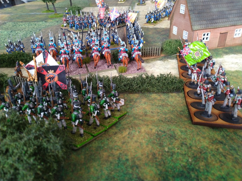 Württemberg on right flank of French coalition.French in the middle and left flank of French coalition.Russian infantry brigade in the middle. Russian in the middle and United Kingdom on right.French Hussars.Württemberg advance when Russian brigade stay and watch.British advance towards French.95th took positions in the forest.French advance towards British. Russian artillery open fire, but black powder was wet – someone sabotaged it before battle started. Russian brigade composed of Polish Uhlans recruited from Polish nobility and Don Cossacs arrived.French took village „Badrolls” before Russians were able to secure it.Russians Jagers opened fire on advancing Württemberg troops.Polish-Cossacks cavalry tried to change situation on the field.Cavalry of both sides contested on British-Russian right flank.Bayonnets fixed – Russian infantry charged Württemberg batallion. Beautiful Kris Württemberg. Russian infantry advance to mere village „Badrolls” – symbol of British and Russian defeat. Russian batallion took ground after winning in hand to hand combat. A lot of fire and French were still in the famous now village. Situation in the middle where both sides shell each other with artillery. French cuirassiers charged Russian batallion and…… broke it in one charge.Russian infantry prepare to stand they ground against heavy French cavalry. Even though soldiers as Russian infantry was weren’t able to held they ground and did step back, artillery limbered.Cavalry clash on Allied right flank.Shattered Russian brigade still fight.Polish uhlans vs French cuirassiers.Retreat of British hussars. Moment when I losed my infantry brigade, as they morale went pretty low.Plus one more brigade was broken.My allied general Tomas held his ground, but enemy took all key positions.