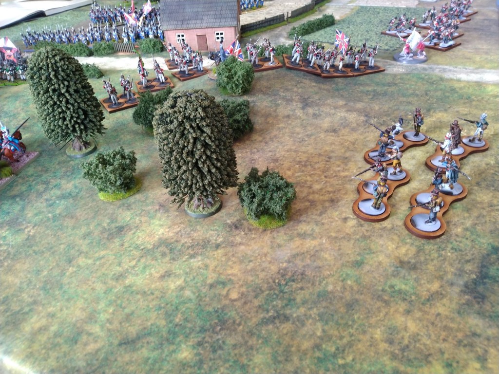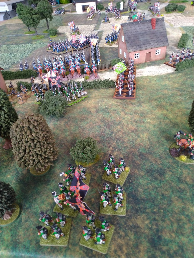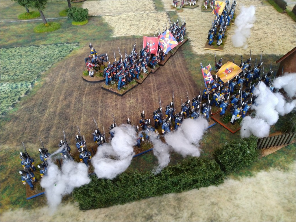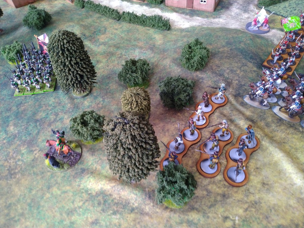 Russian batallion advance toward crossroads with supporting unit of cavalry. Near church French charged on bayonnetes. In the middle – light infantry tried to spread Chaos on French right flank. Skirmishing units were chased from forest in heavy hand to hand combat.
