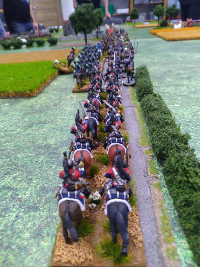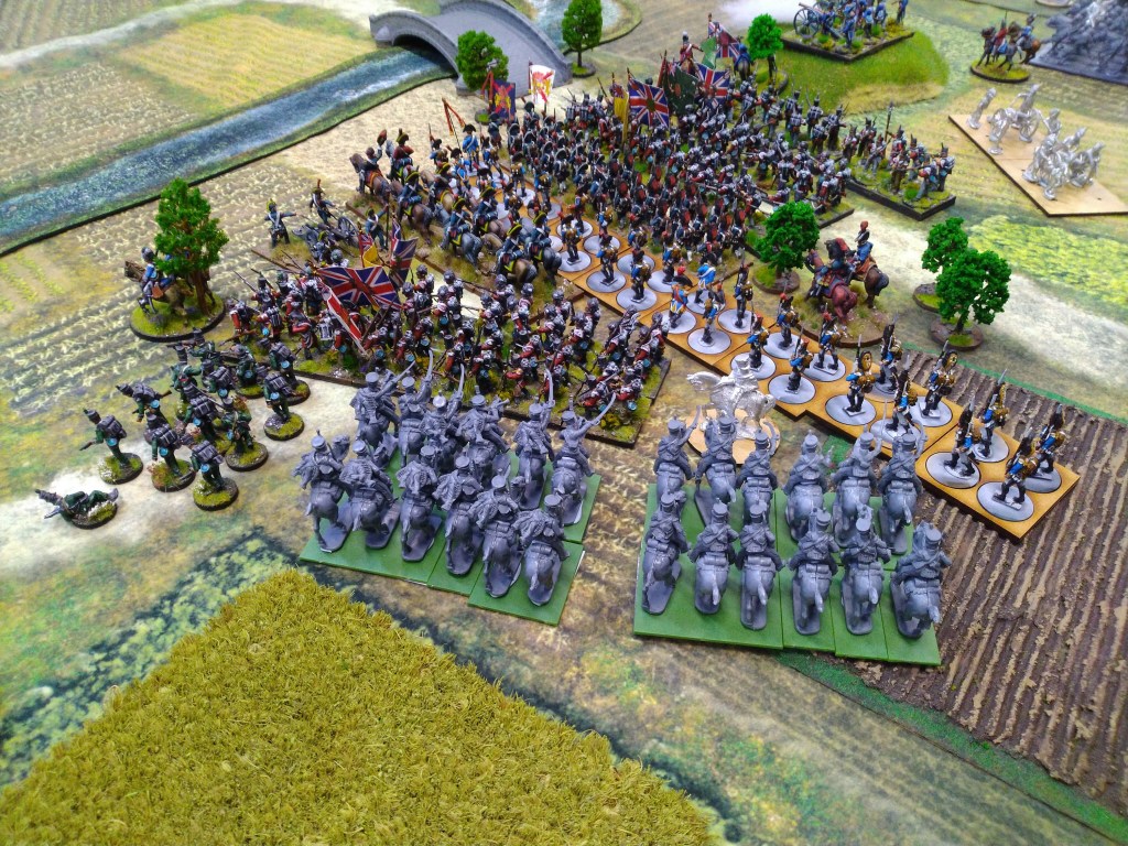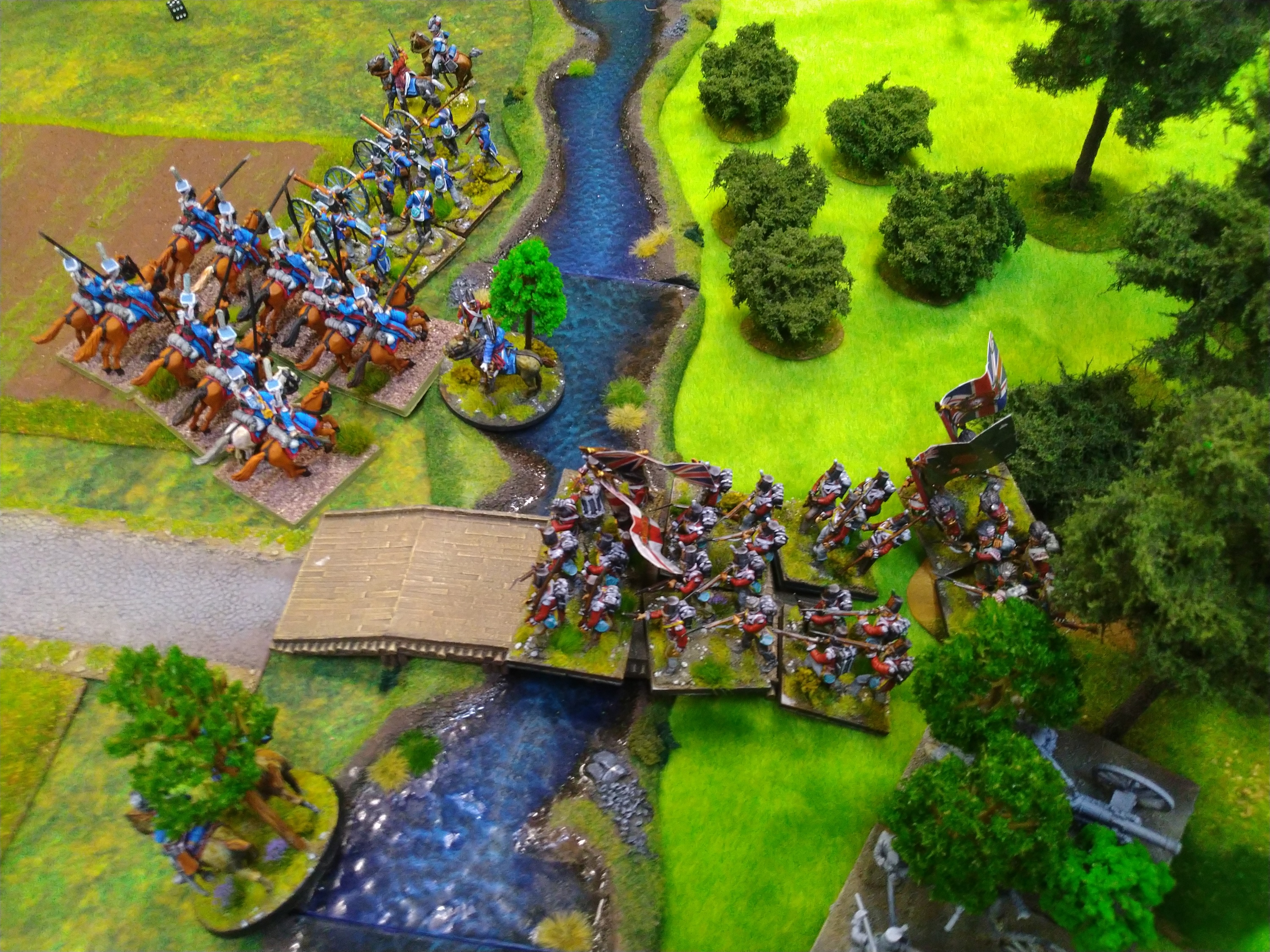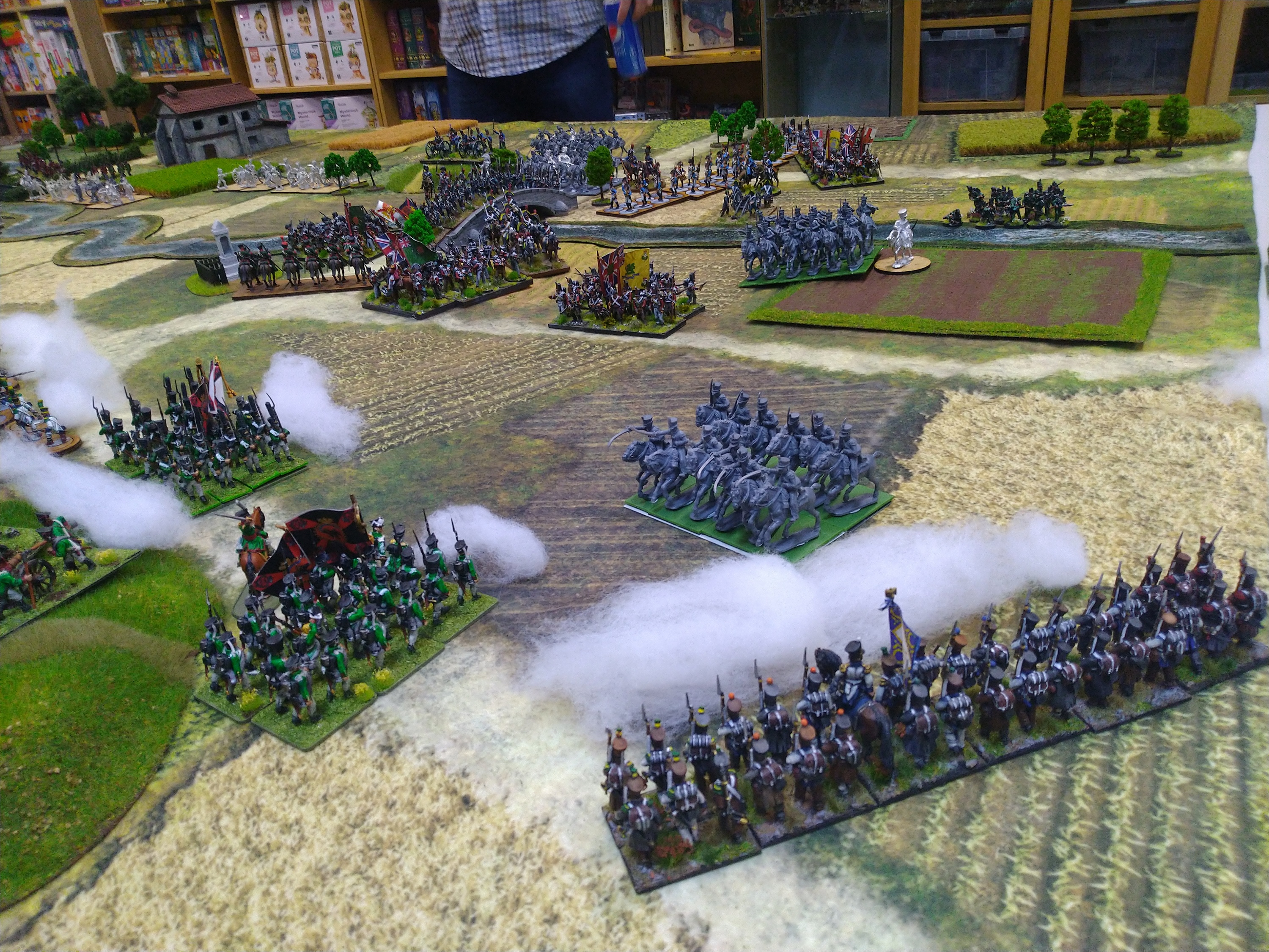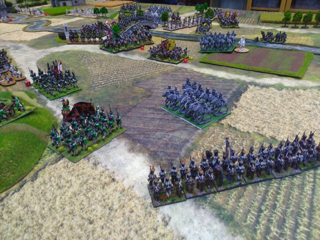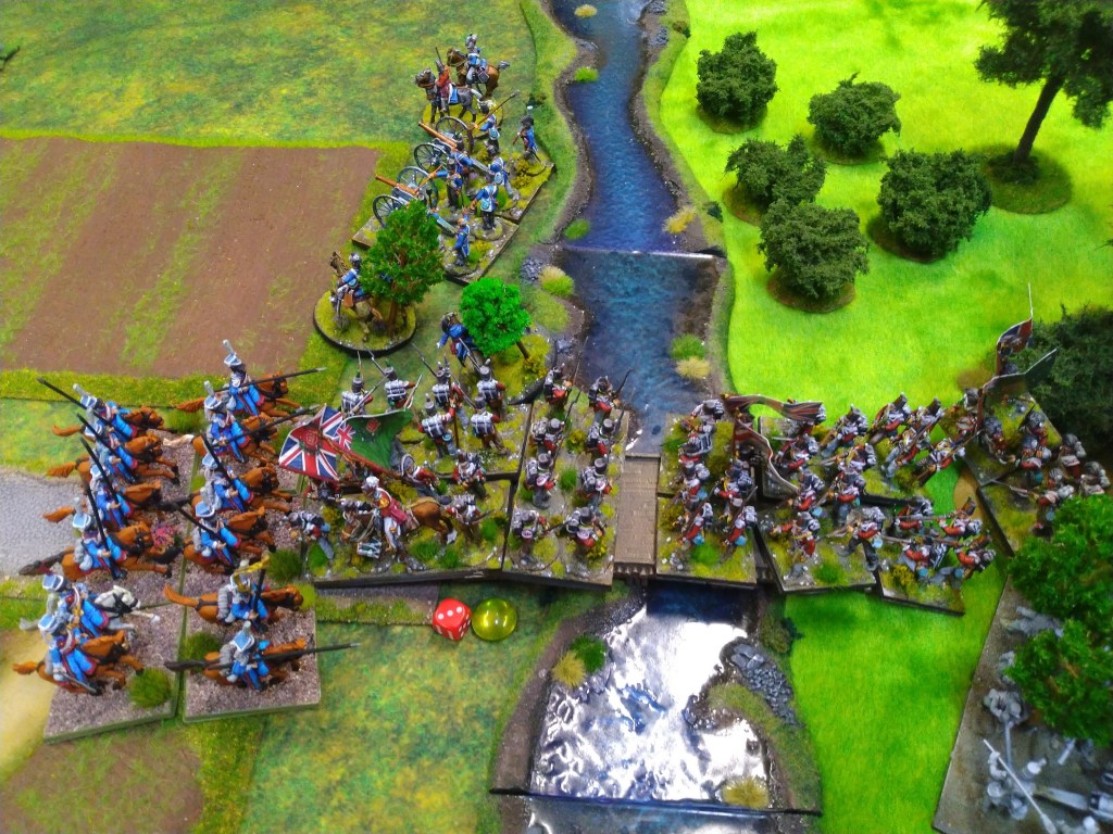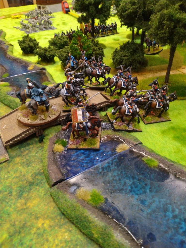 Both sides started in opposite corners of the table – here objectives – two stone bridges. Allied cavalry appeard first, British hussars and Polish Uhlans loyal to the Tzar.Our plan was to cross the river and secure bridge for infantry.French cavalry and horse artillery.Both sides visible next to great coffee served in Bolter Cafe.Mixed brigade of Portugal, Russian and Spanish. Had to finish bases and some details of my Russian Jagers.French cavalry advances toward Allied cavalry which crossed river.French infantry march to the other bridge.Combined Portugal, Russian and Spanish brigade march slowly.French cavalry formed into combat formation.Allied cavalry formed to fight as well.British are coming.Cuirassiers securing flank.First clash beetwen cavalry.Allied cavalry losed some combats.British advances forward.On the opposite side French march in the column to take position.Several French units are too much for this bridge.Most of our cavalry regiments ceased to exists, many Uhlans were lost in the river.French cavalry rule over the battlefield. French cavalry manged to cross water in the middle – coming in sight of allied infantry.