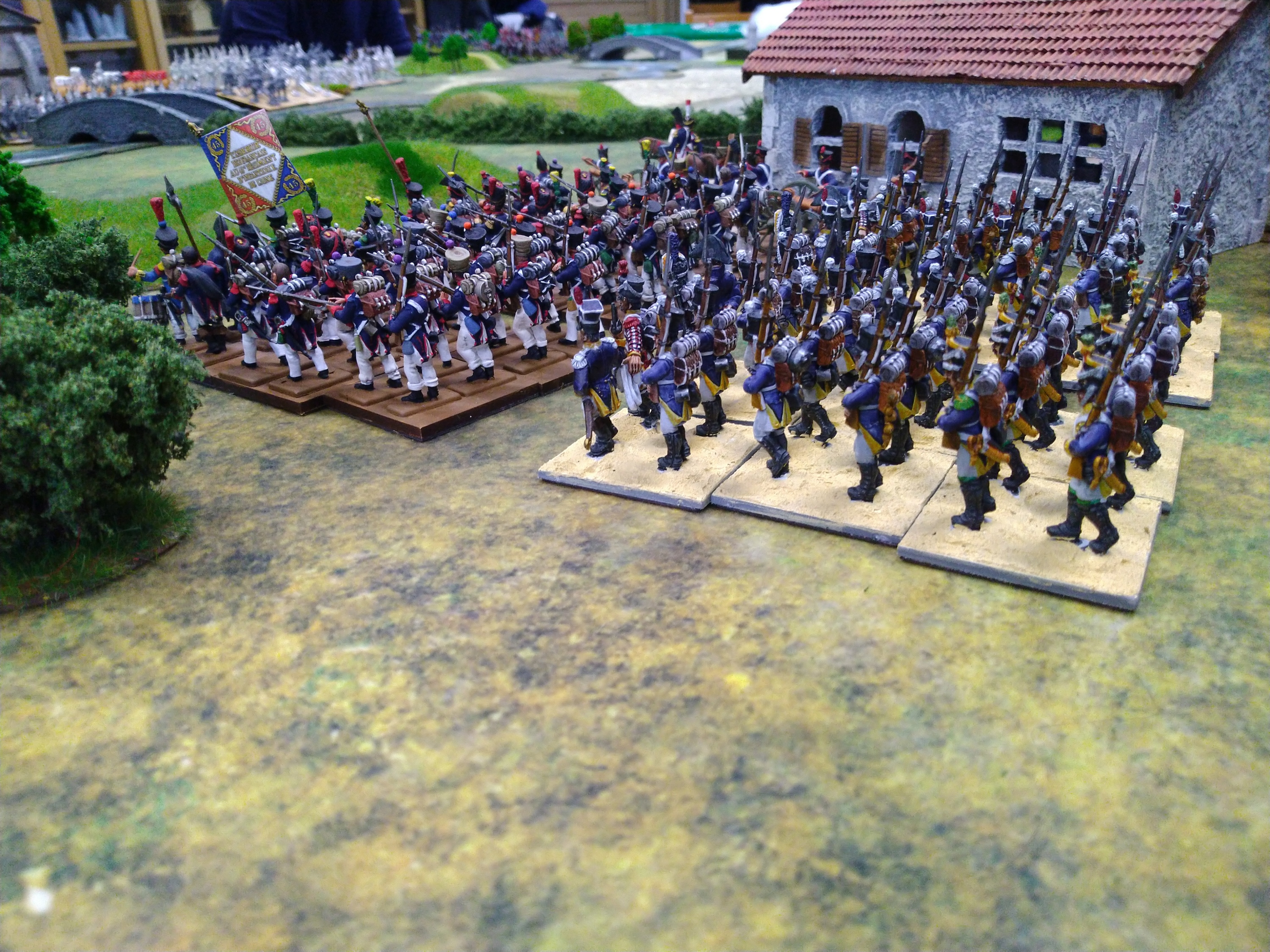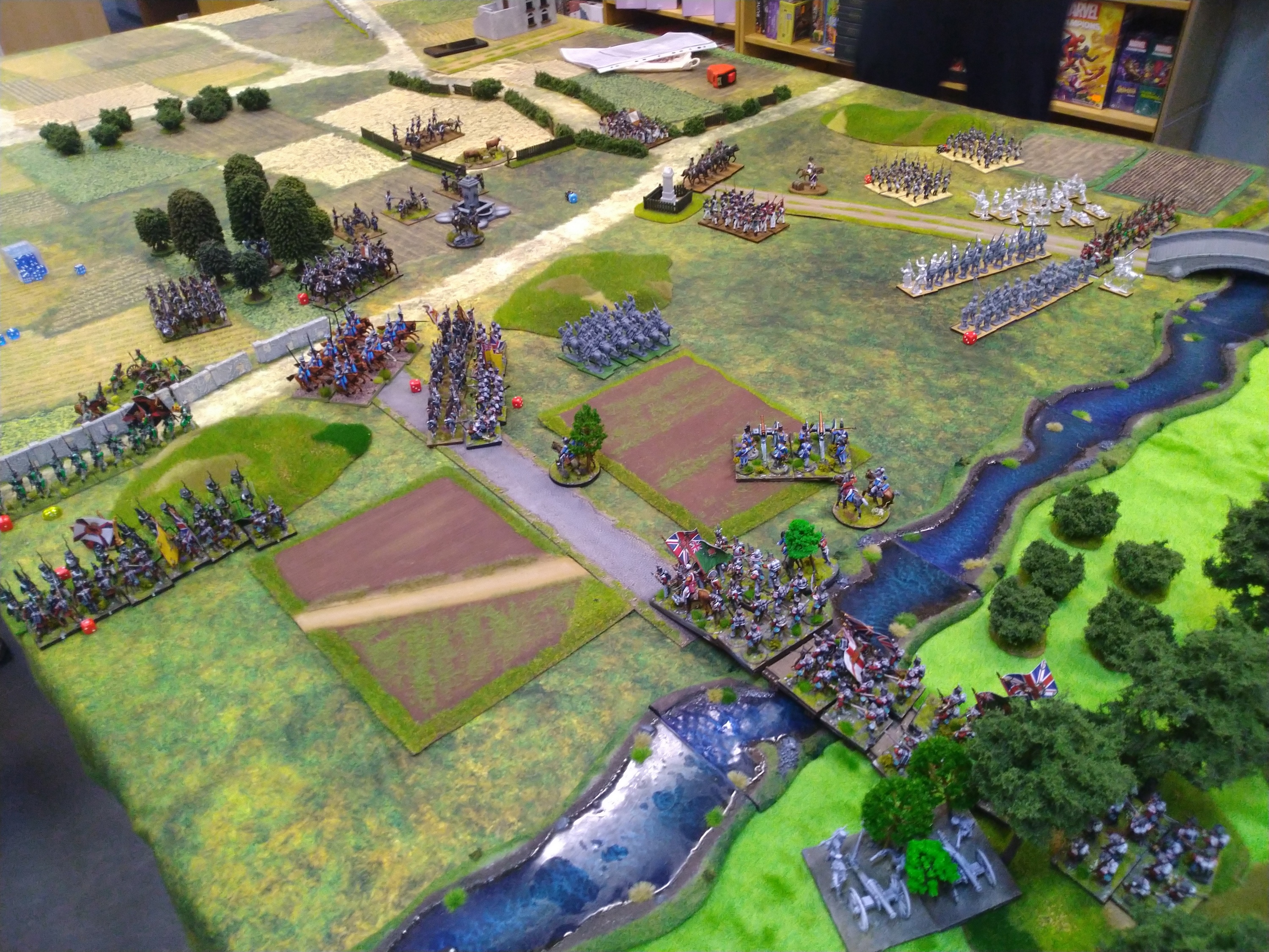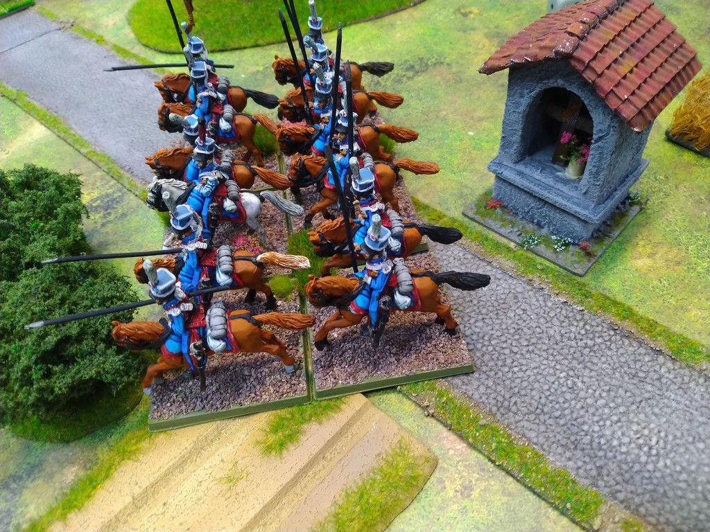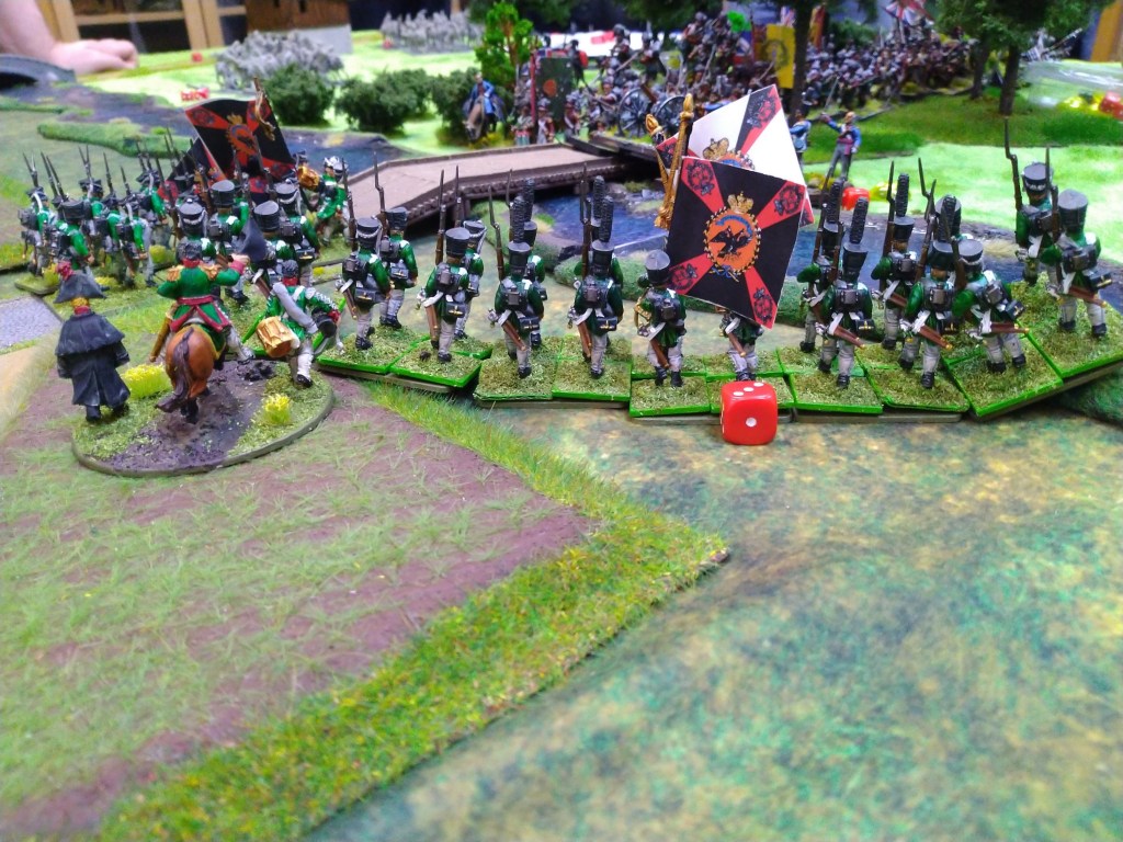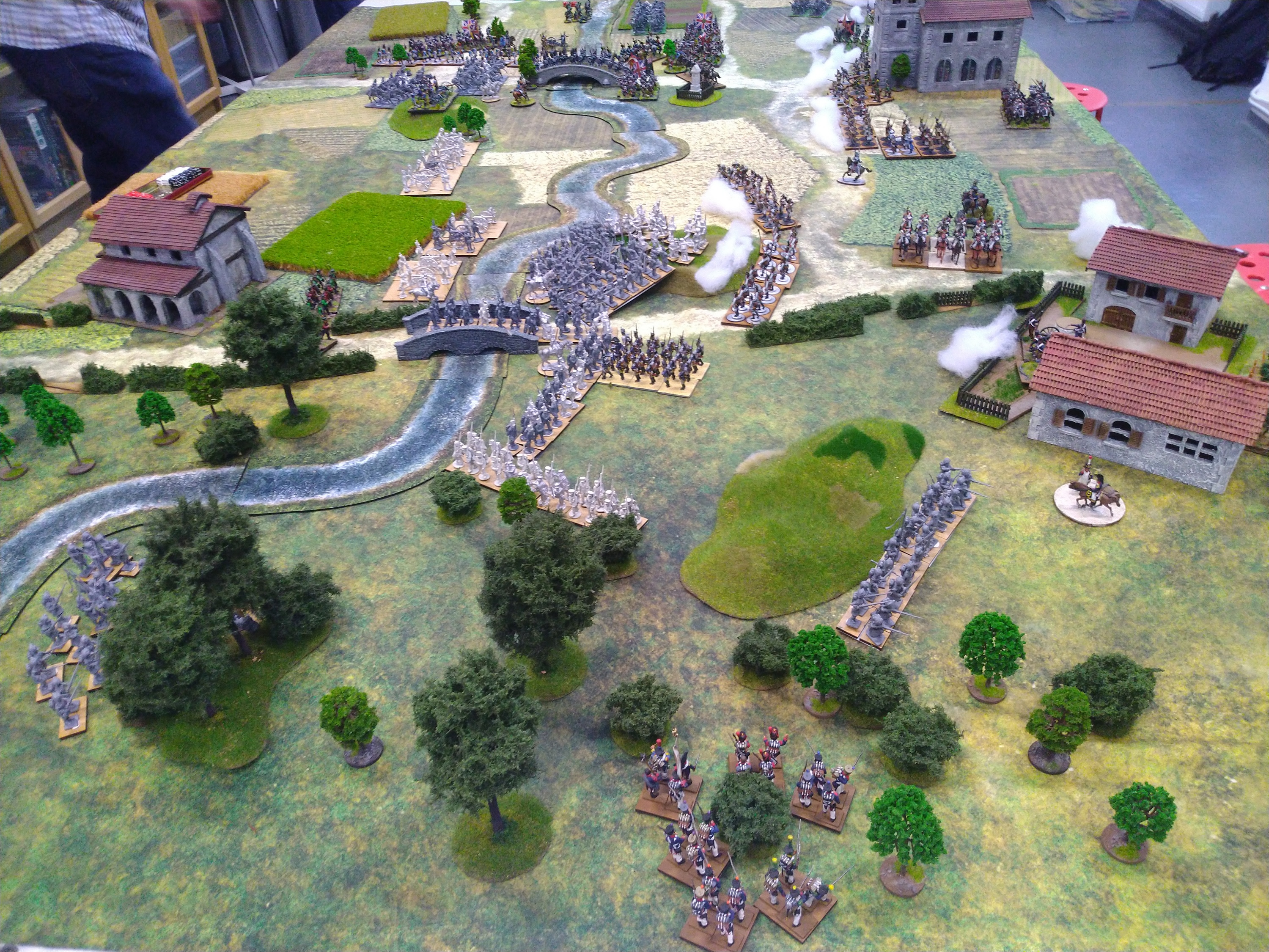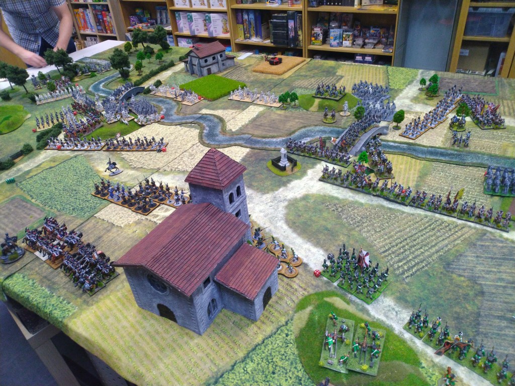 Both sides started in opposite corners of the table – here objectives – two stone bridges. Allied cavalry appeard first, British hussars and Polish Uhlans loyal to the Tzar.Our plan was to cross the river and secure bridge for infantry.French cavalry and horse artillery.Both sides visible next to great coffee served in Bolter Cafe.Mixed brigade of Portugal, Russian and Spanish. Had to finish bases and some details of my Russian Jagers.French cavalry advances toward Allied cavalry which crossed river.French infantry march to the other bridge.Combined Portugal, Russian and Spanish brigade march slowly.French cavalry formed into combat formation.Allied cavalry formed to fight as well.British are coming.Cuirassiers securing flank.First clash beetwen cavalry.Allied cavalry losed some combats.British advances forward.On the opposite side French march in the column to take position.Several French units are too much for this bridge.Most of our cavalry regiments ceased to exists, many Uhlans were lost in the river.French cavalry rule over the battlefield. French cavalry manged to cross water in the middle – coming in sight of allied infantry.