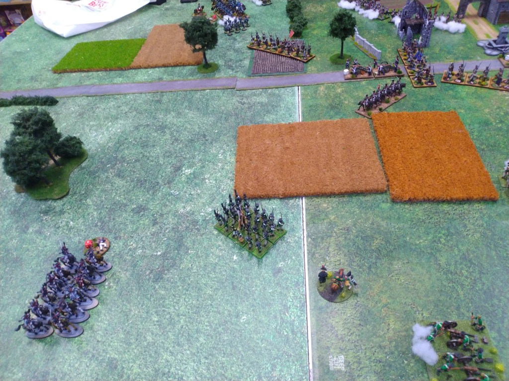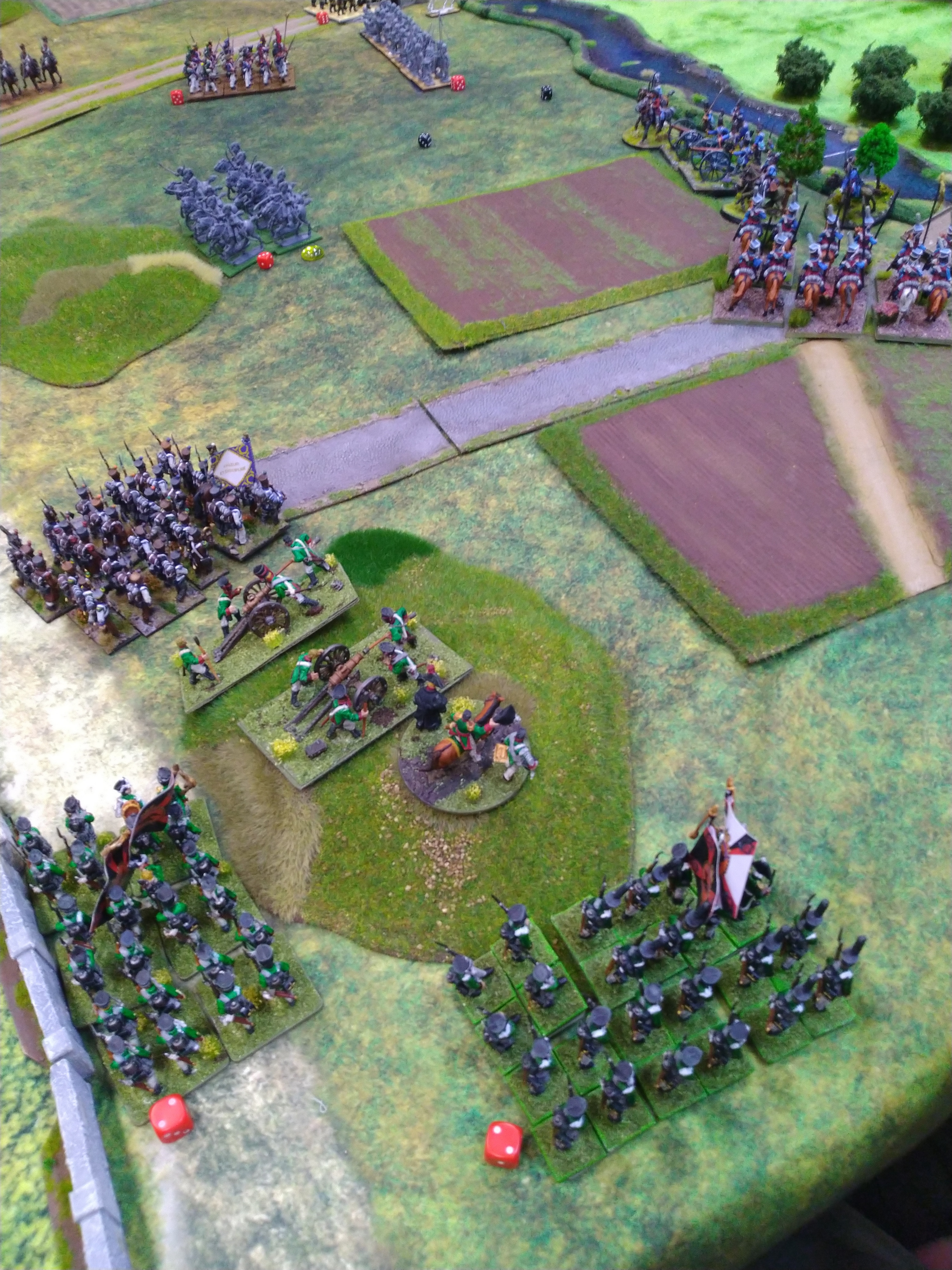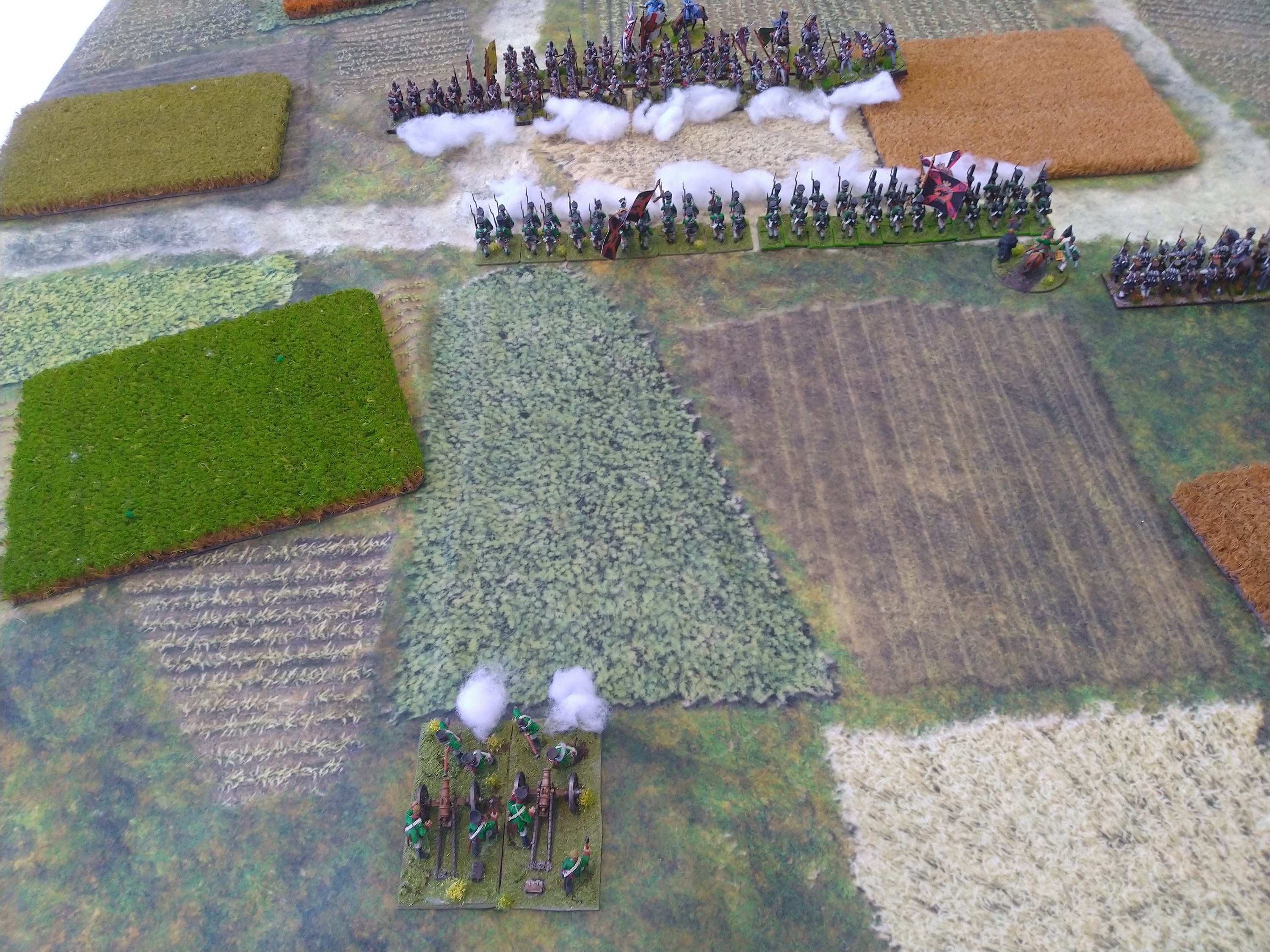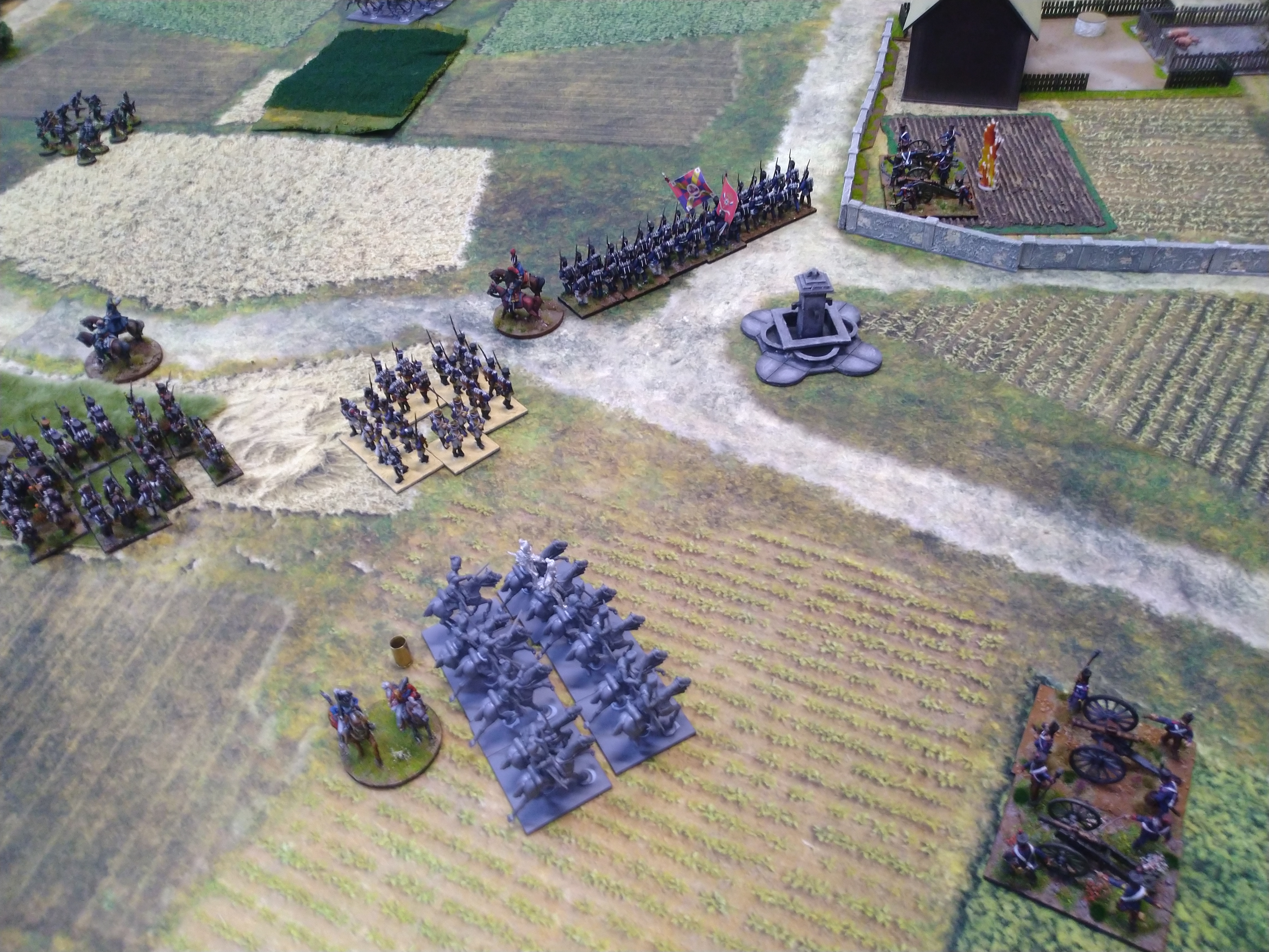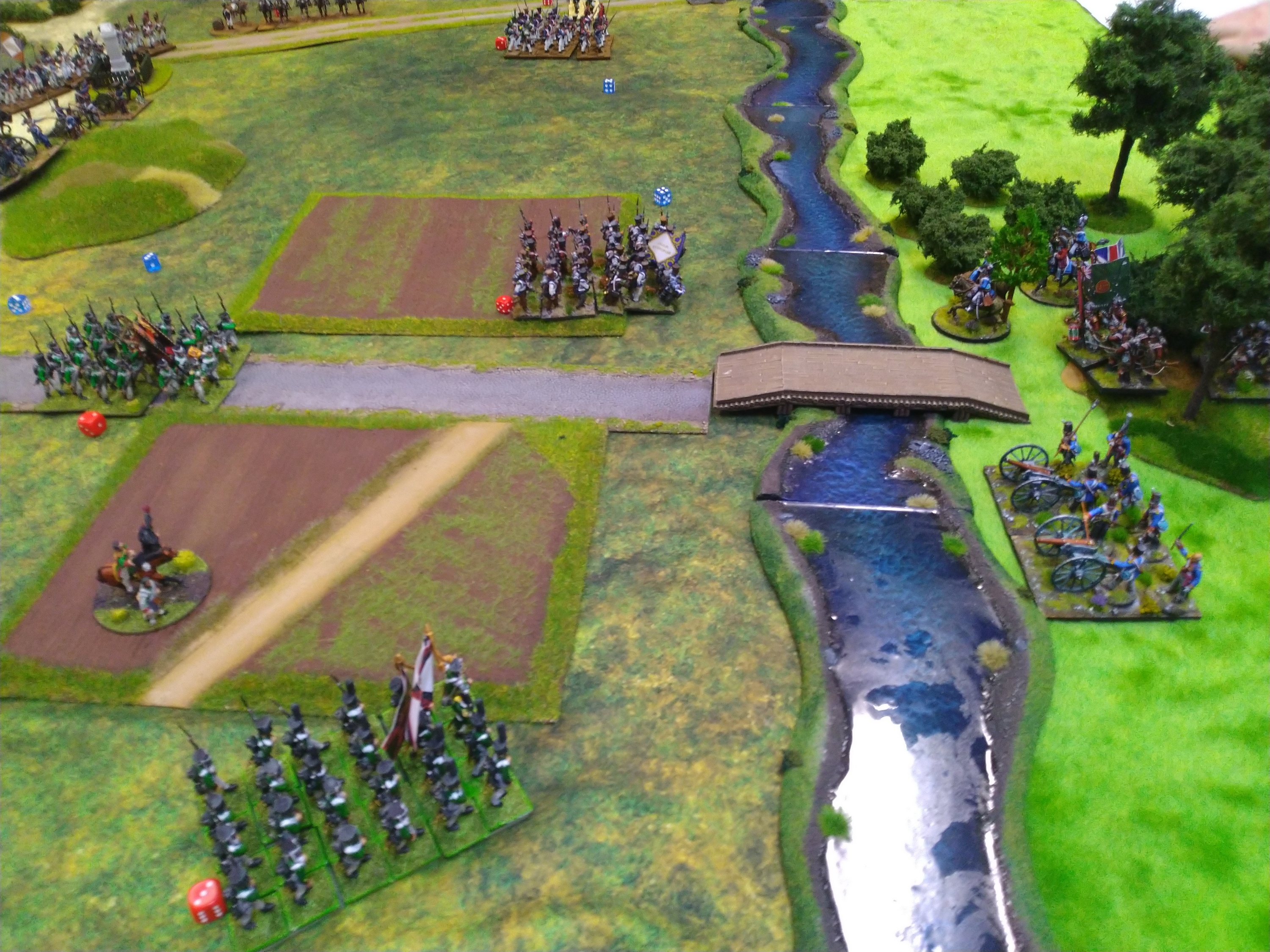 Adams Polish Vistula Legion.Russians advance to take enemy guns.French column during march.All on one. Single Russian battalion stood they ground.French cavalry ride on the British wing.Russians battalions marched on the left and right with artillery support.French cavalry charged on Russian artillery.Artillerist runned away for they lives.Some hand to hand combat in the middle.I thought it’s the end of my batallion, but…… but it was end of one French unit which turn it tail and fled.