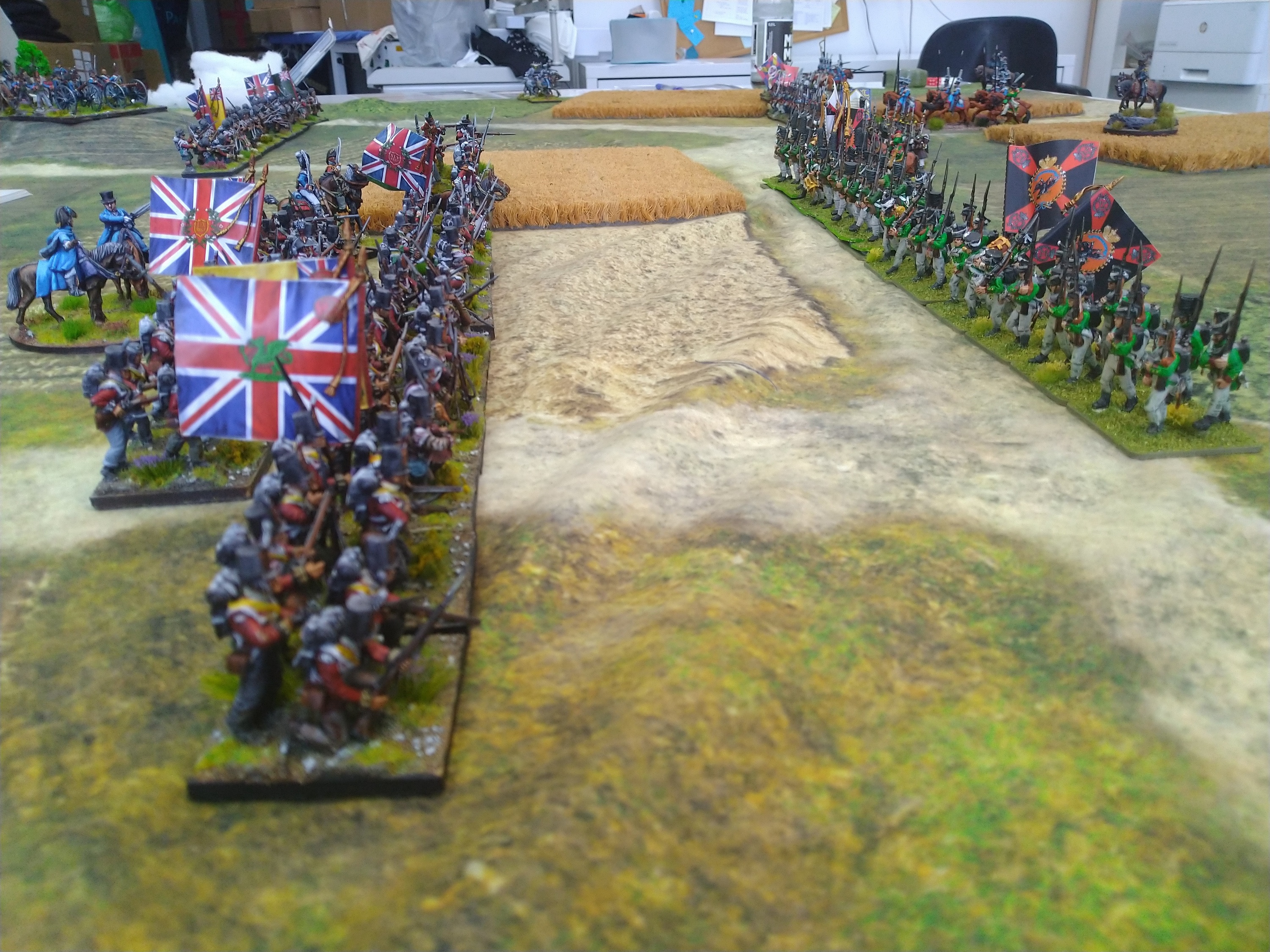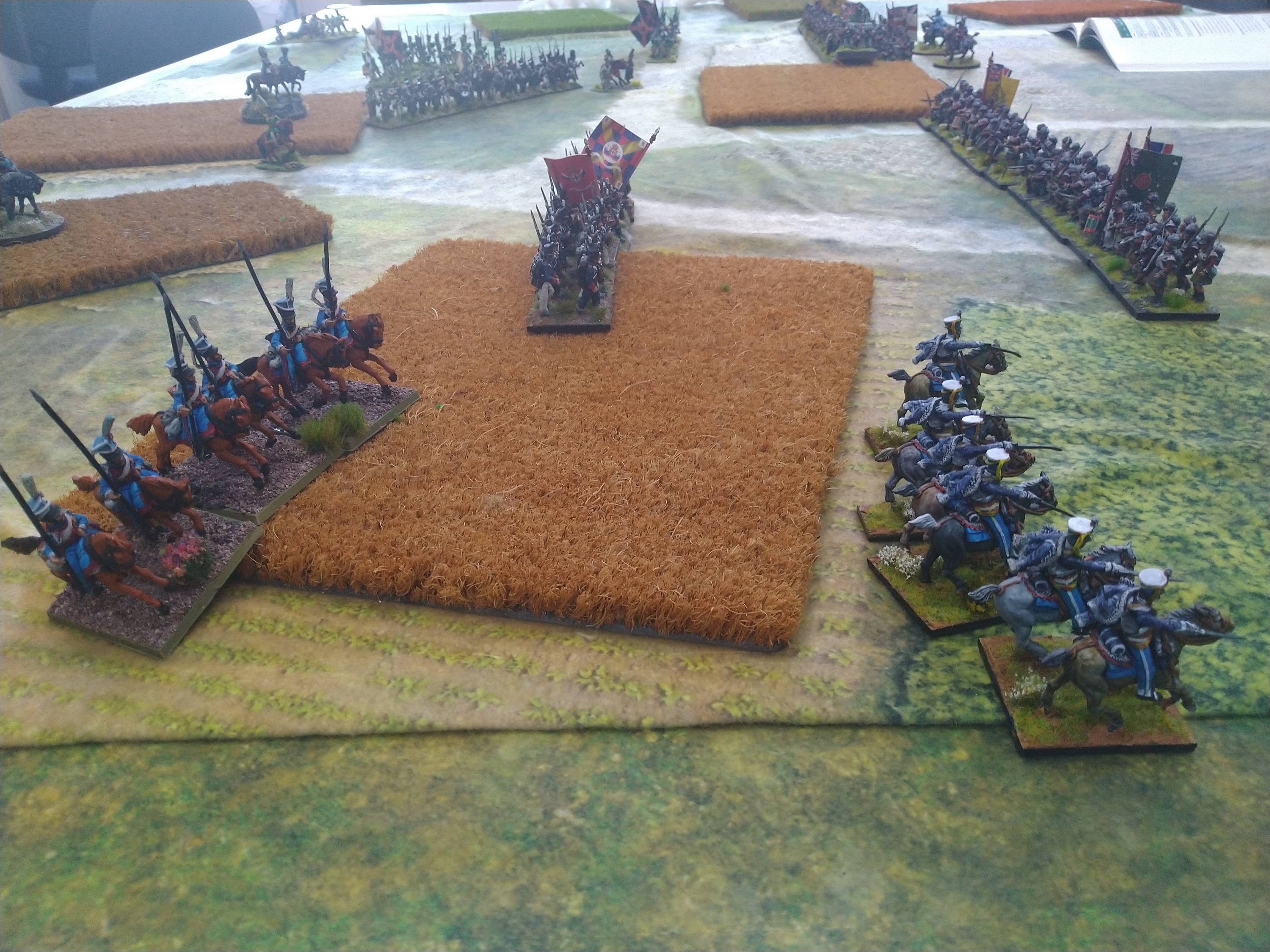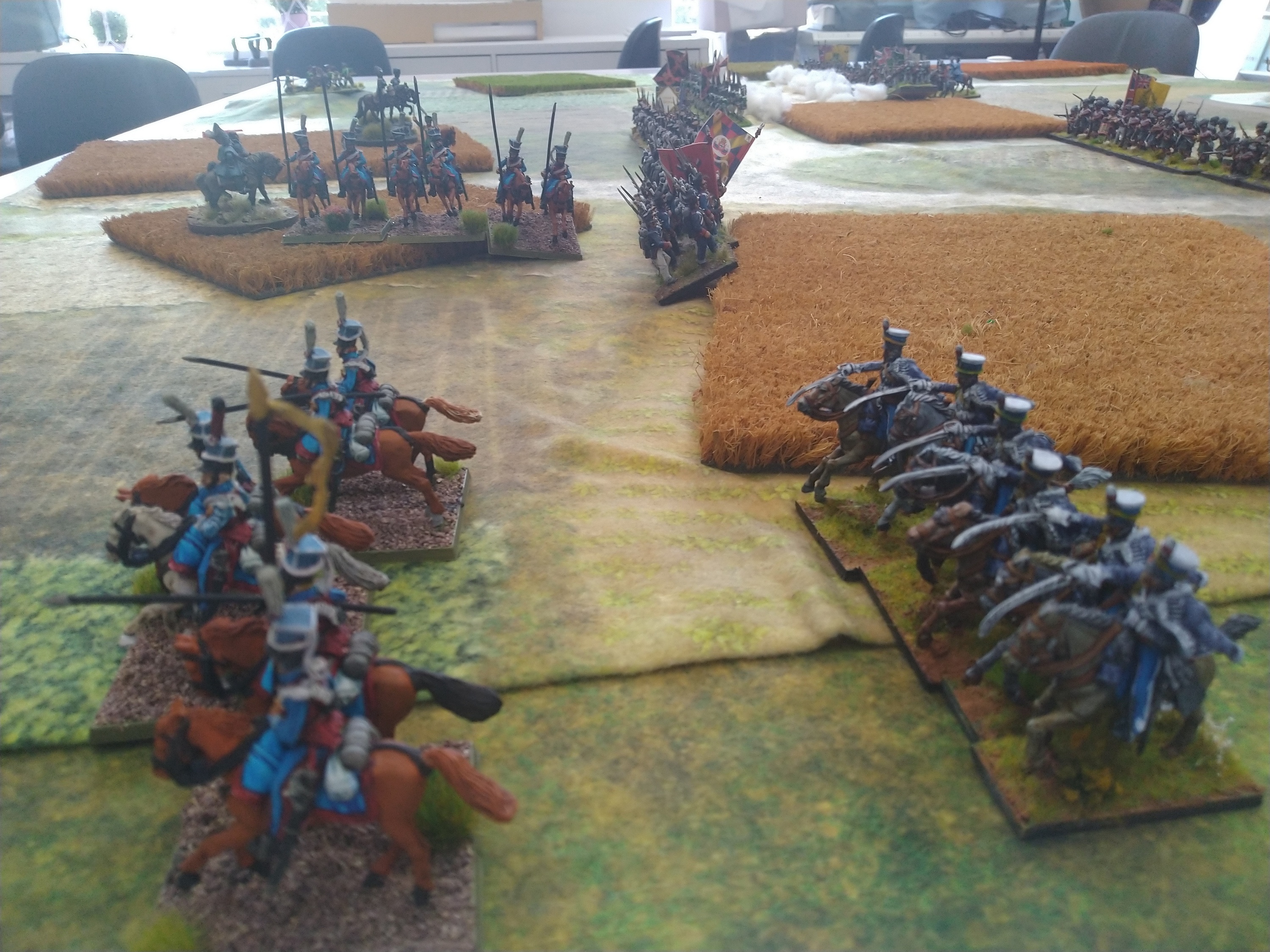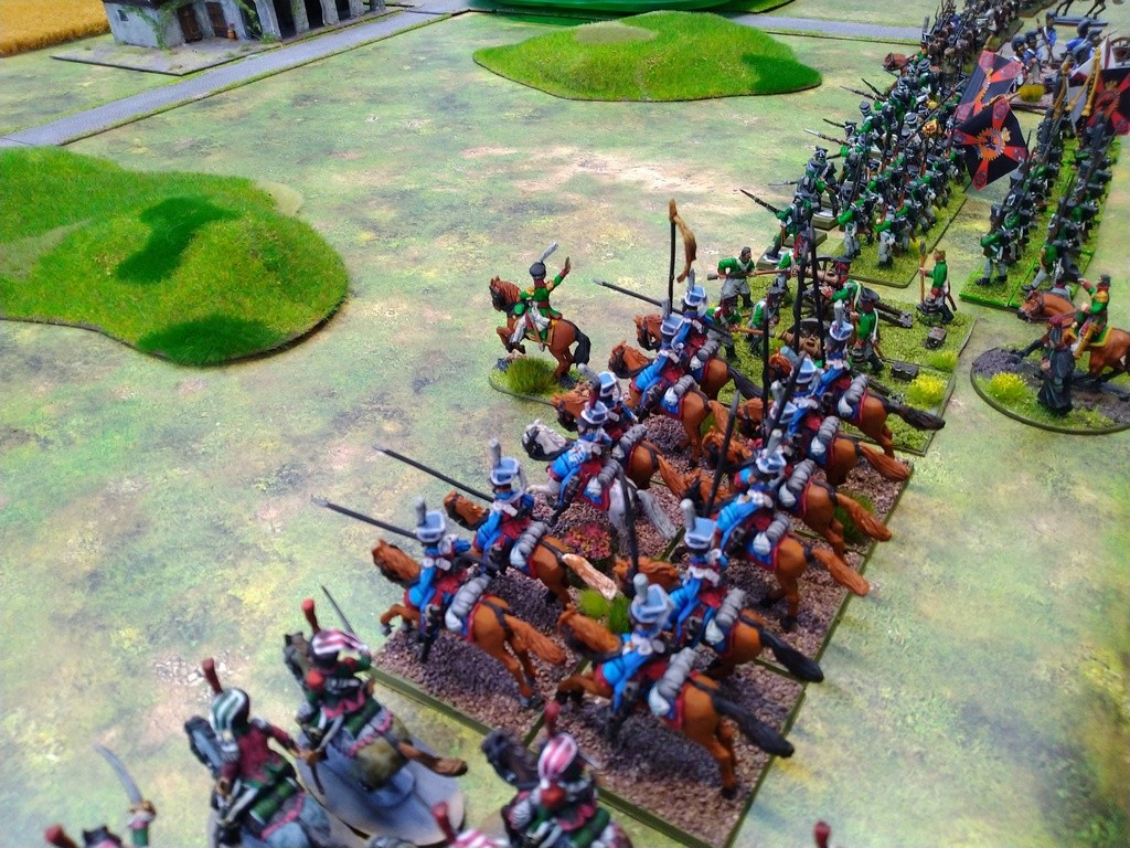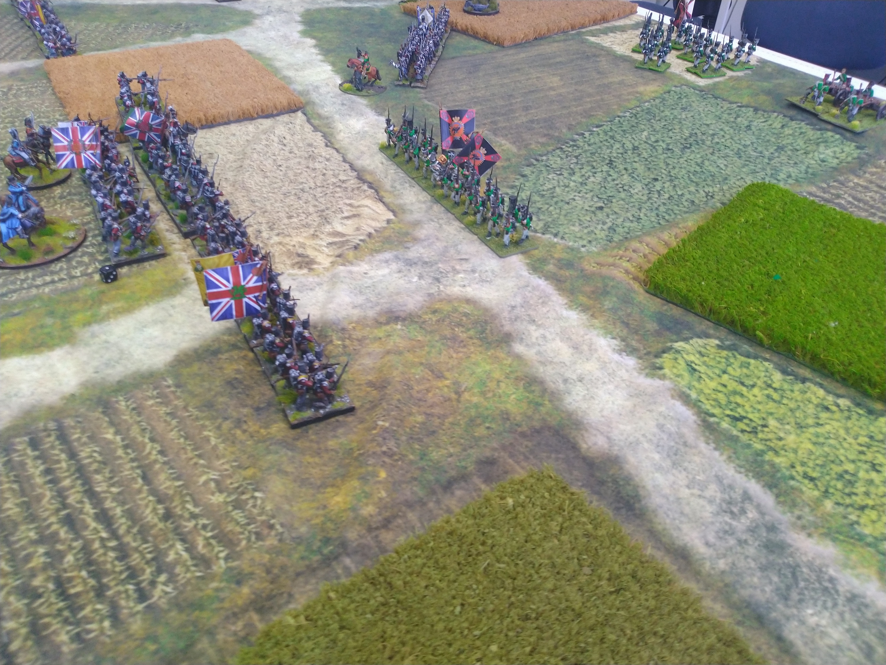 Infantry in line move slower.Cavalry rode ahead.Several lucky cannonballs panicked Polish Uhlans.British against Russians.Cavalry clashes as Polish lancers countercharge British hussars.Russian batallion finally losed they nerves and fled.Another regiment of Uhlans broke hussars.One of the British batallions broke from Russian infantry and artillery fire.Another batallion broken by heavy artillery and muskeet fire.
