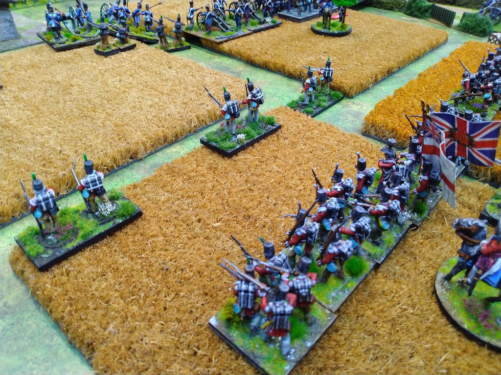 We played on standard 48″x72″ table representing some crossroads and different types of fields – some of them were difficult terrain limiting movement to half. Everyone in those armies were regular (excluding British infantry), gun batteries were Elite. Both sides had four regiments each and up to four dices from adiutants.