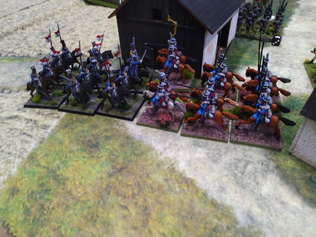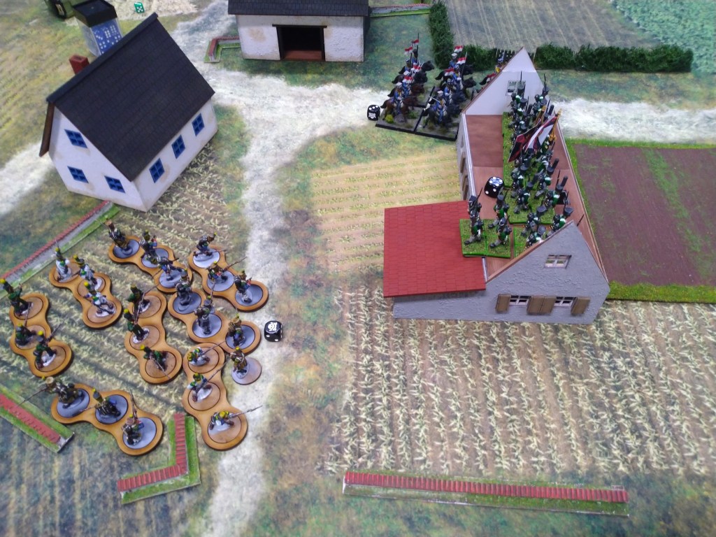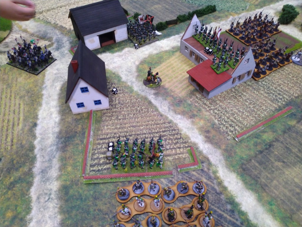 Shrine and village on the left were objectives.One of the objectives.Russian brigade comming with Jagers in front.Another part of the same Russian brigade. Kuba’s Prussians.Kriss Wittemberg’s.Württemberg’s general.Austrian-Russian right flank composed of Russian brigades – some batallions are borrowed.Württemberg advance on the German states left flank.Russians trying to capture supply cart.Two battalions and artillery covering the middle.On the other flank Austrians meet Prussians.German states artillery set up on the hill in the middle.Russian artillery trying to engage German states artillery. Polish Uhlans lead a way supported by Don Cossacs.Württembergs cavalry, including cuirrasiers.Württemberg’s infantry batallions marched toward Russians lines.Austrian infantry batallions engage Prussians on our left flank.Russian infantry step back…… and send batallion to defend village.While in center two batallions try to advance and outflank Württemberg brigade.„Bayonnets fixed!” – Austrians charged on left flank…while they cavalry maneuver to outflank Prussians brigades.Heavy fighting beetwen uhlans and cuirrasiers.Prussians got loses and fall back after heavy fighting with Austrians.Outnumbered and with a lot of casultaties Russian batallion held village against whole Württembergs brigade.Cossacks retreated after fight with remnants of cuirrasier unit.