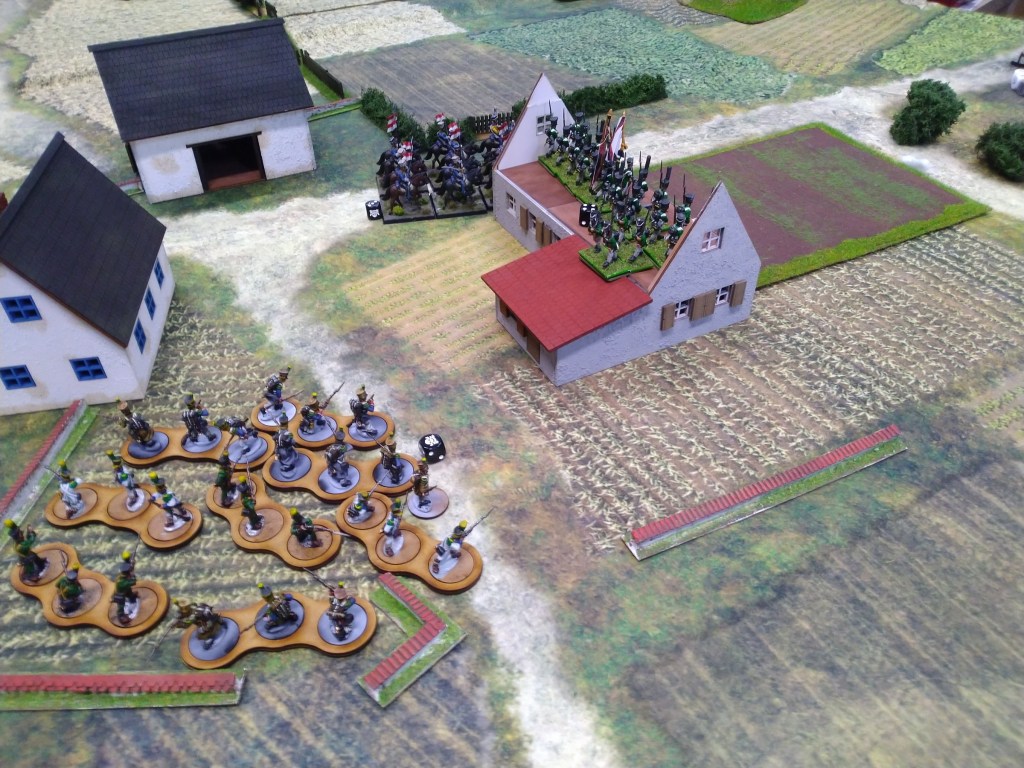 Württemberg on right flank of French coalition.French in the middle and left flank of French coalition.Russian infantry brigade in the middle. Russian in the middle and United Kingdom on right.French Hussars.Württemberg advance when Russian brigade stay and watch.British advance towards French.95th took positions in the forest.French advance towards British. Russian artillery open fire, but black powder was wet – someone sabotaged it before battle started. Russian brigade composed of Polish Uhlans recruited from Polish nobility and Don Cossacs arrived.French took village „Badrolls” before Russians were able to secure it.Russians Jagers opened fire on advancing Württemberg troops.Polish-Cossacks cavalry tried to change situation on the field.Cavalry of both sides contested on British-Russian right flank.Bayonnets fixed – Russian infantry charged Württemberg batallion. Beautiful Kris Württemberg. Russian infantry advance to mere village „Badrolls” – symbol of British and Russian defeat. Russian batallion took ground after winning in hand to hand combat. A lot of fire and French were still in the famous now village. Situation in the middle where both sides shell each other with artillery. French cuirassiers charged Russian batallion and…… broke it in one charge.Russian infantry prepare to stand they ground against heavy French cavalry. Even though soldiers as Russian infantry was weren’t able to held they ground and did step back, artillery limbered.Cavalry clash on Allied right flank.Shattered Russian brigade still fight.Polish uhlans vs French cuirassiers.Retreat of British hussars. Moment when I losed my infantry brigade, as they morale went pretty low.Plus one more brigade was broken.My allied general Tomas held his ground, but enemy took all key positions.
