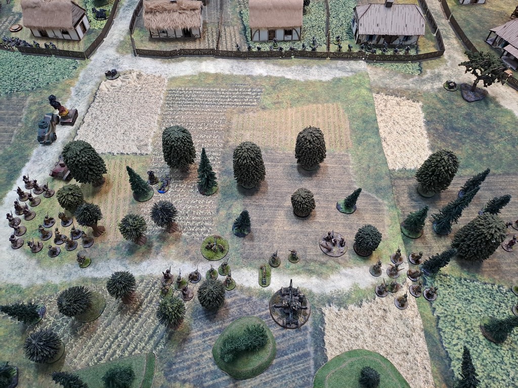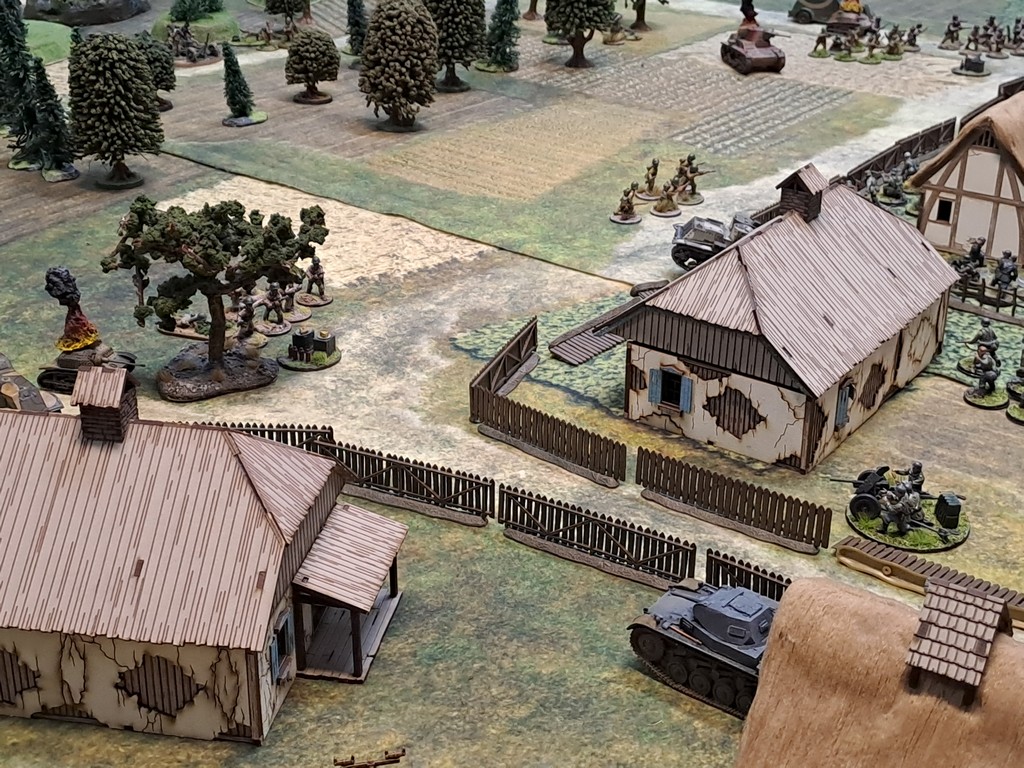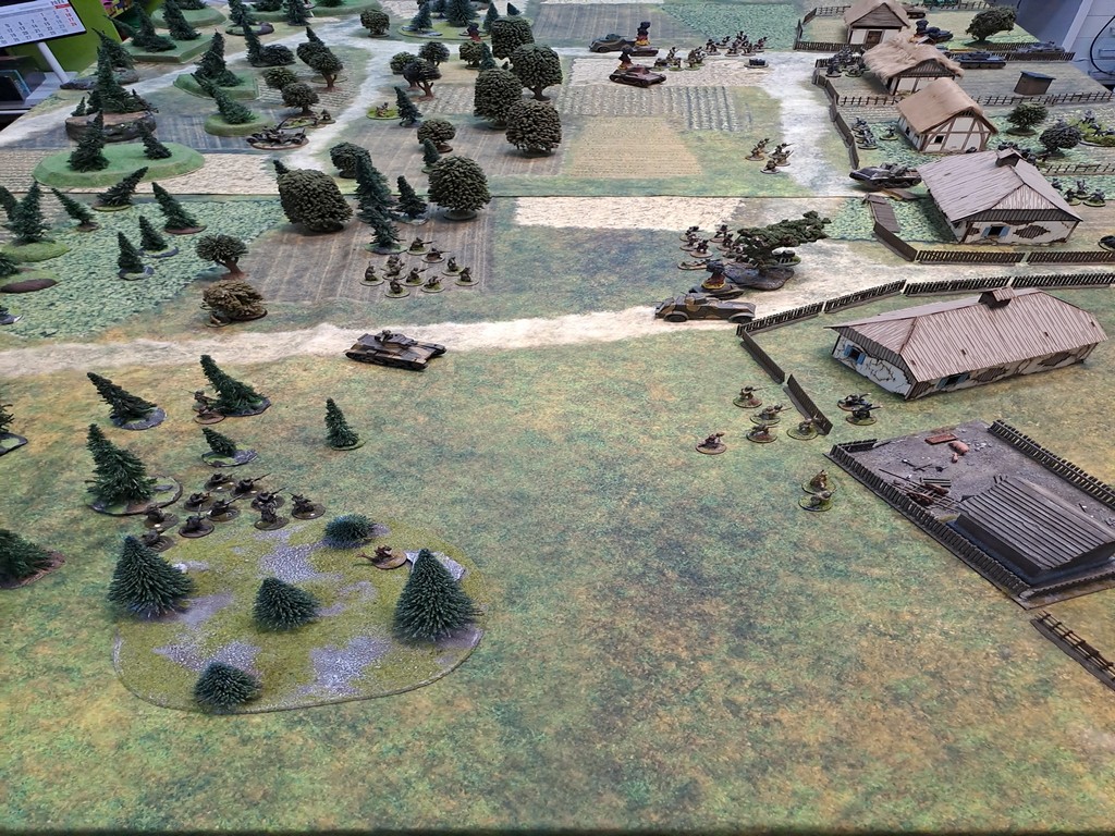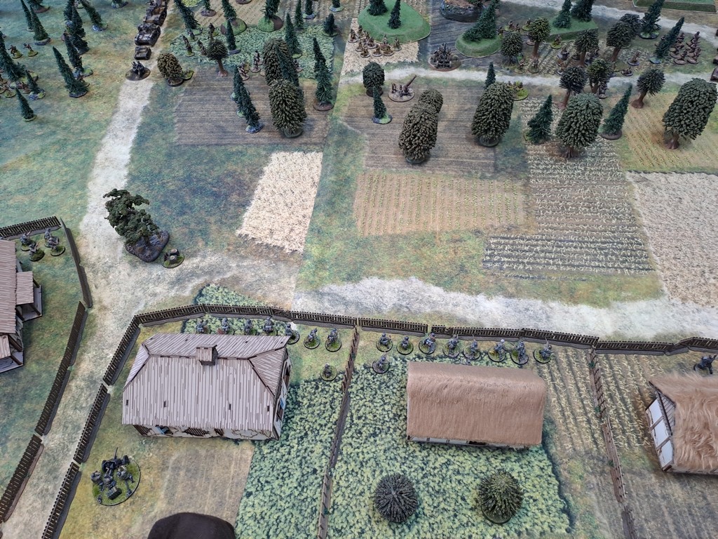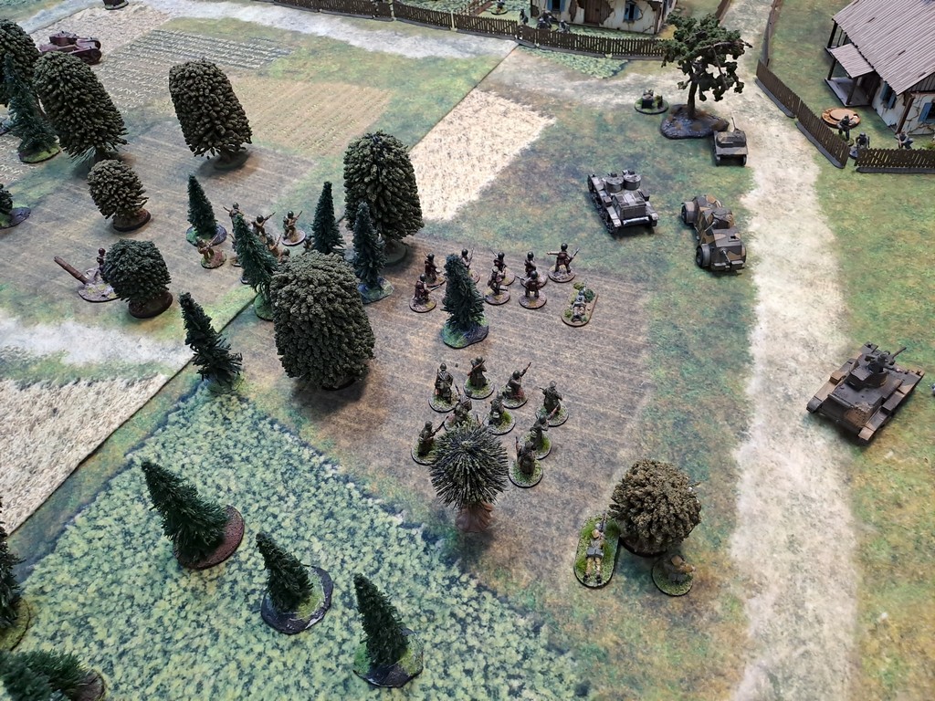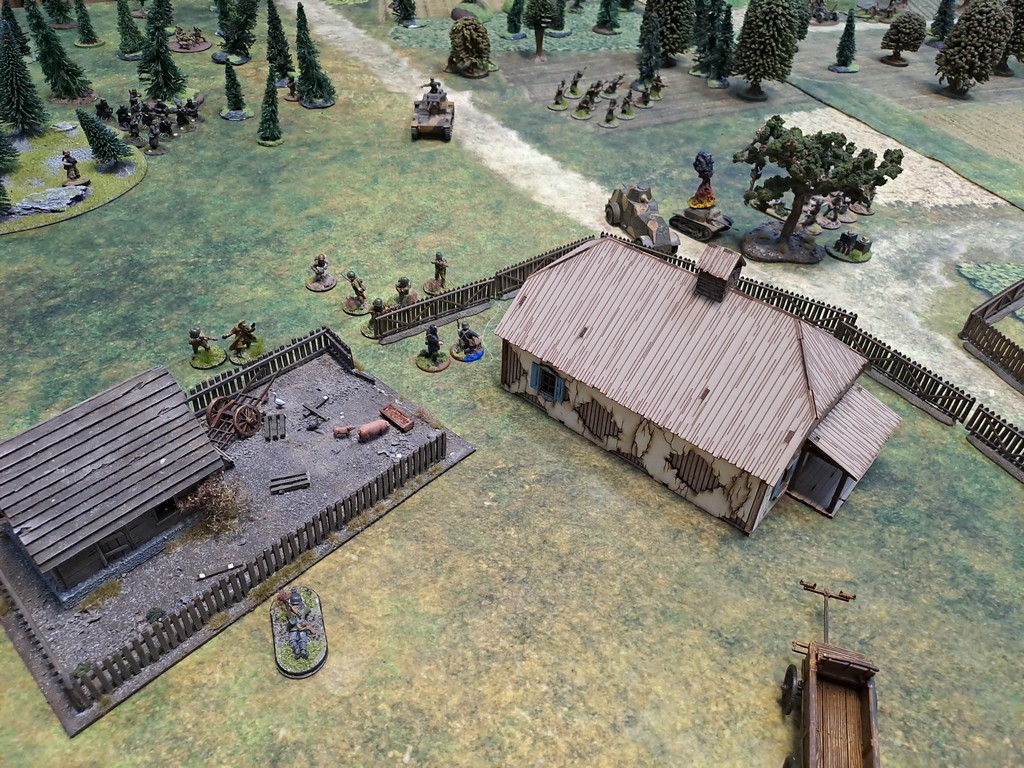 Naszą potyczkę, jako fragment większego starcia rozegraliśmy we wrocławskim klubie Bolter, po stronie radzieckiej stanąłem osobiście, wystawiając dwa plutony – pancerny i piechoty, po drugiej stronie stanął Cornholio z Danielem wystawiając wzmocnione plutony piechoty wsparte przez niezawodne działa pancerne Sturmioraz liczne fortyfikacje. By trzymać się realiów każdy pluton miał swoją połowę stołu w trakcie wystawiania – po mojej stronie pluton piechoty z wsparciem zwiadu szturmował wioskę, a pluton pancerny prawe skrzydło. Po drugiej stronie Daniel zajął prawe skrzydło z bunkrem, a Cornholio lewe skrzydło.