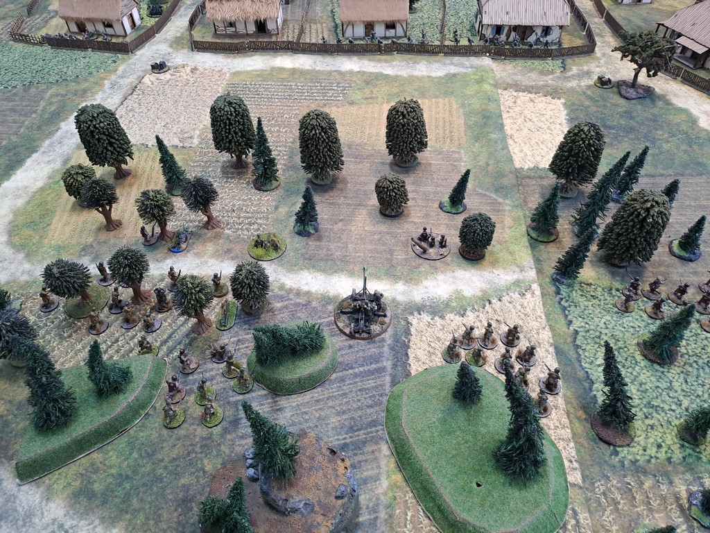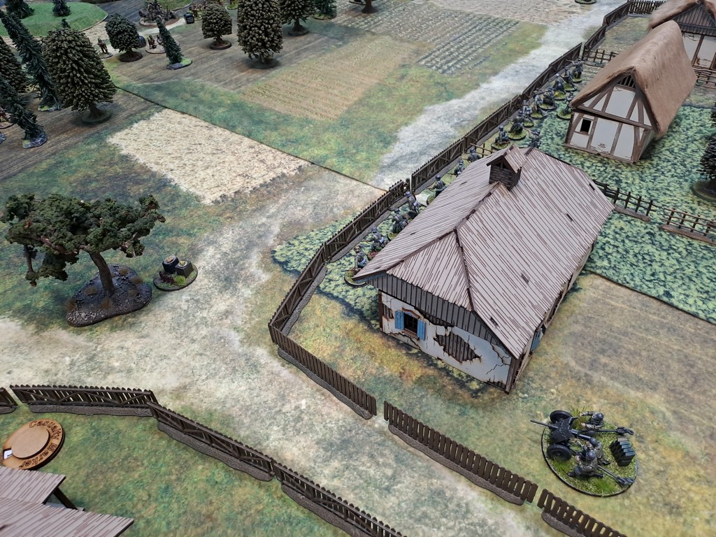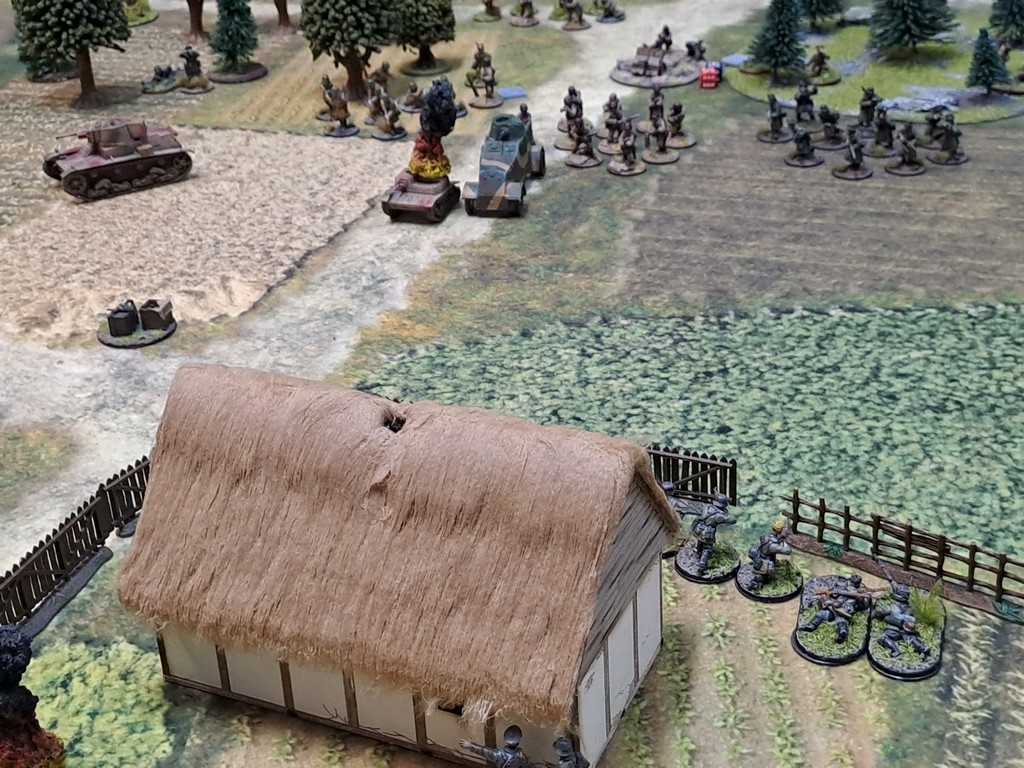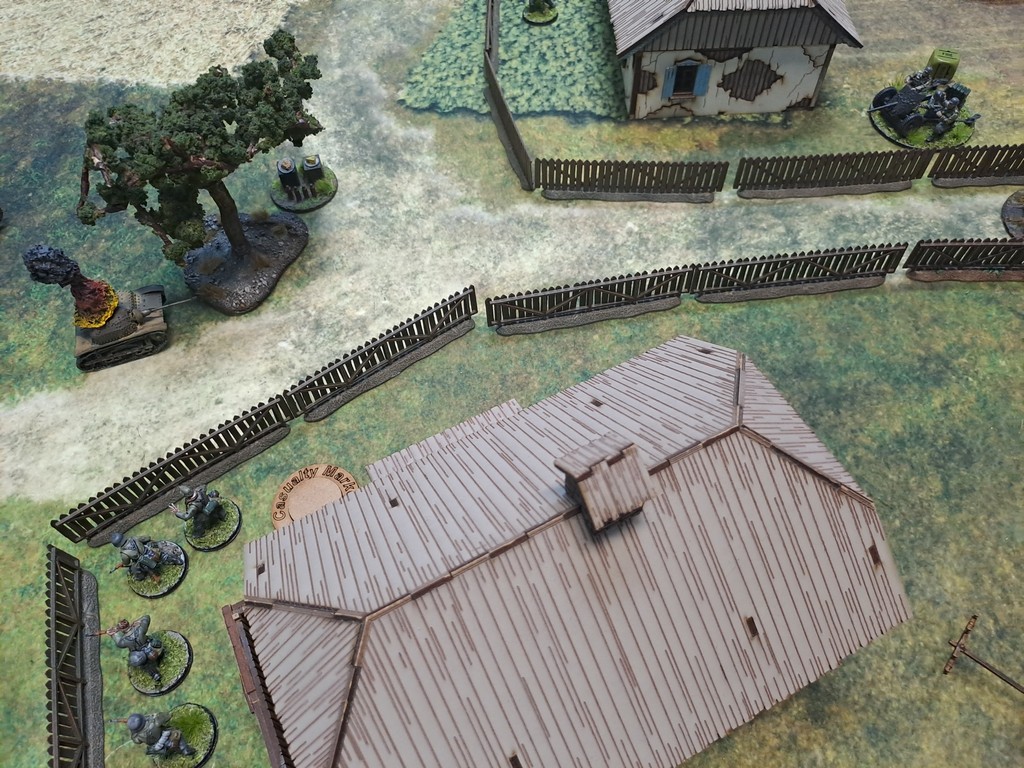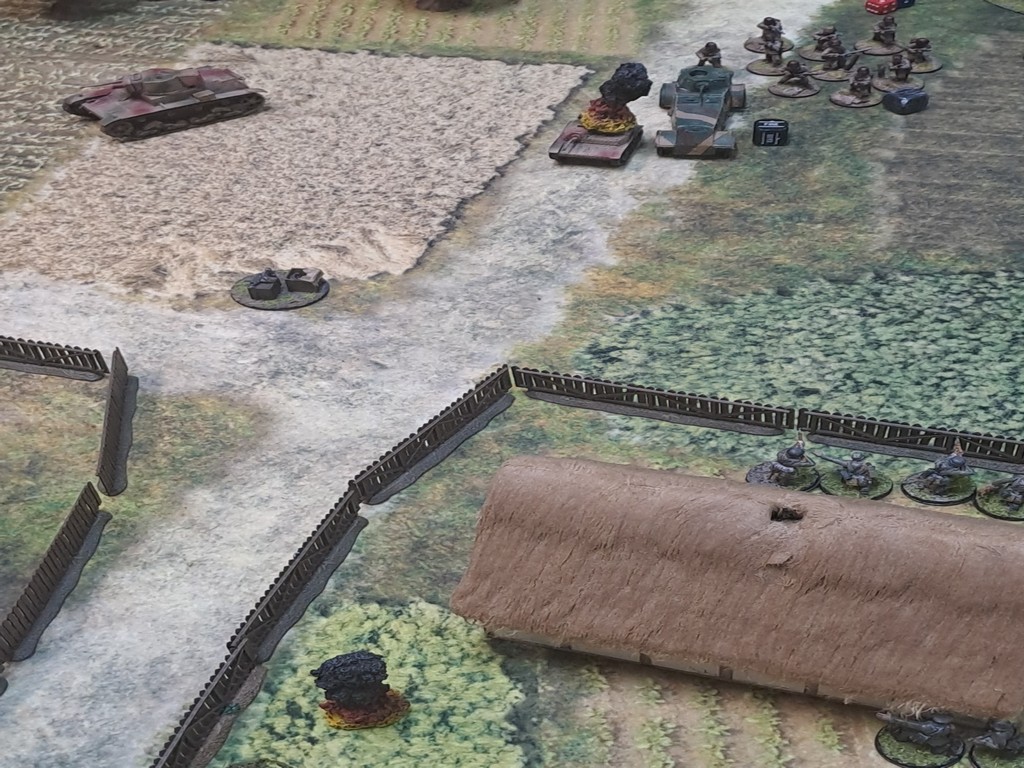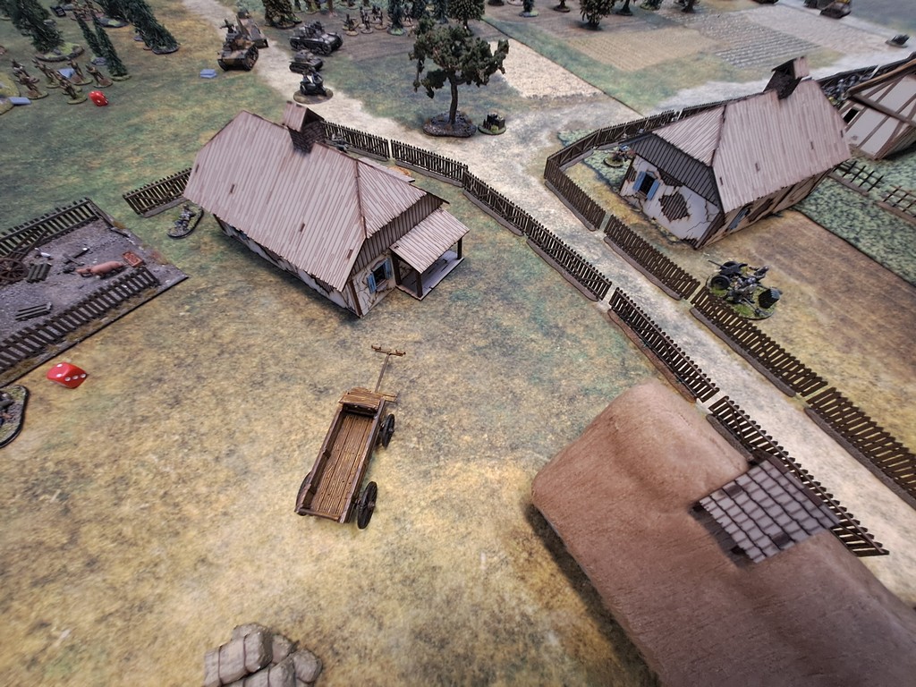 Naszą potyczkę, jako fragment większego starcia rozegraliśmy we wrocławskim klubie Bolter, po stronie radzieckiej stanąłem osobiście, wystawiając dwa plutony – pancerny i piechoty, po drugiej stronie stanął Cornholio z Danielem wystawiając wzmocnione plutony piechoty wsparte przez niezawodne działa pancerne Sturmioraz liczne fortyfikacje. By trzymać się realiów każdy pluton miał swoją połowę stołu w trakcie wystawiania – po mojej stronie pluton piechoty z wsparciem zwiadu szturmował wioskę, a pluton pancerny prawe skrzydło. Po drugiej stronie Daniel zajął prawe skrzydło z bunkrem, a Cornholio lewe skrzydło.
