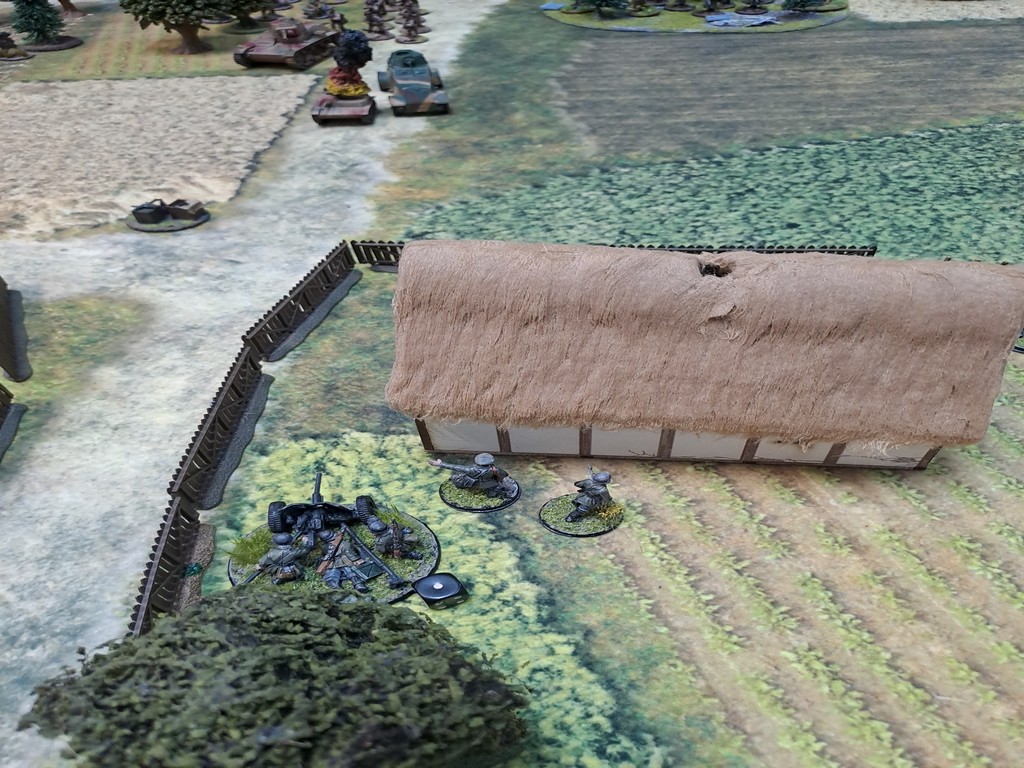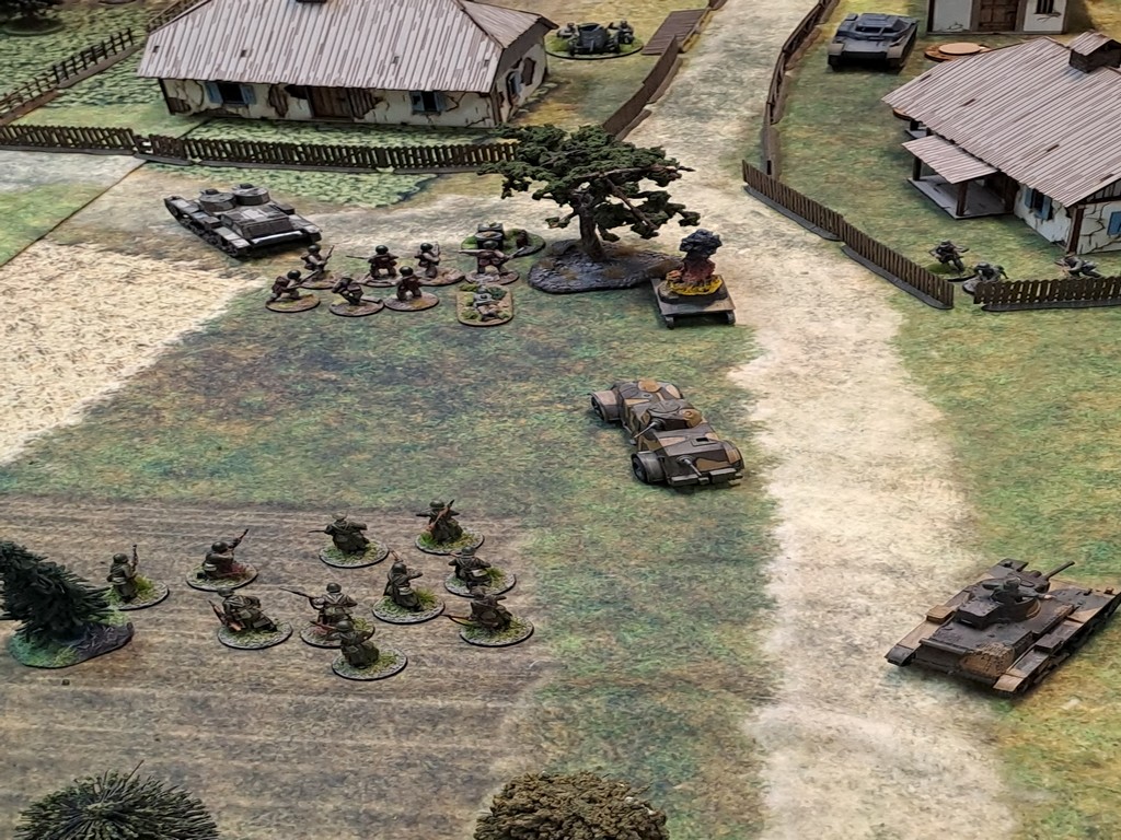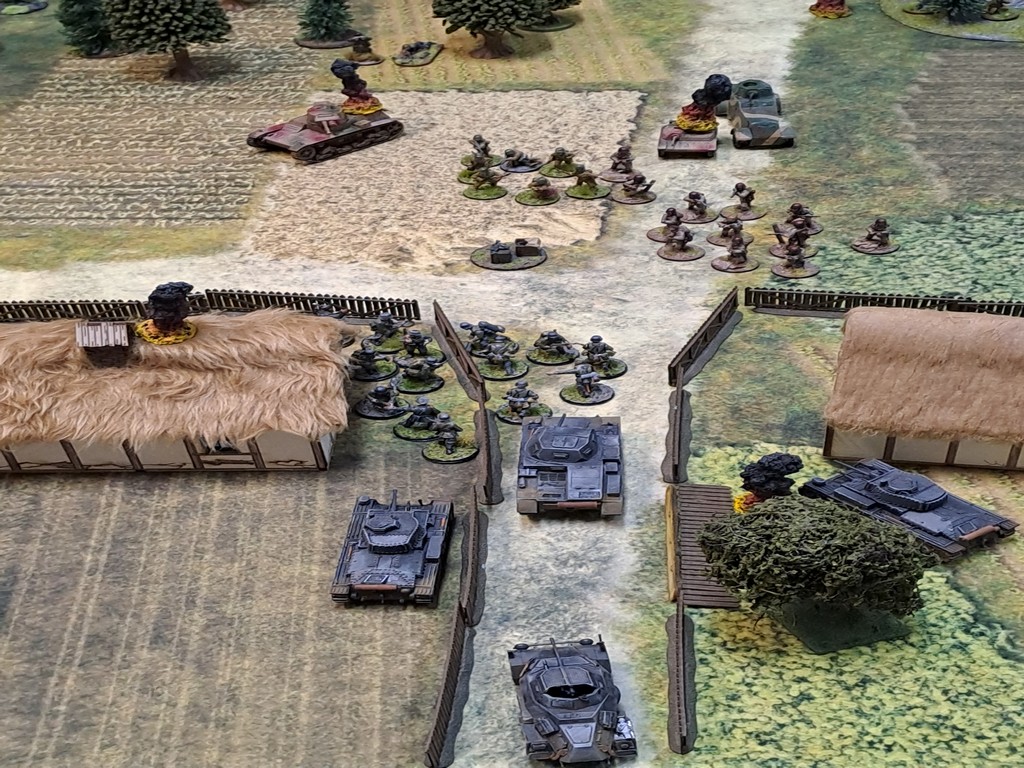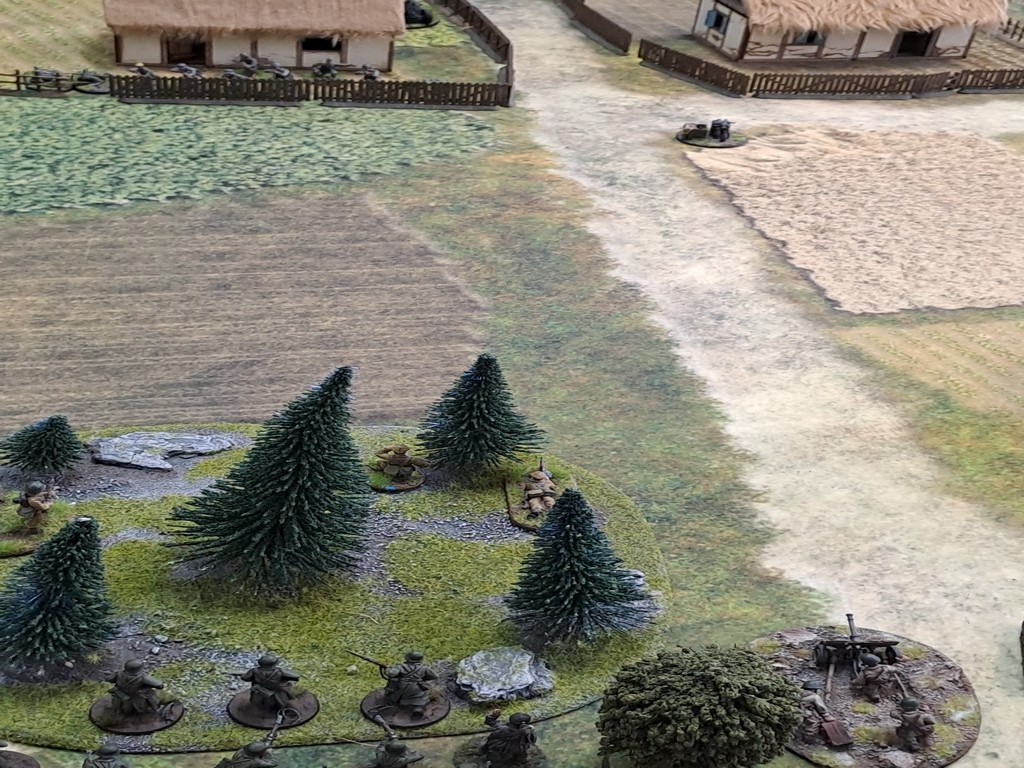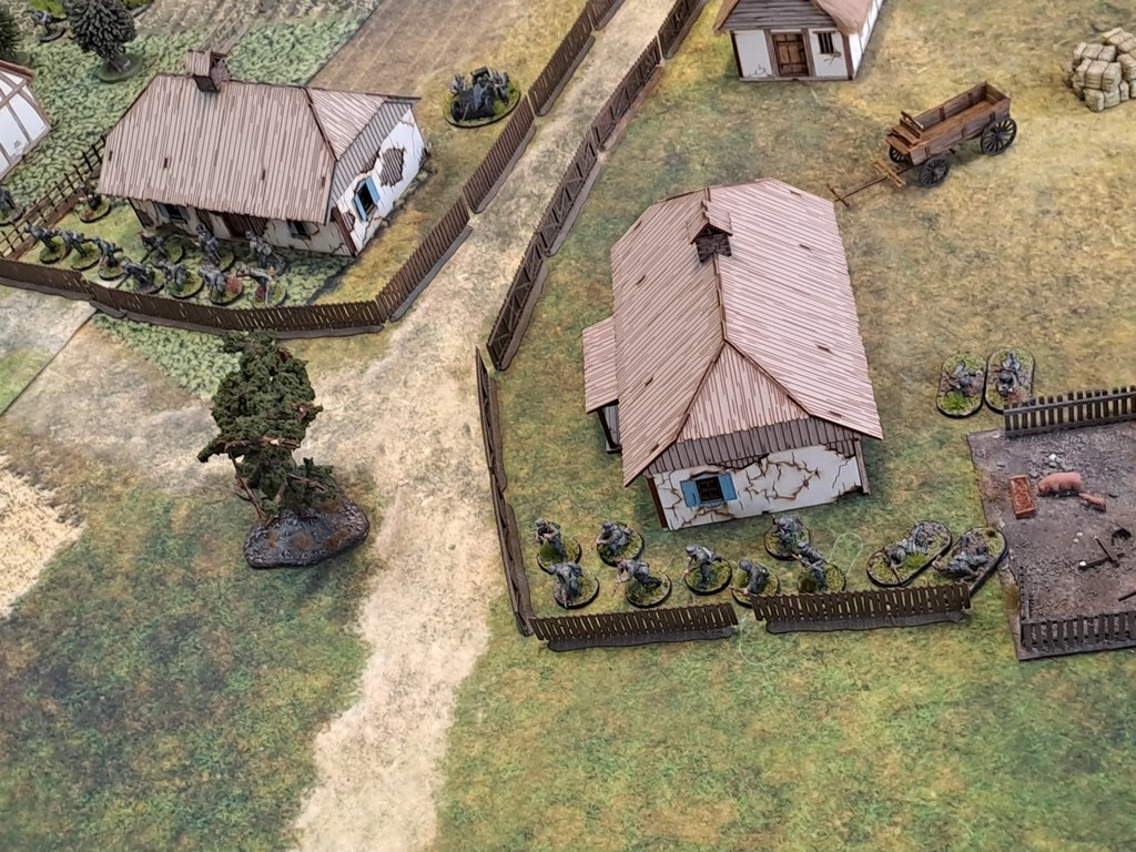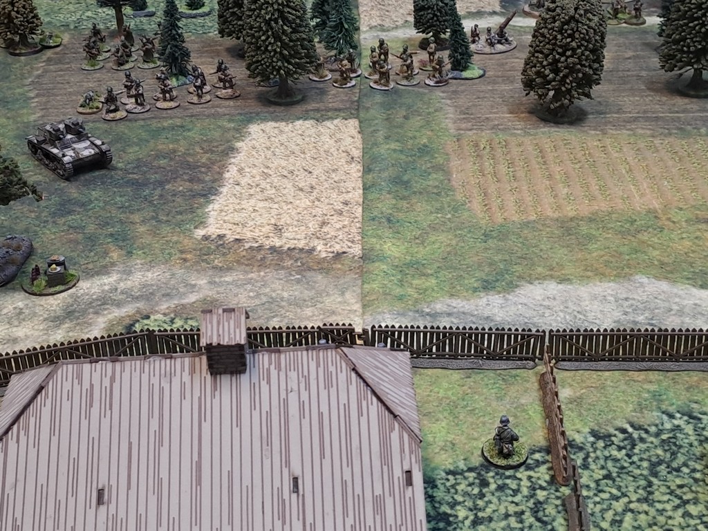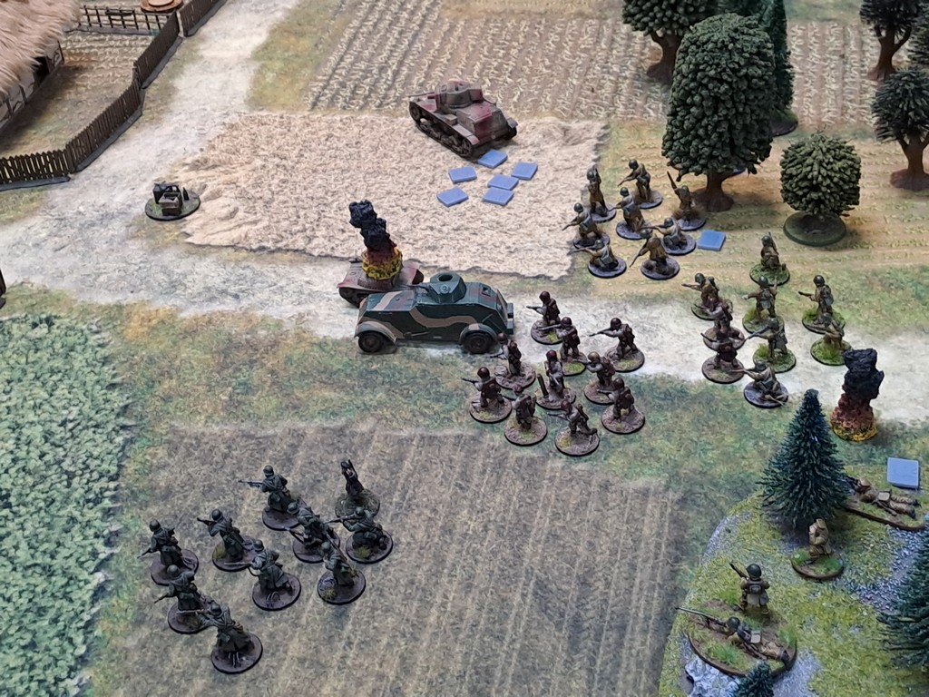 Naszą potyczkę, jako fragment większego starcia rozegraliśmy we wrocławskim klubie Bolter, po stronie radzieckiej stanąłem osobiście, wystawiając dwa plutony – pancerny i piechoty, po drugiej stronie stanął Cornholio z Danielem wystawiając wzmocnione plutony piechoty wsparte przez niezawodne działa pancerne Sturmioraz liczne fortyfikacje. By trzymać się realiów każdy pluton miał swoją połowę stołu w trakcie wystawiania – po mojej stronie pluton piechoty z wsparciem zwiadu szturmował wioskę, a pluton pancerny prawe skrzydło. Po drugiej stronie Daniel zajął prawe skrzydło z bunkrem, a Cornholio lewe skrzydło.