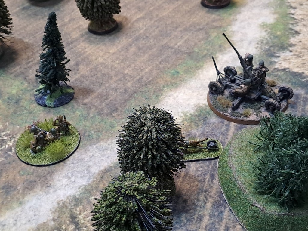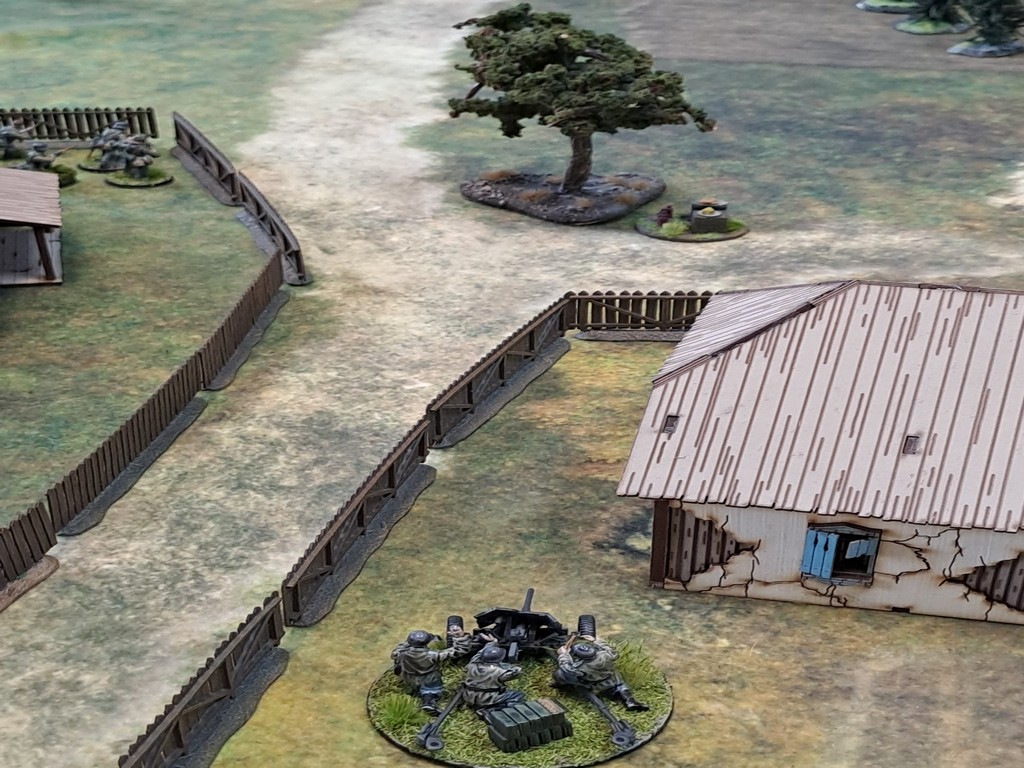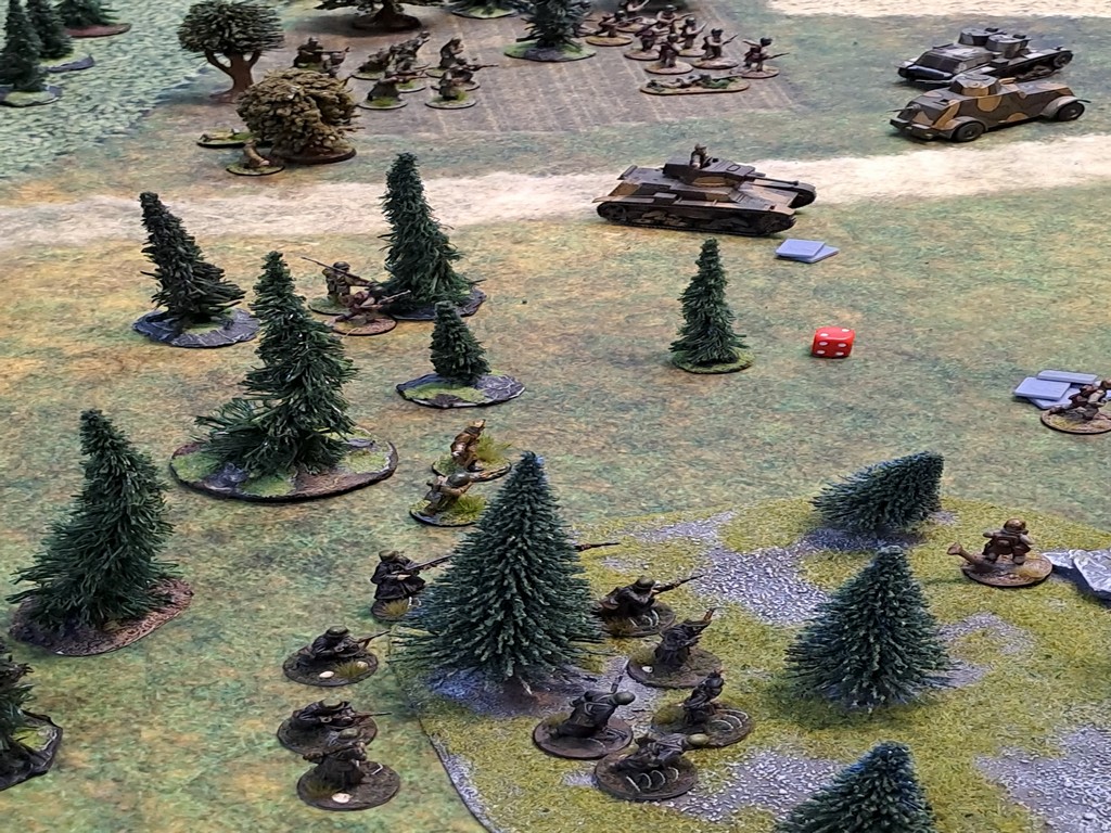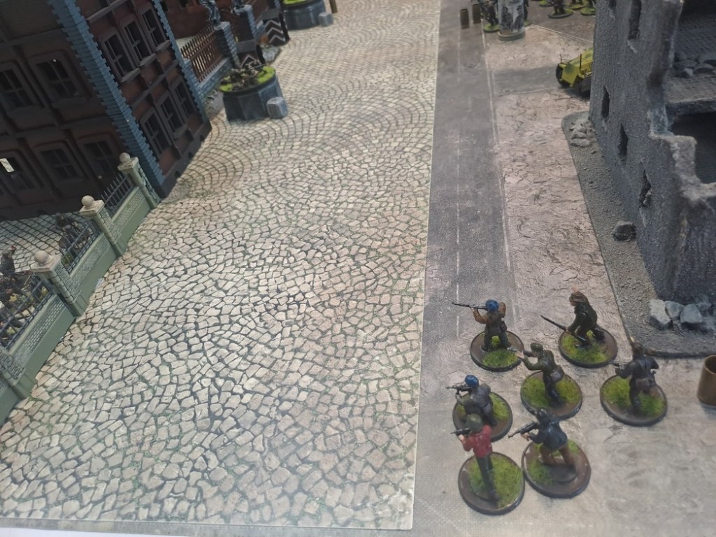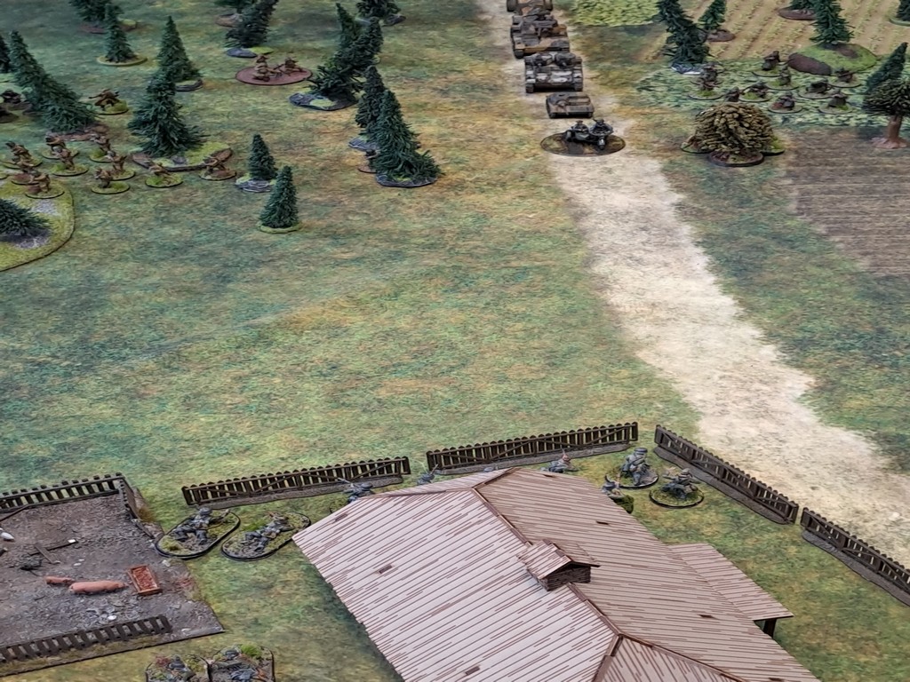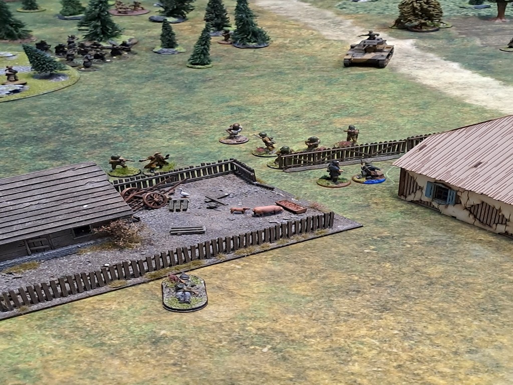 Naszą potyczkę, jako fragment większego starcia rozegraliśmy we wrocławskim klubie Bolter, po stronie radzieckiej stanąłem osobiście, wystawiając dwa plutony – pancerny i piechoty, po drugiej stronie stanął Cornholio z Danielem wystawiając wzmocnione plutony piechoty wsparte przez niezawodne działa pancerne Sturmioraz liczne fortyfikacje. By trzymać się realiów każdy pluton miał swoją połowę stołu w trakcie wystawiania – po mojej stronie pluton piechoty z wsparciem zwiadu szturmował wioskę, a pluton pancerny prawe skrzydło. Po drugiej stronie Daniel zajął prawe skrzydło z bunkrem, a Cornholio lewe skrzydło.