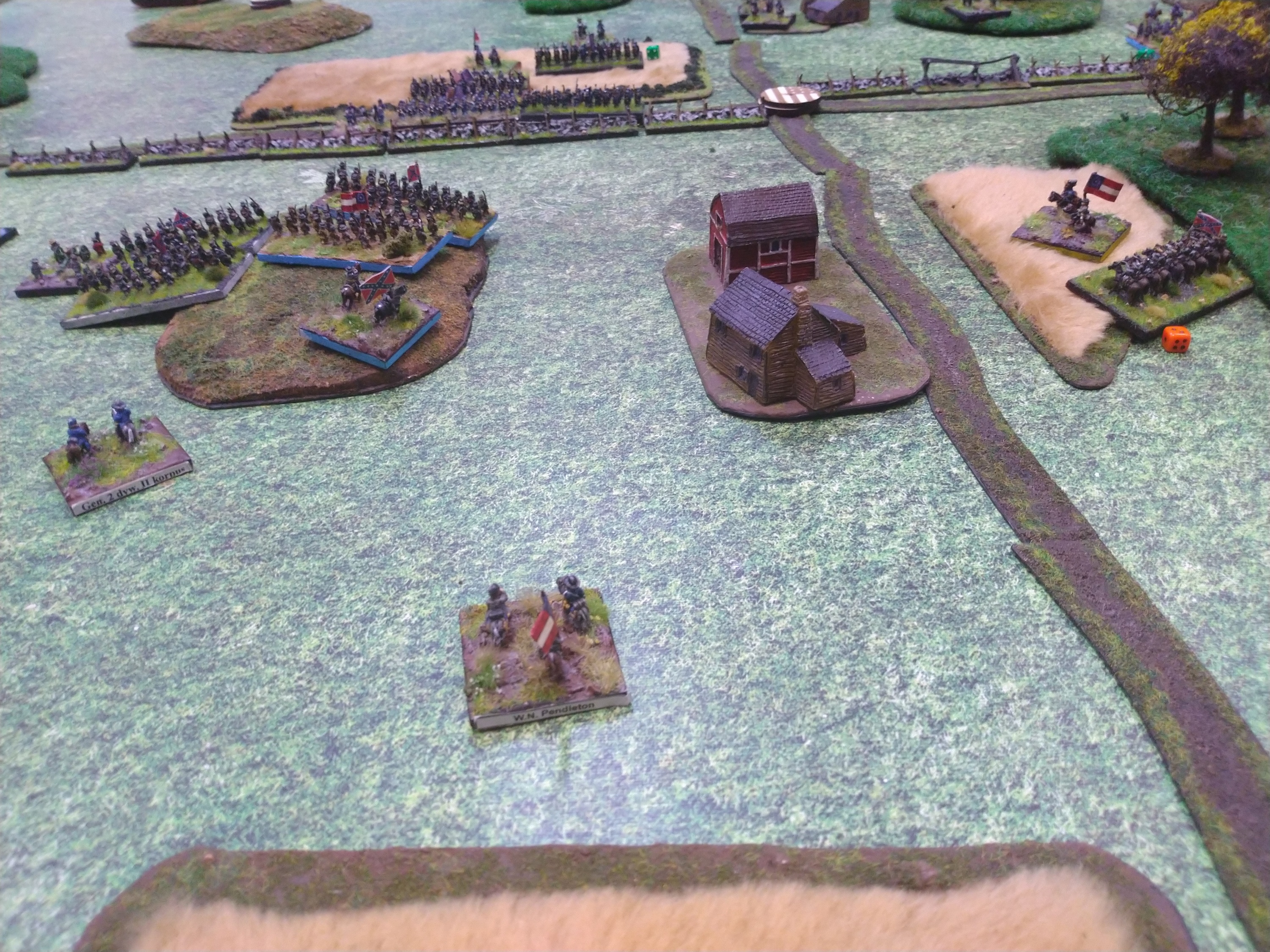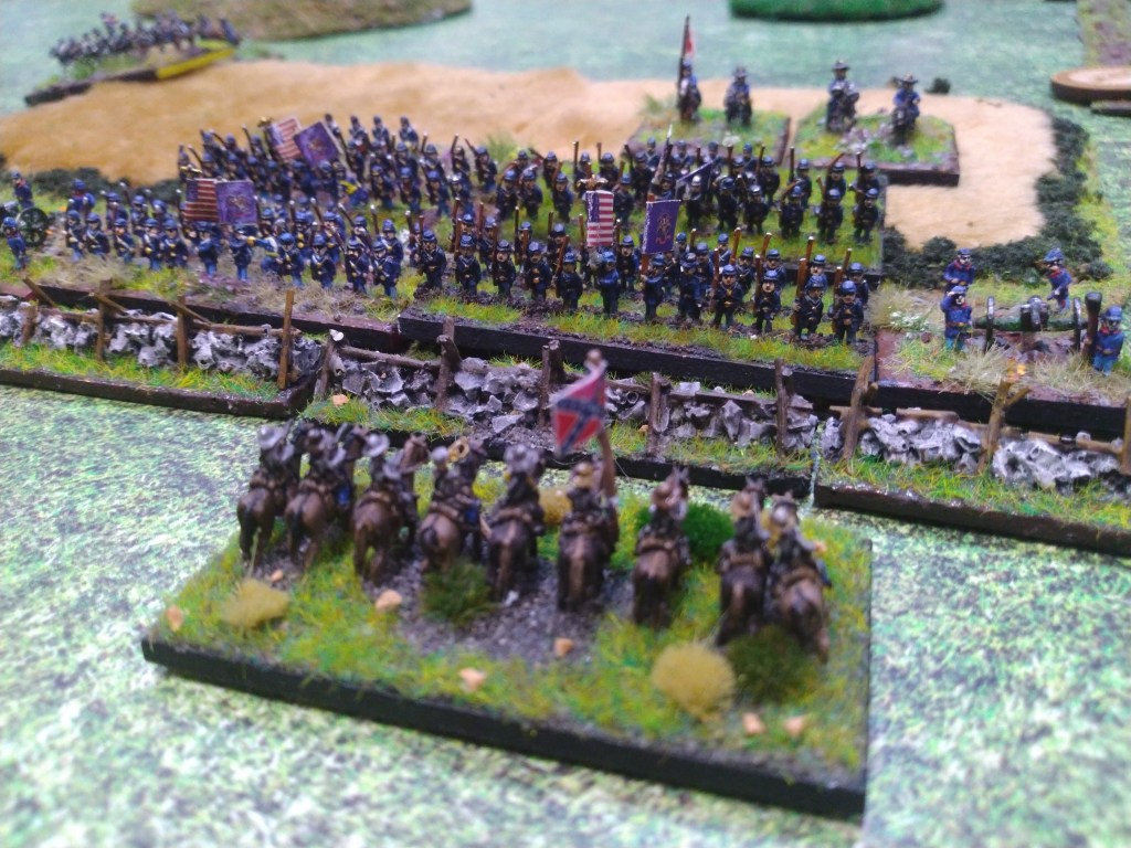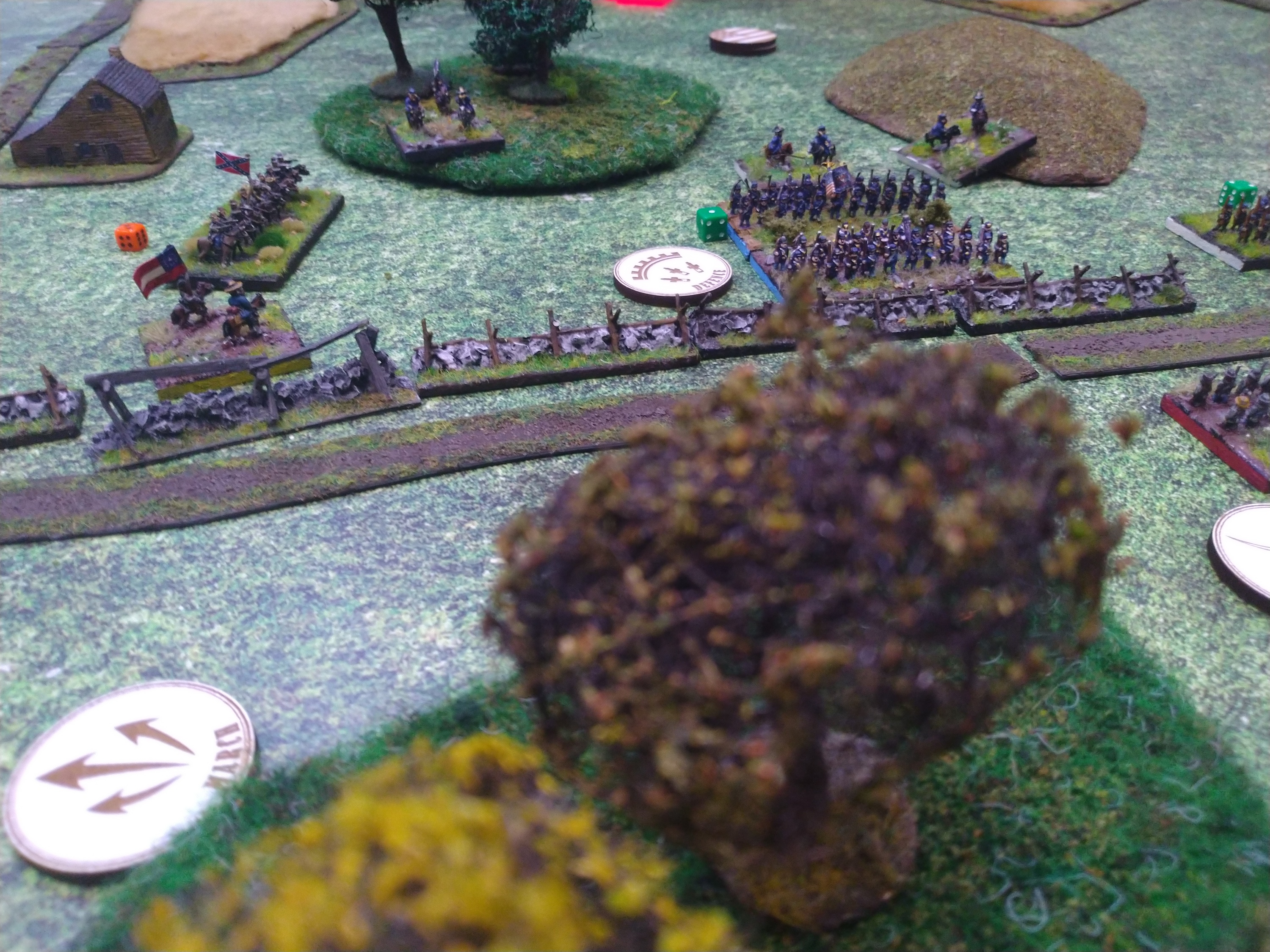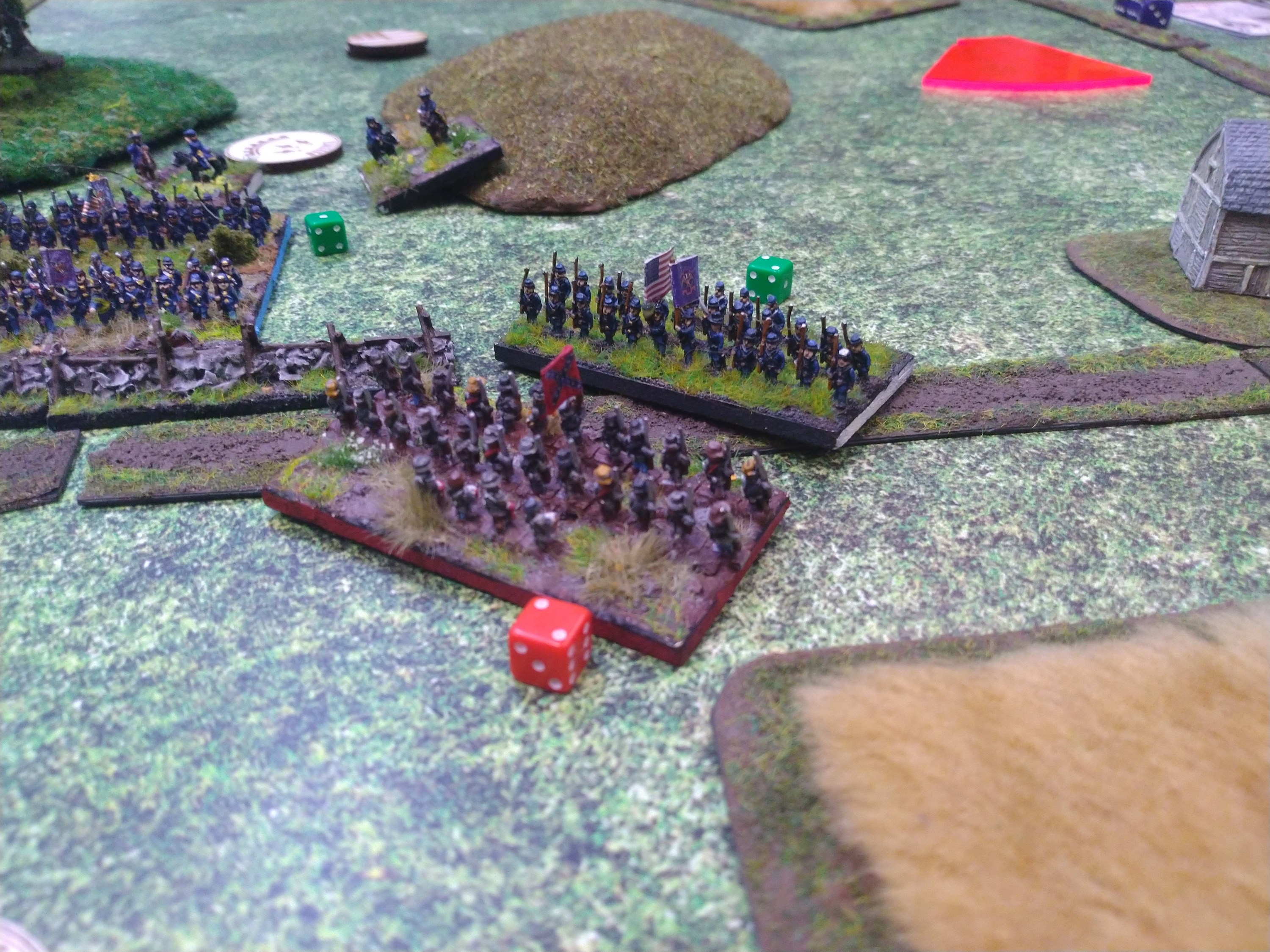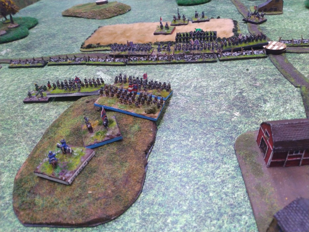 Patrol markers ahead of main force. Patrole prowadzą rozpoznanie przed siłami głównymi.Patrol marker – under this one was army corps. Znacznik patrolu – pod tym krył się jeden korpus armijny.Patrol markers look on each other from distance. Znacznik patrolu patrzy na inny znacznik z dystansu.Generals should be in appropriate range from army corps generals. Generałowie powinni być w odpowiednim zasięgu od dowódców korpusów armijnych.Union advance on right flank. Unia w natarciu na prawym skrzydle.Confederate cavalry, around 1,500 men hidden in the shadow of threes. Kawaleria Konfederacji, około 1,500 ludzi kryje się w cieniu drzew.Union infantry took position behind wall. Piechota Unii zajęła pozycję za murem.Right flank and the centre. Prawe skrzydło i centrum.Confederate infantry and artillery advances. Piechota i artyleria Konfederacji zajmuje pozycje.Army corps HQ. Sztab korpusu armijnego.Confederate infantry taking hill. Piechota Konfederacji zajmuje wzgórze.Right flank of Confederate army. Prawe skrzydło armii Konfederatów.Hill was taken. Wzgórze zostało zajęte.Union infantry take cover behind solid wall. Piechota Unii zajmuje pozycje obronne za solidnym murem.Cavalry brigade general don’t understand orders and in fact charged on defending Union infantry. Dowdódca brygady kawalerii nie zrozumiał rozkazu i zaszarżował na broniącą się piechotę Unii.Cavalry retreat. Kawaleria wycofała się.Confederate infantry advanced, shoot and then assault on bayonnets. Piechota Konfederacji podeszła, strzeliła po czym uderzyła na bagnety.Union cavalry outflanked Confederate infantry. Kawaleria Unii oskrzydliła piechotę Konfederacji.One brigade of Confederates took guns and prepared for Union cavalry. Jedna brygada Konfederatów wzięła armaty i przygotowała się na kawalerię Unii.One brigade of Union and one of Confederates were lost. Jedna brygada Unii i jedna Konfederacji zostały stracone.Confederate cavalry rallied. Kawaleria Konfederacji zebrała się.Then galloped on Union infantry flank. Po czym pogalopowała na skrzydło piechoty Unii.Confederate veterans charges on Union infantry. Weterani Konfederacji szarżują na piechotę Unii.Union cavalry repelled. Kawaleria Unii przepędzona.Both brigades broken. Obie brygady złamane.