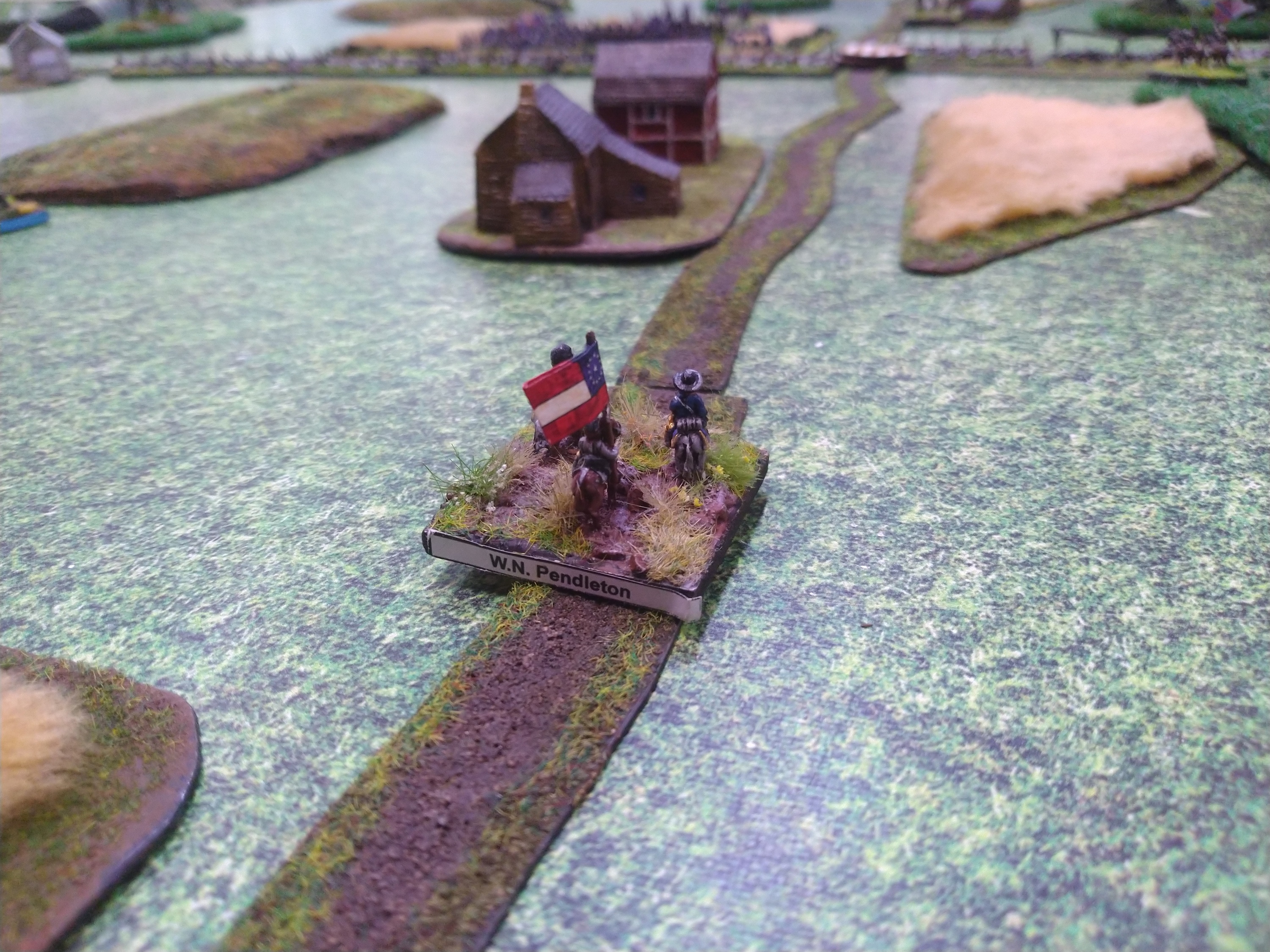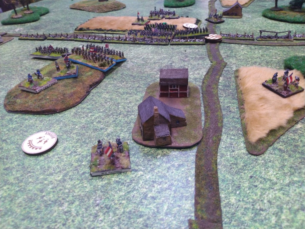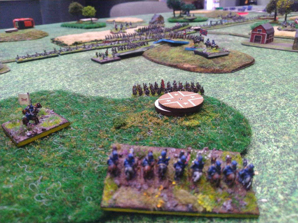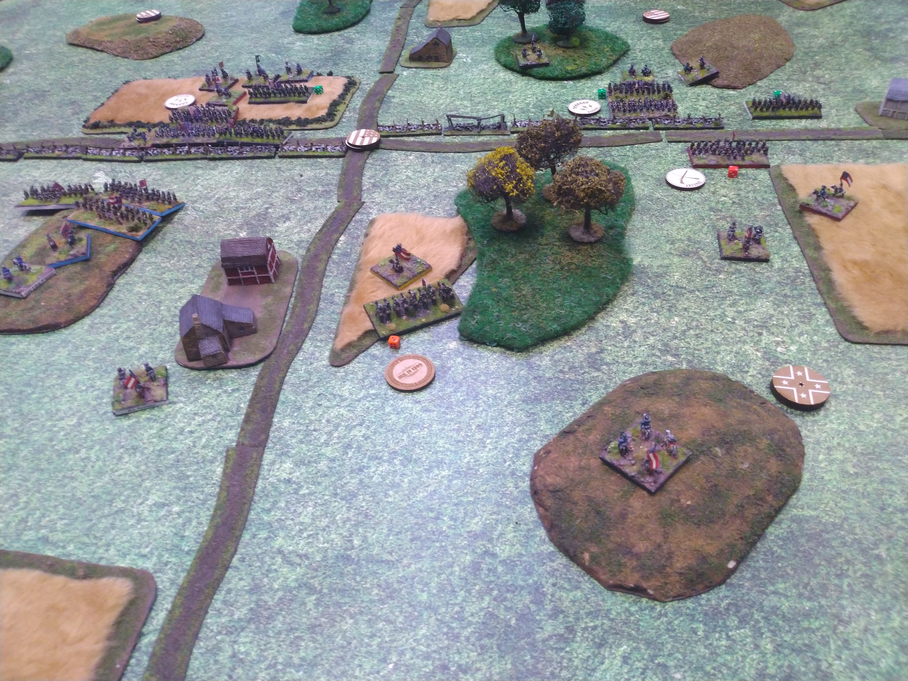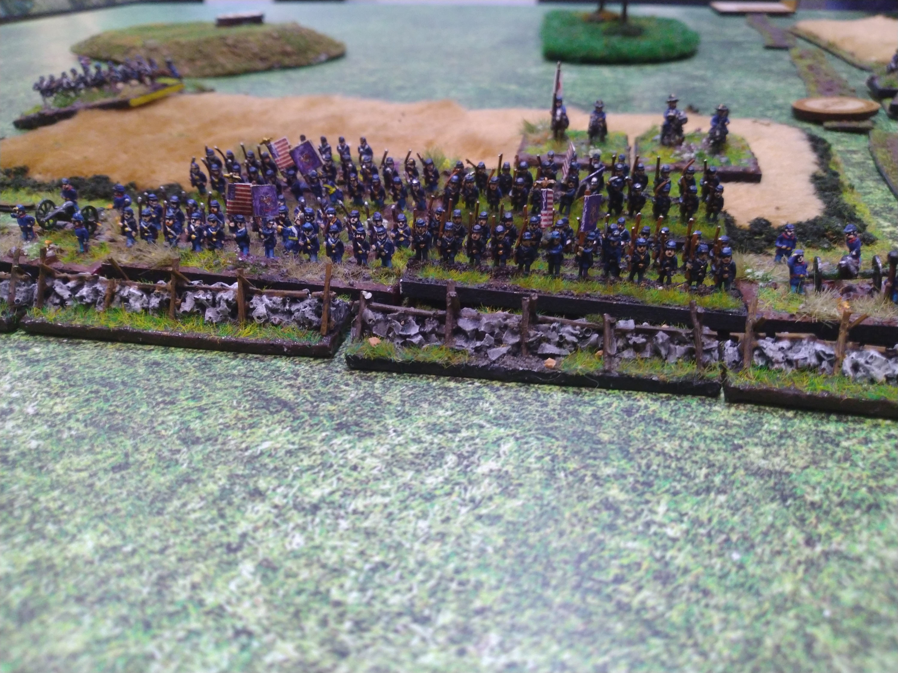 Patrol markers ahead of main force. Patrole prowadzą rozpoznanie przed siłami głównymi.Patrol marker – under this one was army corps. Znacznik patrolu – pod tym krył się jeden korpus armijny.Patrol markers look on each other from distance. Znacznik patrolu patrzy na inny znacznik z dystansu.Generals should be in appropriate range from army corps generals. Generałowie powinni być w odpowiednim zasięgu od dowódców korpusów armijnych.Union advance on right flank. Unia w natarciu na prawym skrzydle.Confederate cavalry, around 1,500 men hidden in the shadow of threes. Kawaleria Konfederacji, około 1,500 ludzi kryje się w cieniu drzew.Union infantry took position behind wall. Piechota Unii zajęła pozycję za murem.Right flank and the centre. Prawe skrzydło i centrum.Confederate infantry and artillery advances. Piechota i artyleria Konfederacji zajmuje pozycje.Army corps HQ. Sztab korpusu armijnego.Confederate infantry taking hill. Piechota Konfederacji zajmuje wzgórze.Right flank of Confederate army. Prawe skrzydło armii Konfederatów.Hill was taken. Wzgórze zostało zajęte.Union infantry take cover behind solid wall. Piechota Unii zajmuje pozycje obronne za solidnym murem.Cavalry brigade general don’t understand orders and in fact charged on defending Union infantry. Dowdódca brygady kawalerii nie zrozumiał rozkazu i zaszarżował na broniącą się piechotę Unii.Cavalry retreat. Kawaleria wycofała się.Confederate infantry advanced, shoot and then assault on bayonnets. Piechota Konfederacji podeszła, strzeliła po czym uderzyła na bagnety.Union cavalry outflanked Confederate infantry. Kawaleria Unii oskrzydliła piechotę Konfederacji.One brigade of Confederates took guns and prepared for Union cavalry. Jedna brygada Konfederatów wzięła armaty i przygotowała się na kawalerię Unii.One brigade of Union and one of Confederates were lost. Jedna brygada Unii i jedna Konfederacji zostały stracone.Confederate cavalry rallied. Kawaleria Konfederacji zebrała się.Then galloped on Union infantry flank. Po czym pogalopowała na skrzydło piechoty Unii.Confederate veterans charges on Union infantry. Weterani Konfederacji szarżują na piechotę Unii.Union cavalry repelled. Kawaleria Unii przepędzona.Both brigades broken. Obie brygady złamane.