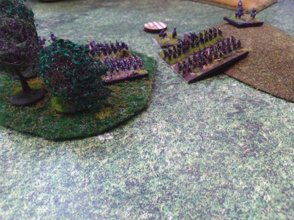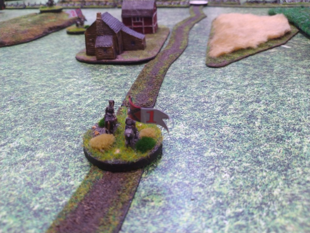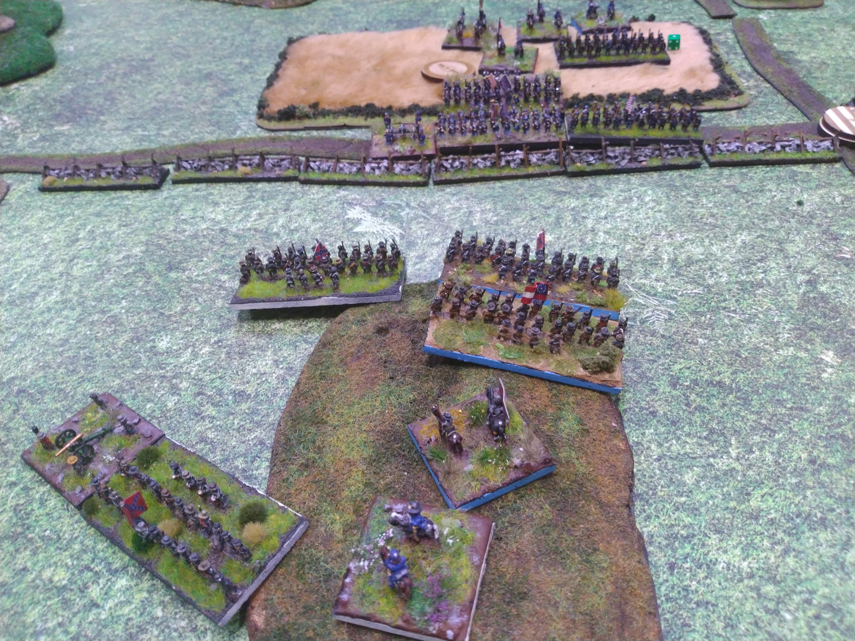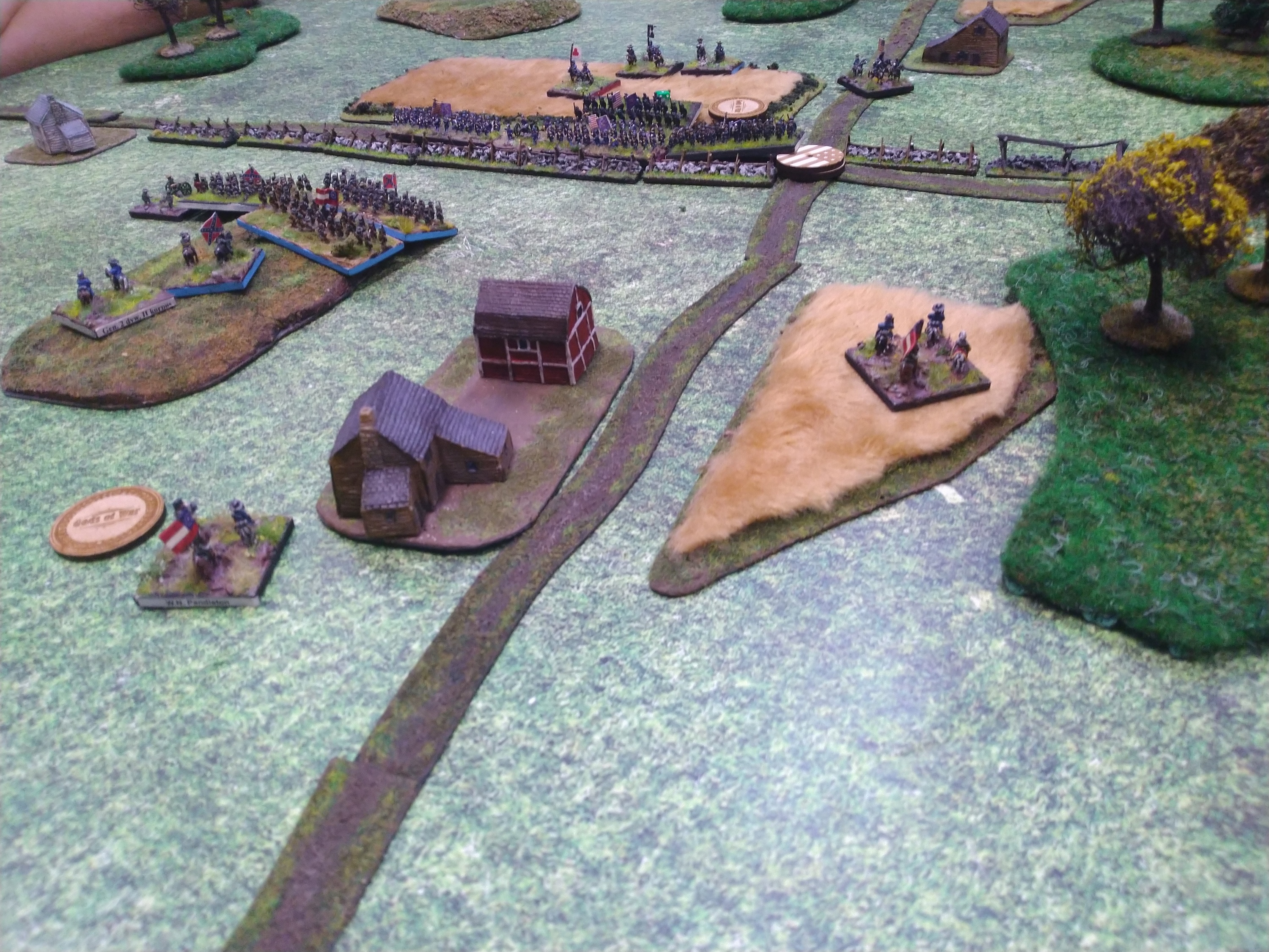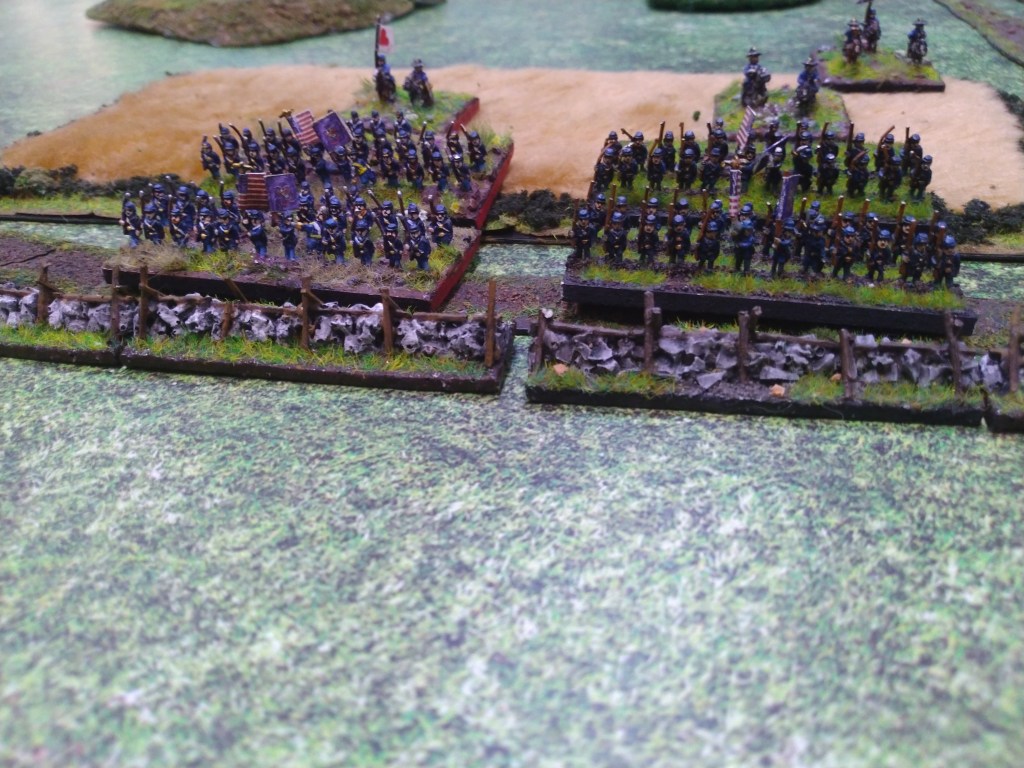 Patrol markers ahead of main force. Patrole prowadzą rozpoznanie przed siłami głównymi.Patrol marker – under this one was army corps. Znacznik patrolu – pod tym krył się jeden korpus armijny.Patrol markers look on each other from distance. Znacznik patrolu patrzy na inny znacznik z dystansu.Generals should be in appropriate range from army corps generals. Generałowie powinni być w odpowiednim zasięgu od dowódców korpusów armijnych.Union advance on right flank. Unia w natarciu na prawym skrzydle.Confederate cavalry, around 1,500 men hidden in the shadow of threes. Kawaleria Konfederacji, około 1,500 ludzi kryje się w cieniu drzew.Union infantry took position behind wall. Piechota Unii zajęła pozycję za murem.Right flank and the centre. Prawe skrzydło i centrum.Confederate infantry and artillery advances. Piechota i artyleria Konfederacji zajmuje pozycje.Army corps HQ. Sztab korpusu armijnego.Confederate infantry taking hill. Piechota Konfederacji zajmuje wzgórze.Right flank of Confederate army. Prawe skrzydło armii Konfederatów.Hill was taken. Wzgórze zostało zajęte.Union infantry take cover behind solid wall. Piechota Unii zajmuje pozycje obronne za solidnym murem.Cavalry brigade general don’t understand orders and in fact charged on defending Union infantry. Dowdódca brygady kawalerii nie zrozumiał rozkazu i zaszarżował na broniącą się piechotę Unii.Cavalry retreat. Kawaleria wycofała się.Confederate infantry advanced, shoot and then assault on bayonnets. Piechota Konfederacji podeszła, strzeliła po czym uderzyła na bagnety.Union cavalry outflanked Confederate infantry. Kawaleria Unii oskrzydliła piechotę Konfederacji.One brigade of Confederates took guns and prepared for Union cavalry. Jedna brygada Konfederatów wzięła armaty i przygotowała się na kawalerię Unii.One brigade of Union and one of Confederates were lost. Jedna brygada Unii i jedna Konfederacji zostały stracone.Confederate cavalry rallied. Kawaleria Konfederacji zebrała się.Then galloped on Union infantry flank. Po czym pogalopowała na skrzydło piechoty Unii.Confederate veterans charges on Union infantry. Weterani Konfederacji szarżują na piechotę Unii.Union cavalry repelled. Kawaleria Unii przepędzona.Both brigades broken. Obie brygady złamane.