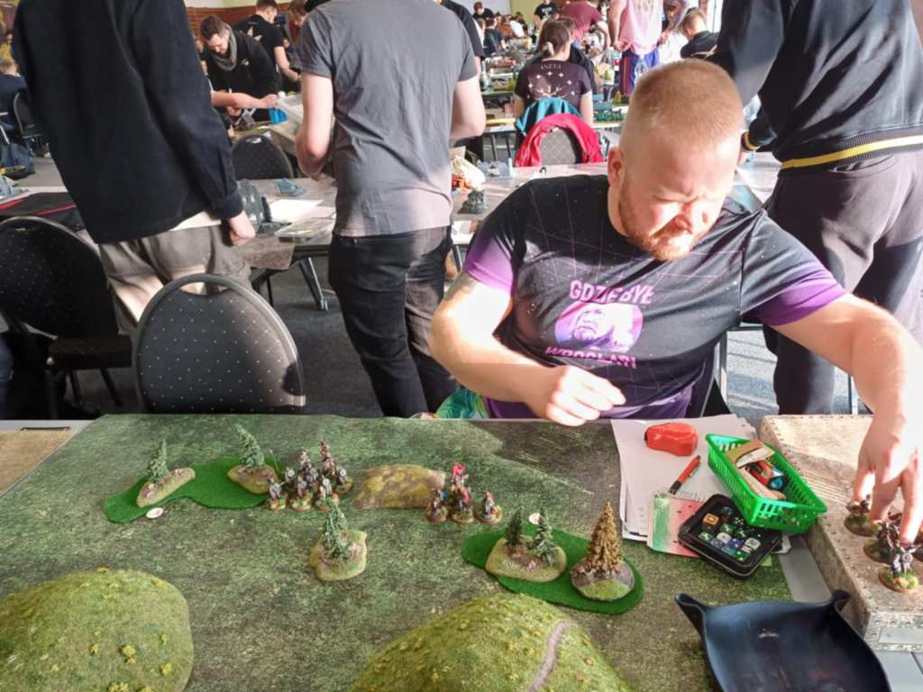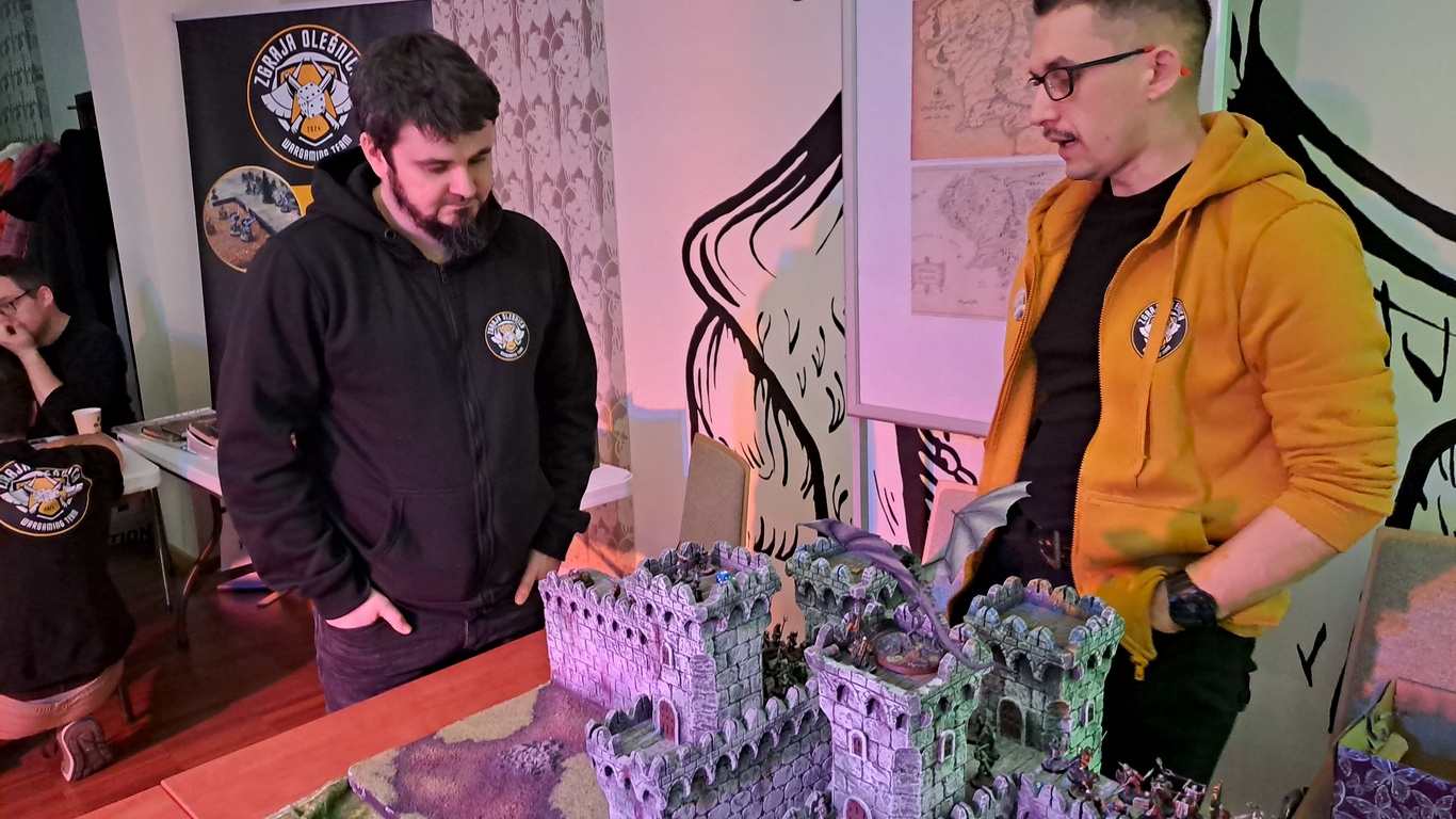 Where was Wrocław? Where wasn’t it? It was in Oleśnica—we went as a group of four to promote the game system we play. It reminded me of the trip to Bielsko-Biała, where the same team participated together as part of GBW. Our crew—Cornholio, Franek, Mr.6, and my humble self—set up two demo tables and one eye-catching piece of the Pelennor Fields. On top of that, Dardzin brought his beautifully painted Rohan army. To promote the game we play, Cornholio, with the help of Asia, brought flyers from Wrocław’s Bolter, the club where we play and teach games like Middle-earth: SBG and other systems like Gods of War: Togo or Bolt Action. There were all kinds of questions—about 3D printing , or about the cost of paints for miniatures—and a few demo games were played, which made us very happy.