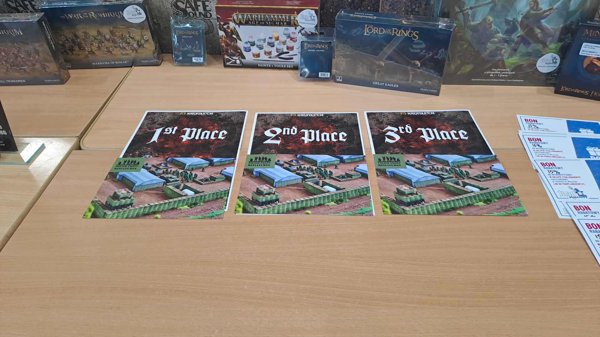 Dość niespodziewanie. W samochodzie jak jechaliśmy na ten turniej mówiłem chłopakom że może i turnieju nie wygram ale będę miał fun z grania Nekromantą. Miałem trochę dość grania oklepanych schematów i „wałek na wałek” czyli armiami po 50 modeli gdzie tej kminy nie ma dużo. Po analizie potencjalnej mety na turnieju stwierdziłem że Nekromanta nieźle się w niej odnajdzie, do tego dobrałem orły które uważam za topową rozpiskę na 500 pkt. Podczas samego turnieju przeprawę określiłbym jako solidny marsz do przodu w bardzo dobrej atmosferze fair-play za co dziękuję przeciwnikom bo udało się rozegrać cały turniej bez nieprzyjemnych sytuacji czy „spin” a przy tym w fajnym sportowym zacięciu. Najcięższa była finałowa bitwa na Kisa, raz że wchodzi stres kiedy masz świadomość że grasz o tytuł. Dwa że matchup był ciężki – ja orłami vs skauty ugluka w To The Death gdzie sporo osób dookoła mówiło mi że to zły matchup, tym bardziej po tym jak przeciwnik wygrał stronę z 2 lasami w których się okopał. Zrobiłem swoiste mission impossible Gwaihirem który jako jedyny wszedł do lasu (reszty orłów nie chciałem puszczać ze względu na brak możliwości latania w lesie co skutkowałoby łatwym okrążeniem przez przeciwnika. Czekały więc zaraz przed dopingując Gwaihira i czekając na wyrzucane bargem z lasu uruki). W końcu Gwaihir się dokopał, zabił Ugluka i zacząłem palić wroty bo wynik (5:4) dawał mi już tytuł. Tak się też gra skończyła.