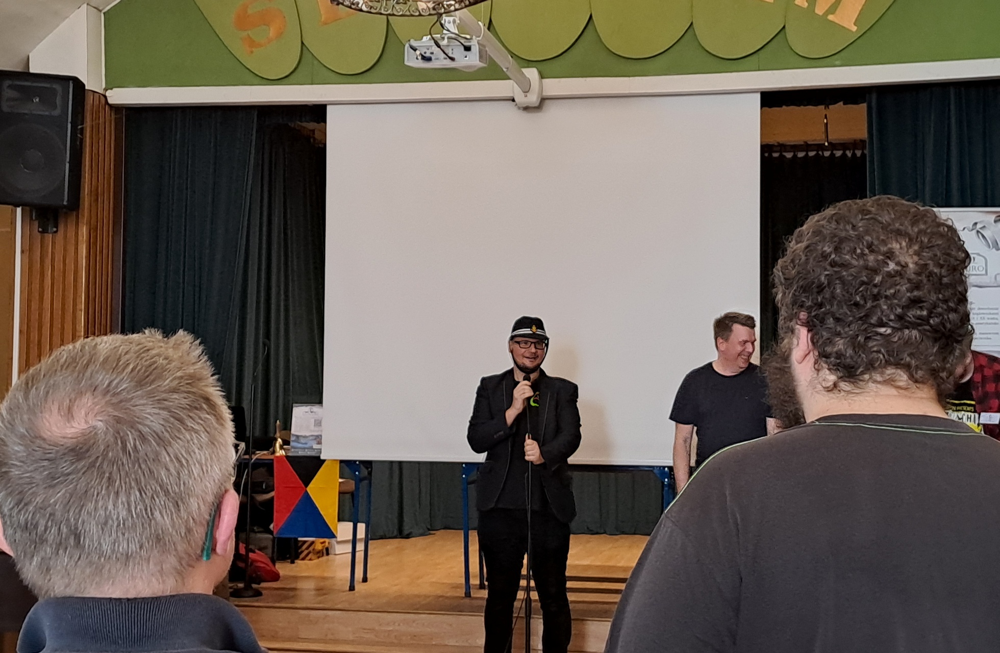 W piątkowe popołudnie zebraliśmy się w Bolterze, by załadować do samochodów blaty, maty i teren. Po przyjeździe na plac Biskupa Nankiera zabraliśmy się za przenoszenie wszystkiego do auli i przygotowanie sali. Po kilku godzinach pracy – i licznych przenosinach – sen dopadł mnie natychmiast po powrocie do domu.